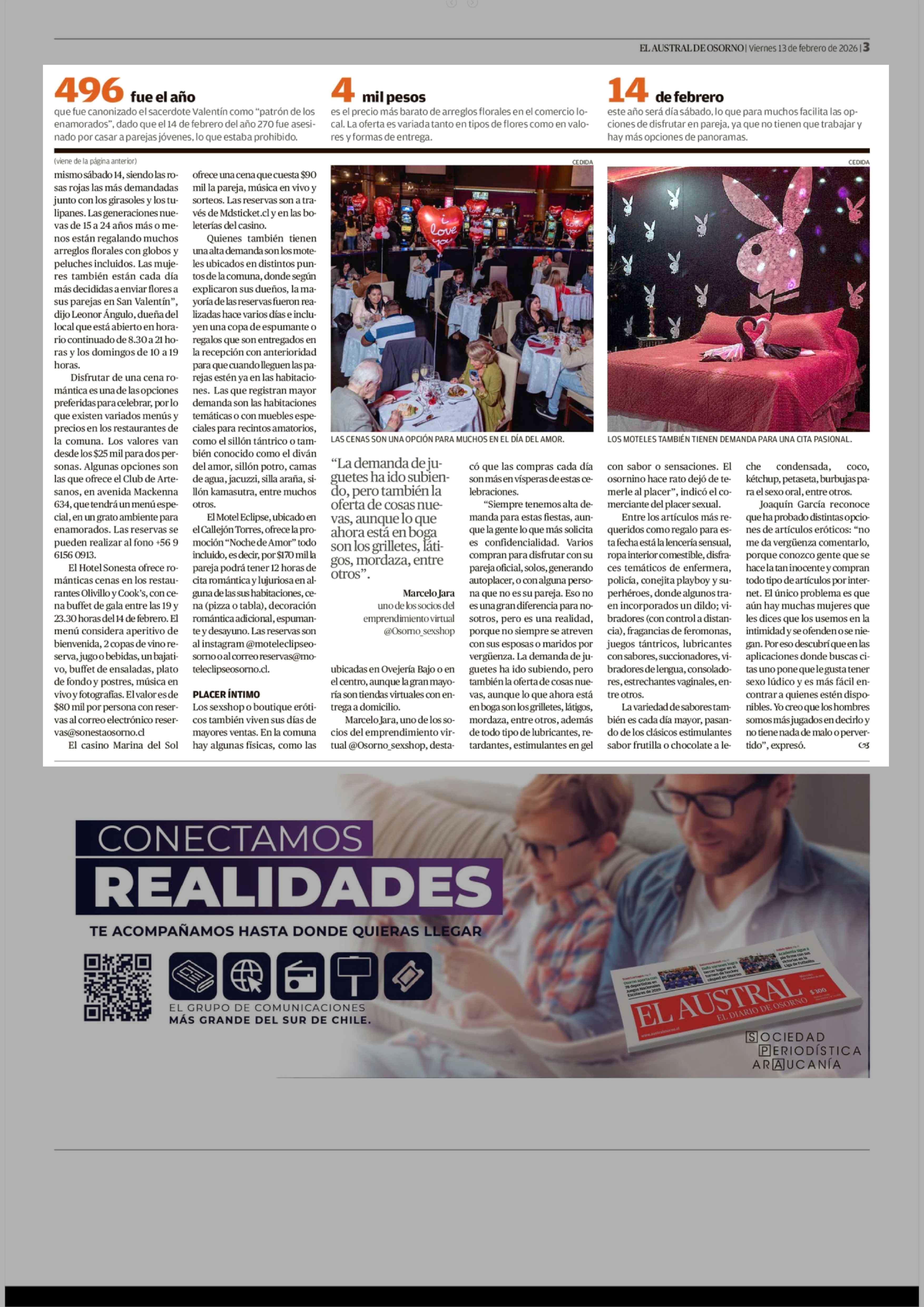 Cenas, flores y regalos eróticos son la tendencia de los osorninos para celebrar el Día del Amor 13-02-2026 El Austral de Osorno |