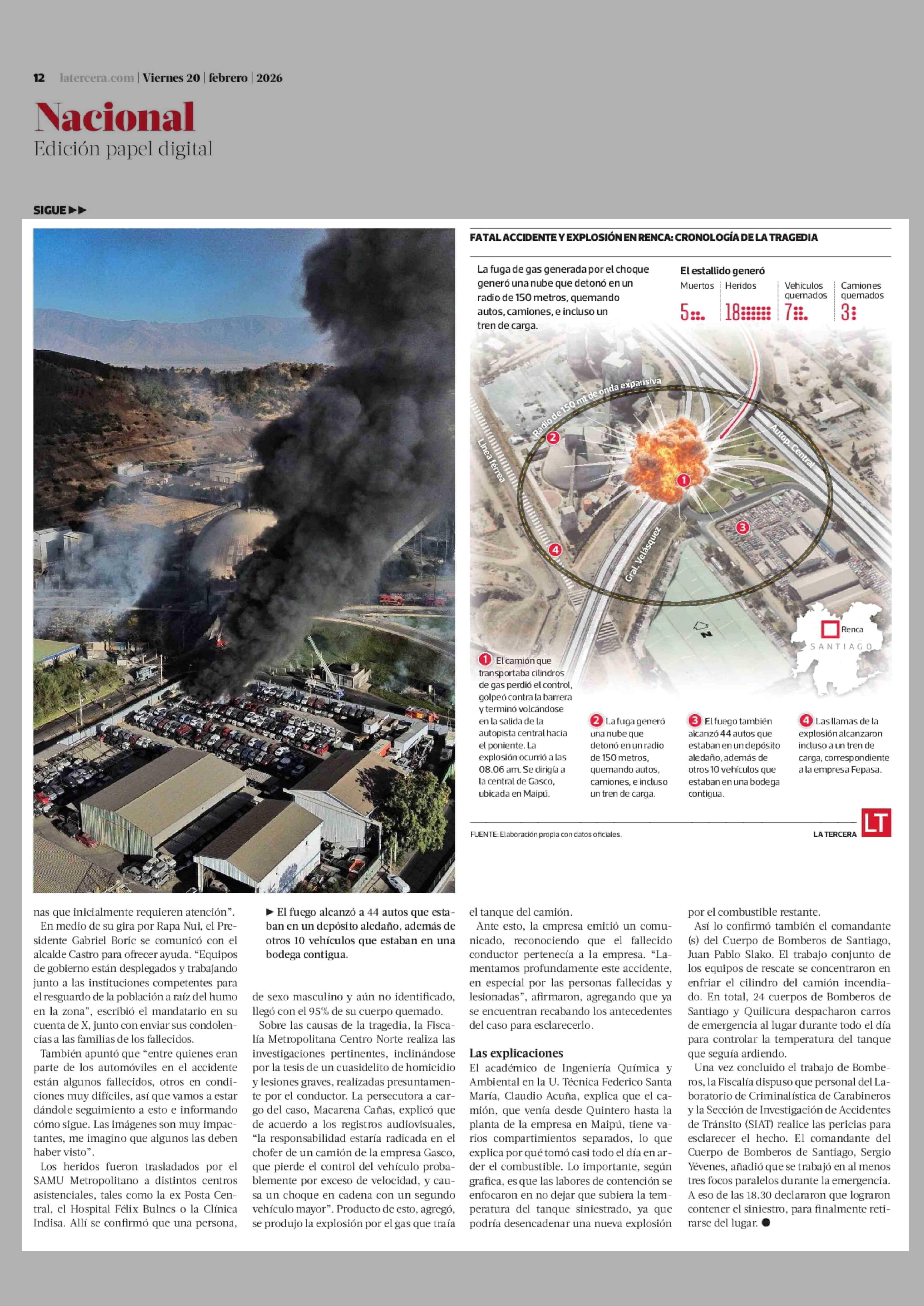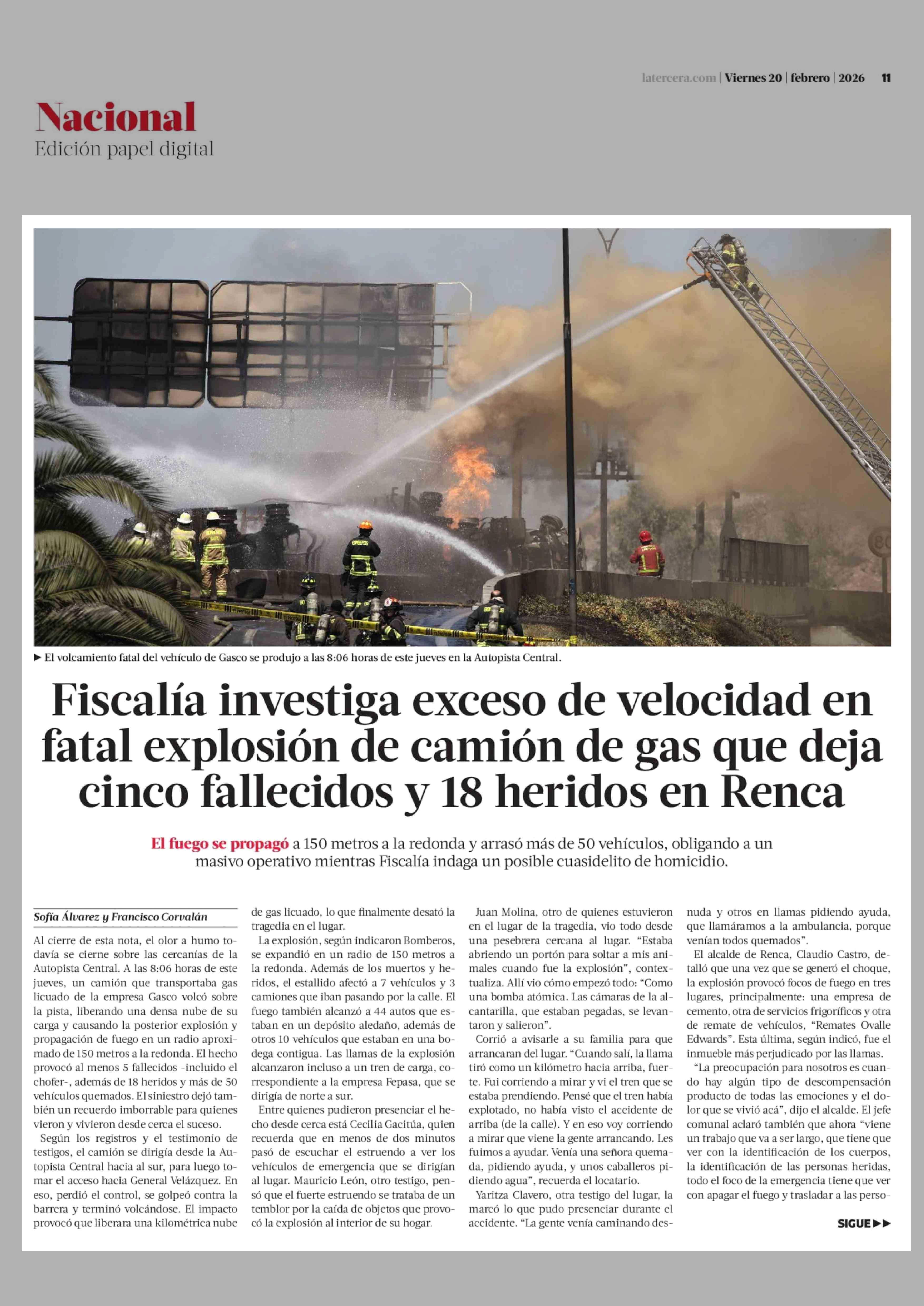Fiscalía investiga exceso de velocidad en fatal explosión de camión de gas que deja cinco fallecidos y 18 heridos en Renca 20-02-2026 La Tercera |