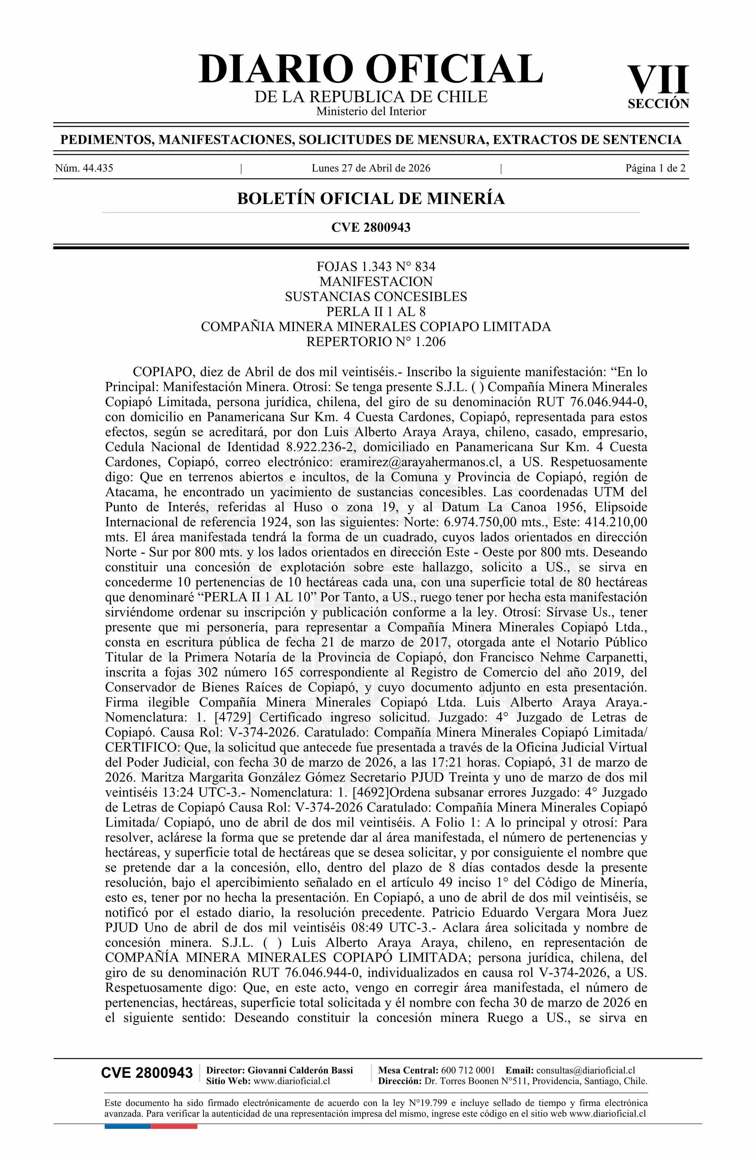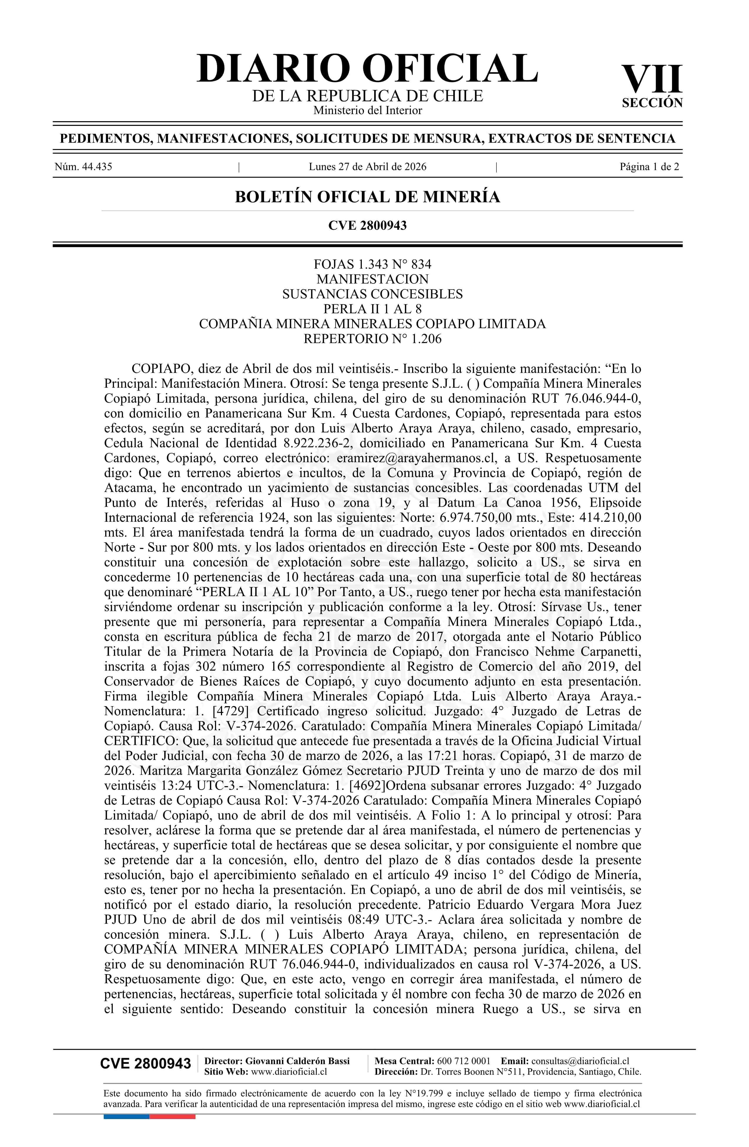 PERLA II 1 AL 8 / Compañía Minera Minerales Copiapó Limitada 27-04-2026 DIARIO OFICIAL CHILE - BOLETÍN OFICIAL DE MINERÍA |