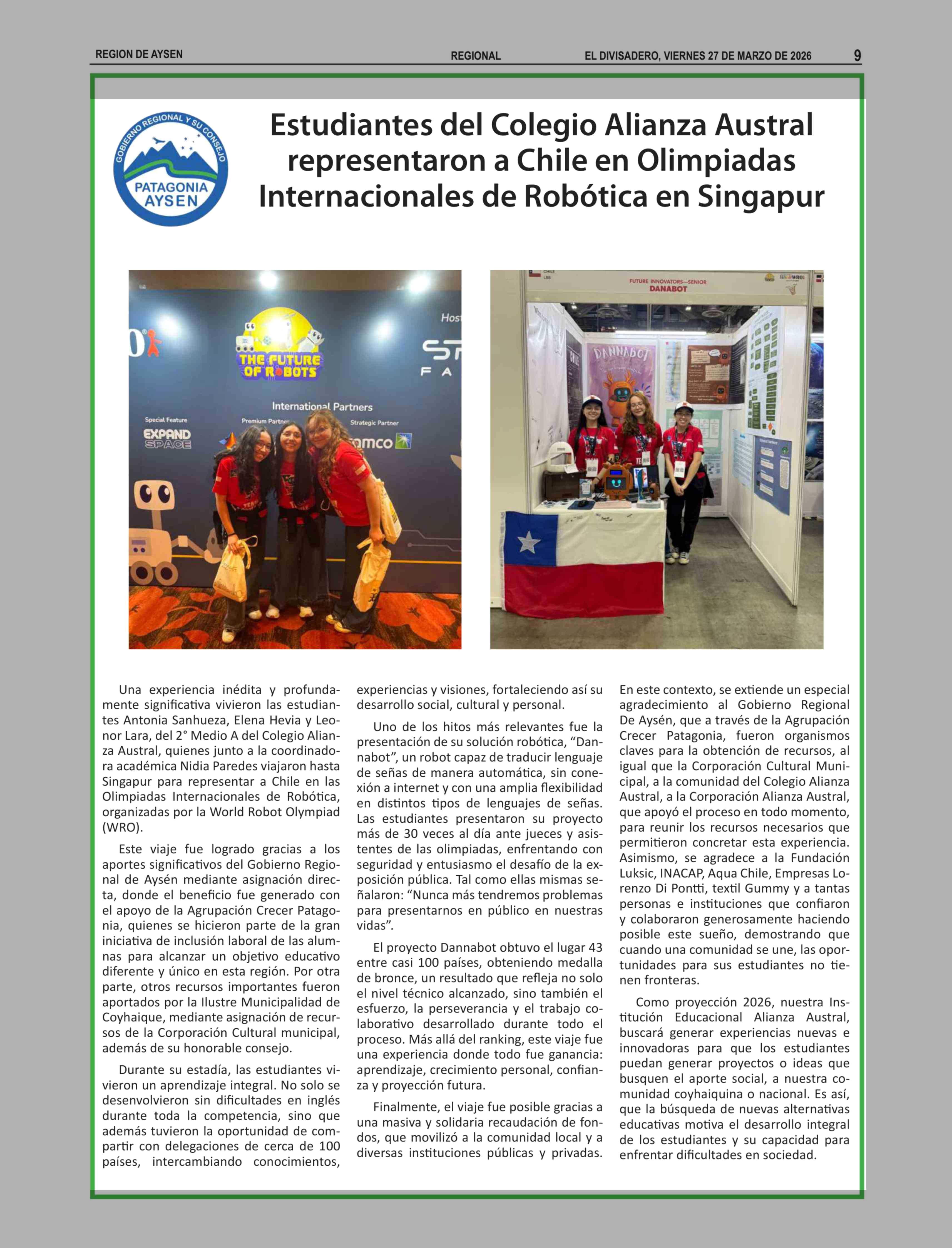 Estudiantes del Colegio Alianza Austral representaron a Chile en Olimpiadas Internacionales de Robótica en Singapur 27-03-2026 El Divisadero |