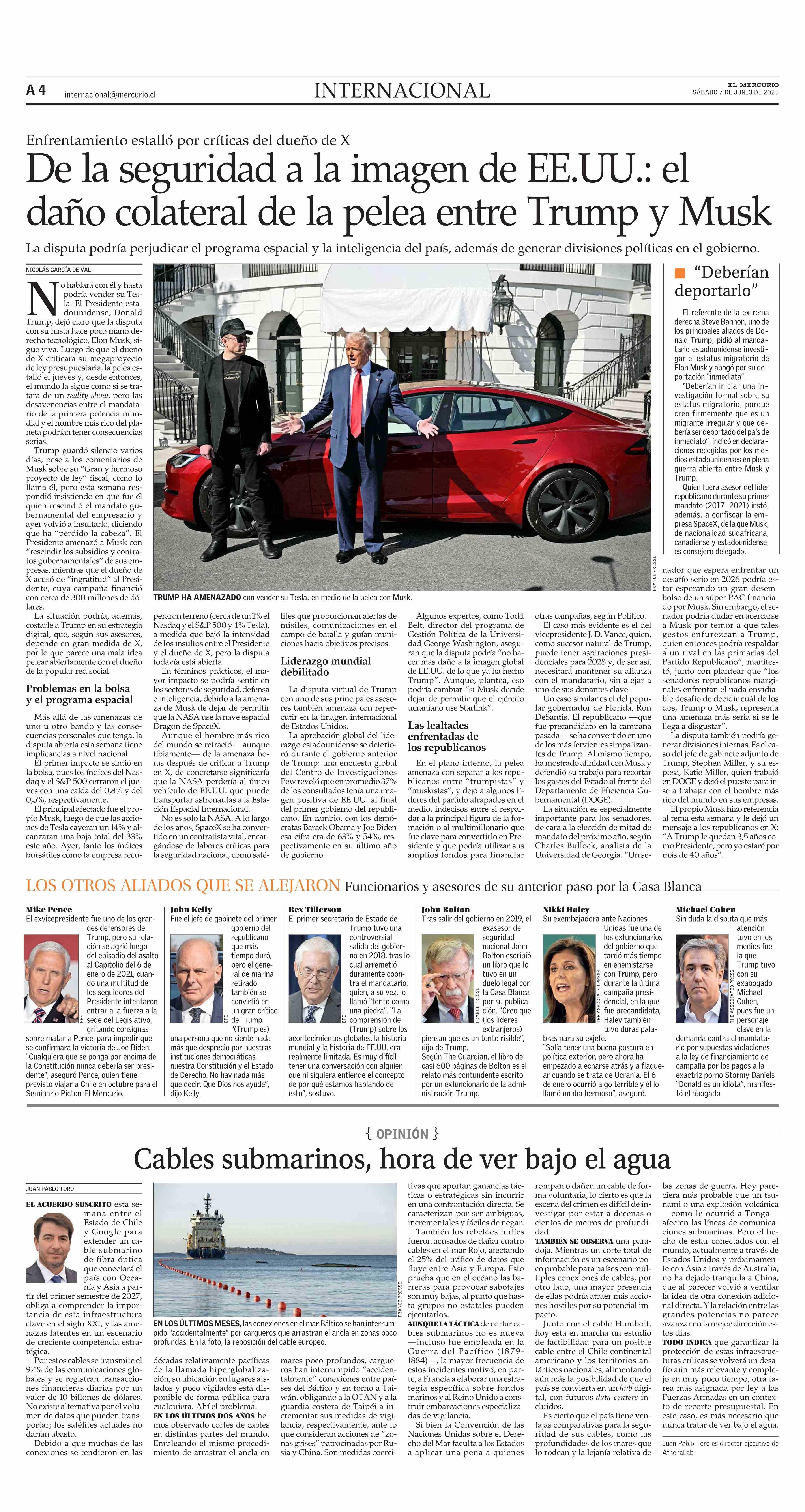 De la seguridad a la imagen de EE.UU.: el daño colateral de la pelea entre Trump y Musk 07-06-2025 El Mercurio |