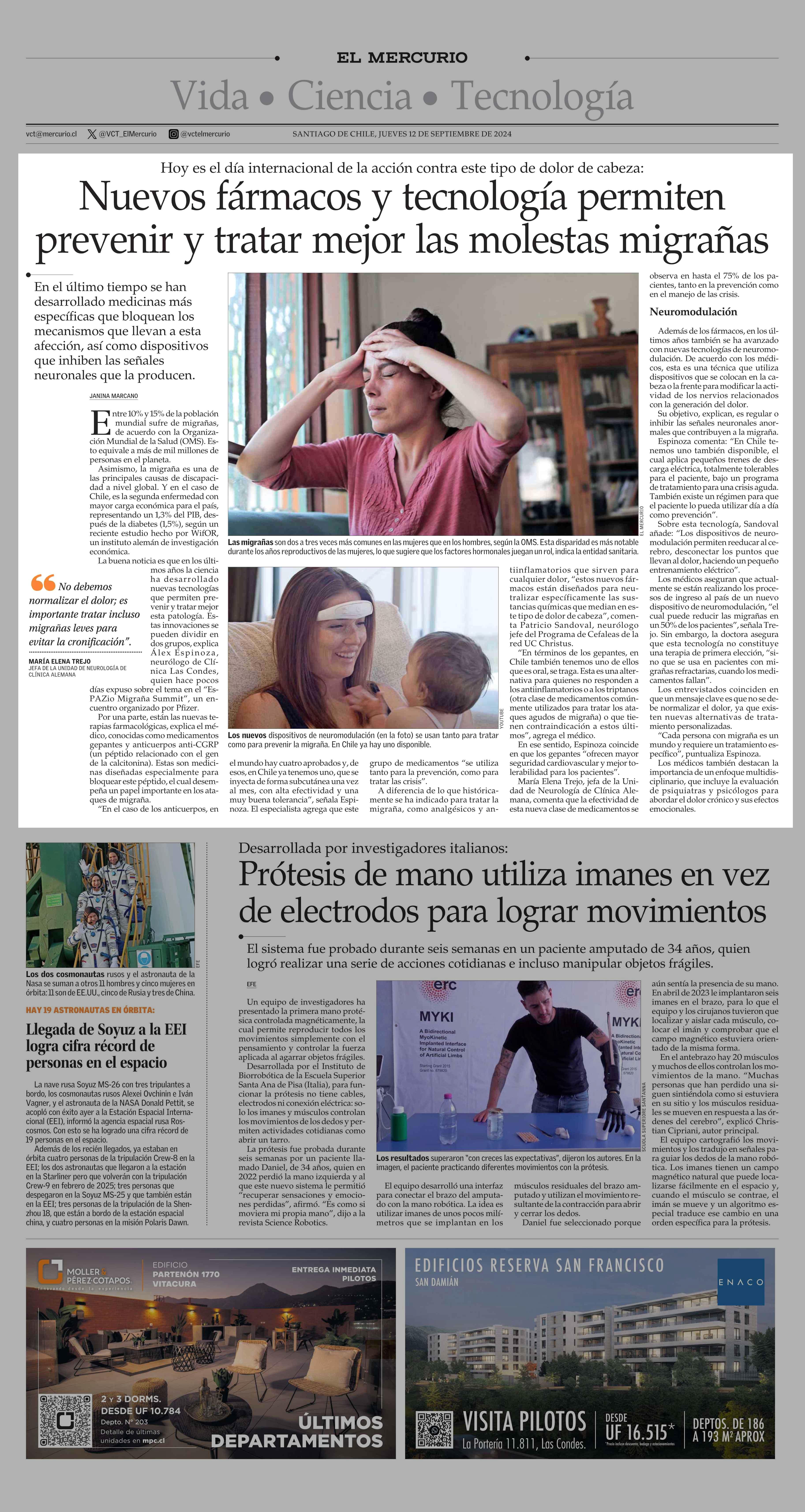 Nuevos fármacos y tecnología permiten prevenir y tratar mejor las molestas migrañas 12-09-2024 El Mercurio |