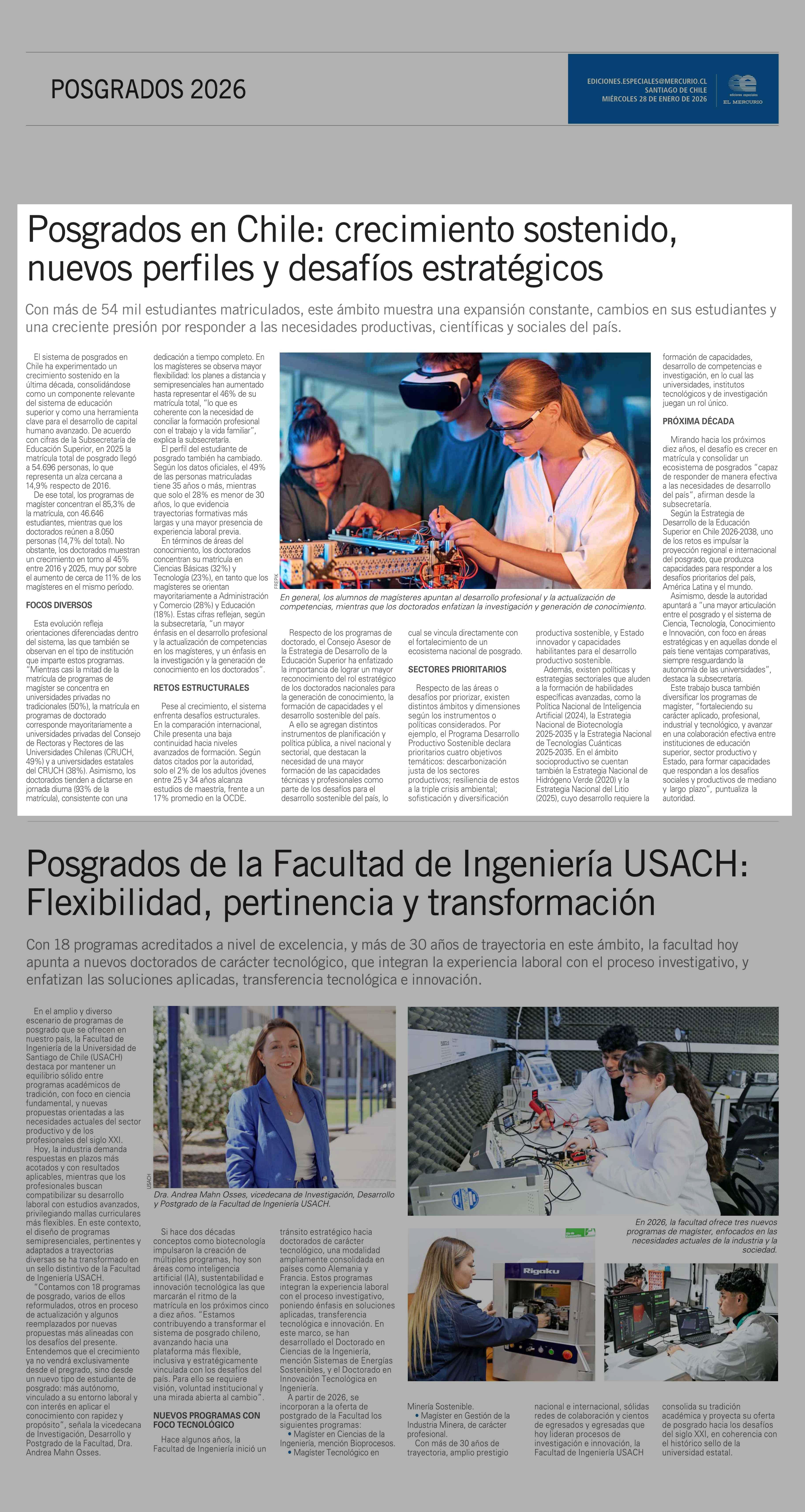Posgrados en Chile: crecimiento sostenido, nuevos perfiles y desafíos estratégicos 28-01-2026 El Mercurio |