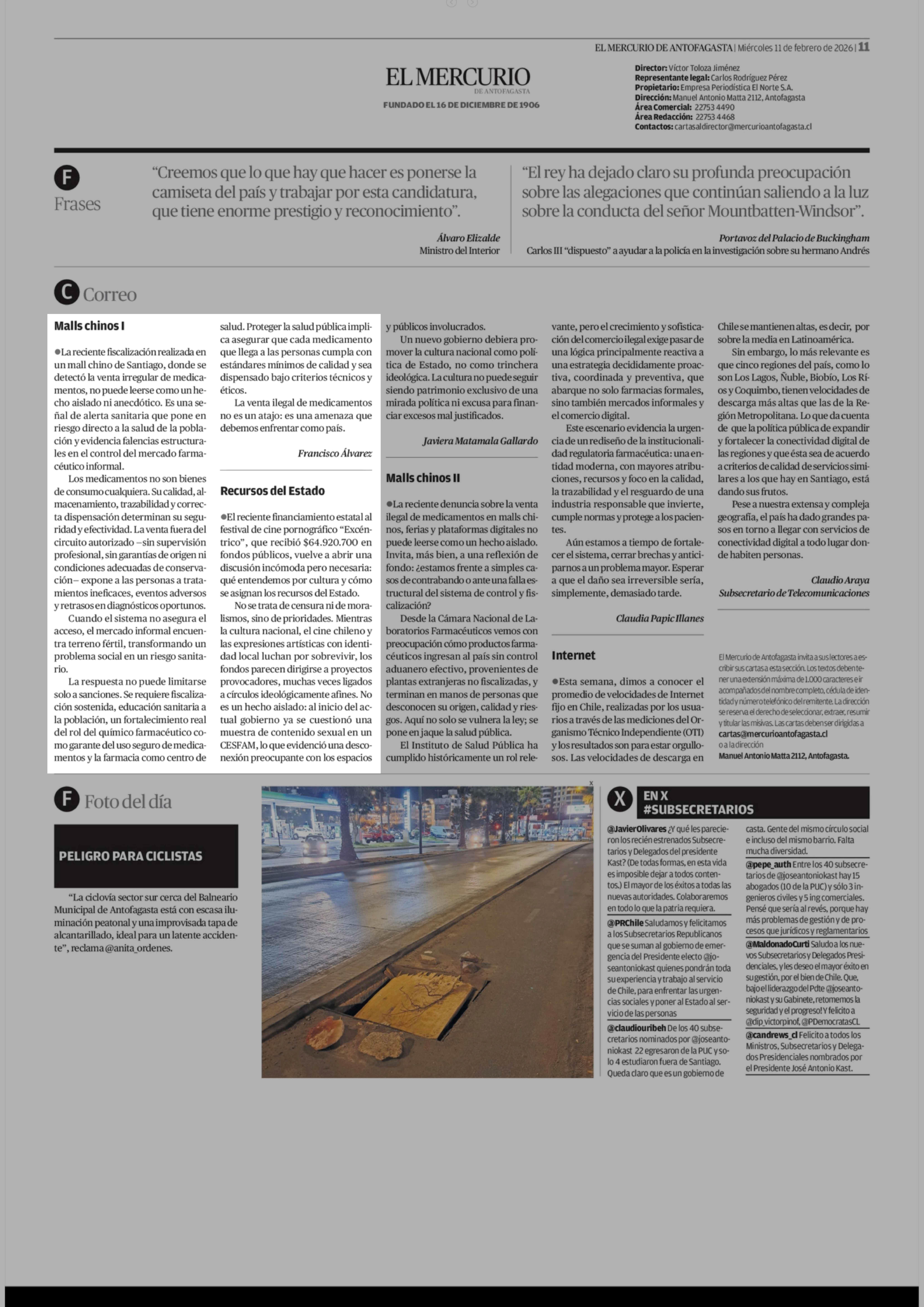 Cartas: Malls chinos I 11-02-2026 El Mercurio de Antofagasta |