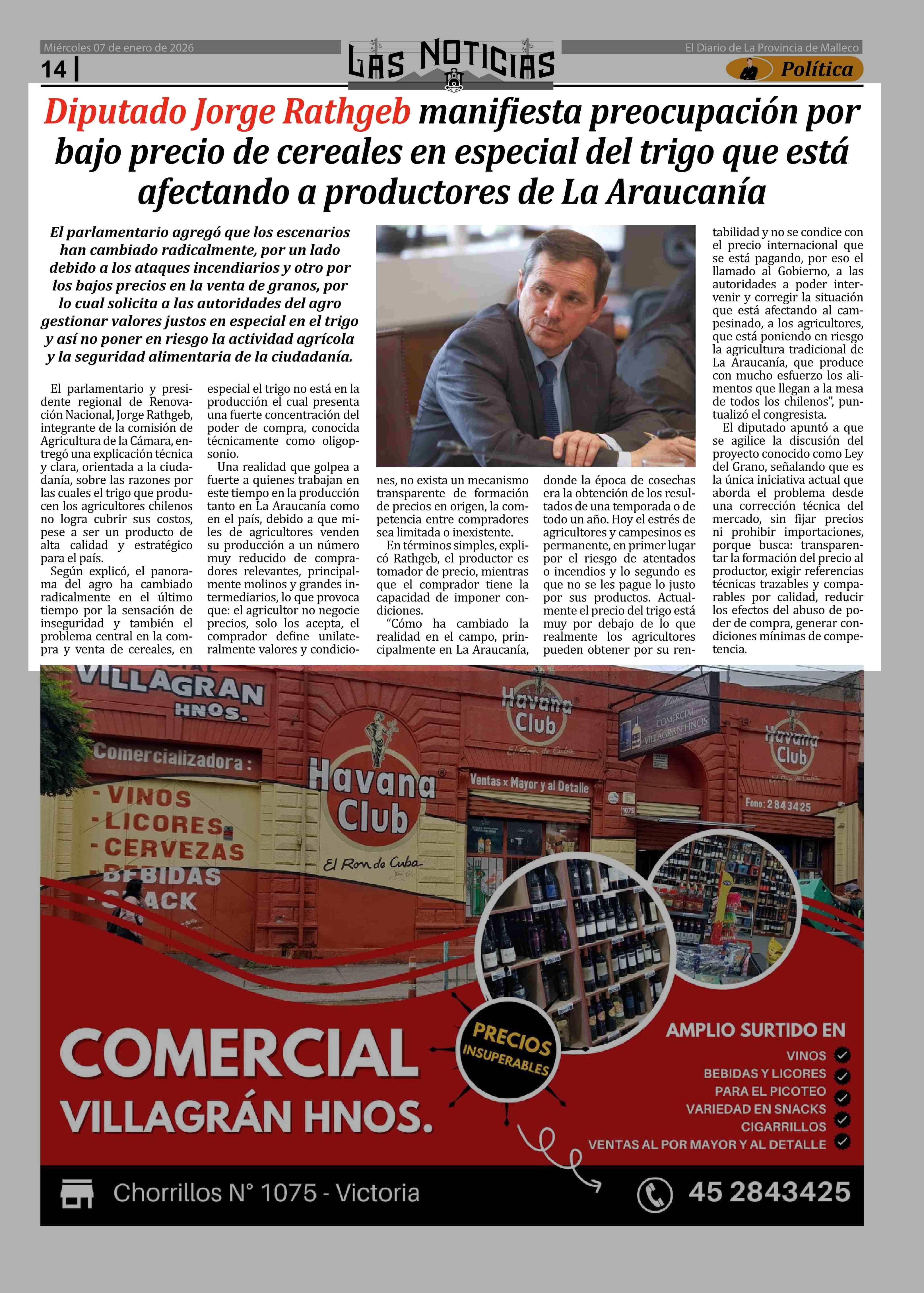 Diputado Jorge Rathgeb manifiesta preocupación por bajo precio de cereales en especial del trigo que está afectando a productores de La Araucanía 07-01-2026 Las Noticias |