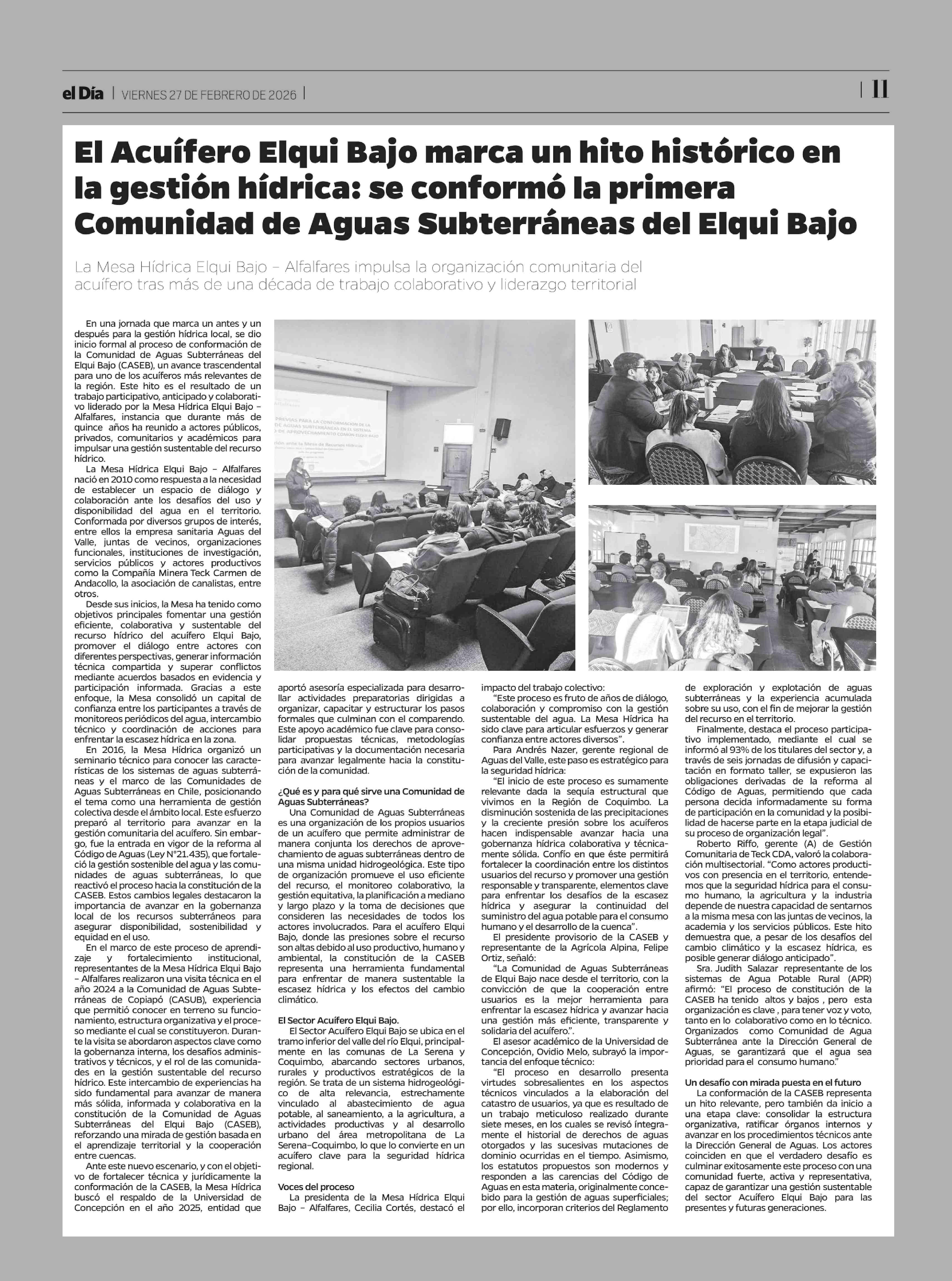 El Acuífero Elqui Bajo marca un hito histórico en la gestión hídrica: se conformó la primera Comunidad de Aguas Subterráneas del Elqui Bajo 27-02-2026 El Día |
