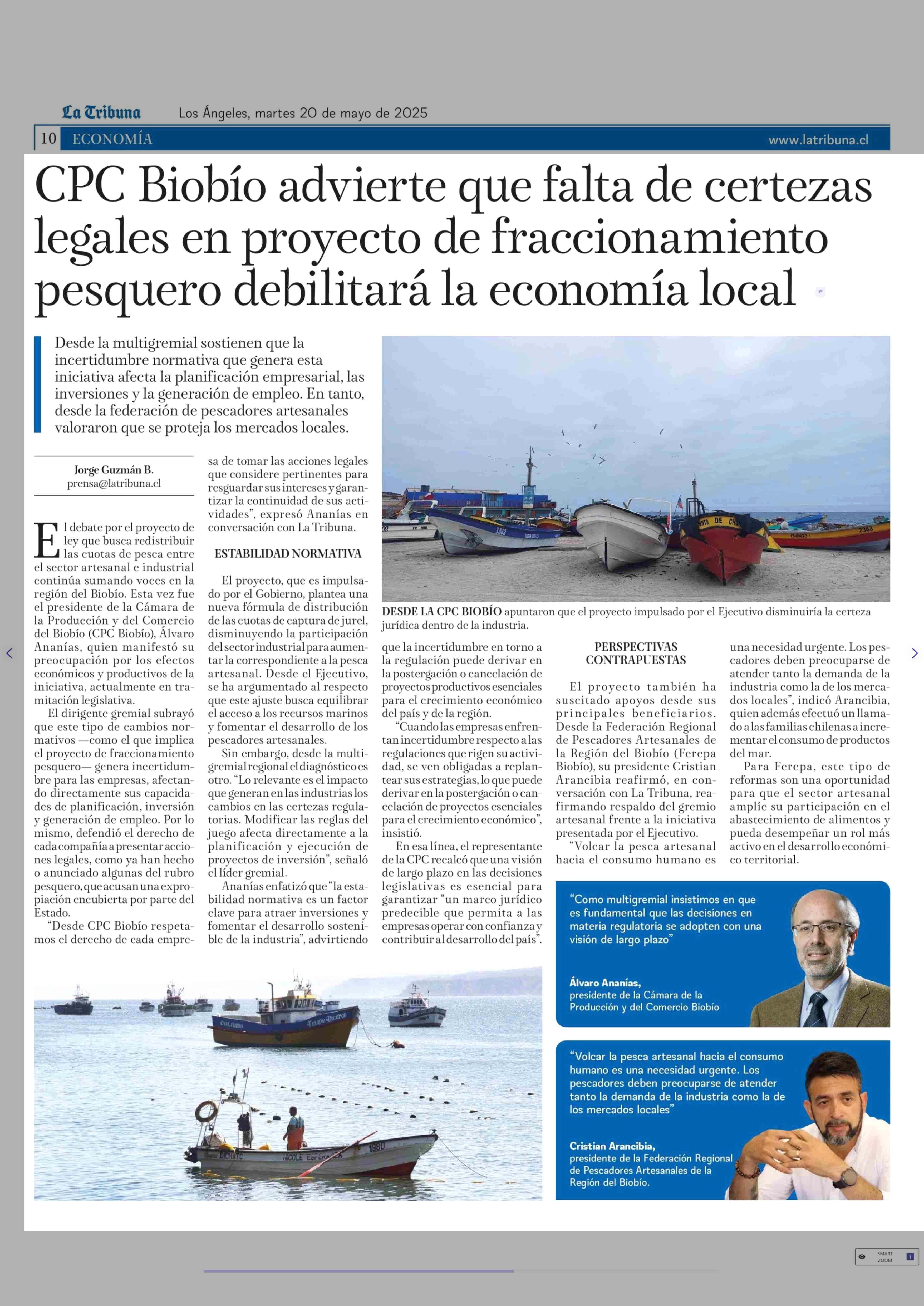 CPC Biobío advierte que falta de certezas legales en proyecto de fraccionamiento pesquero debilitará la economía local 20-05-2025 La Tribuna |
