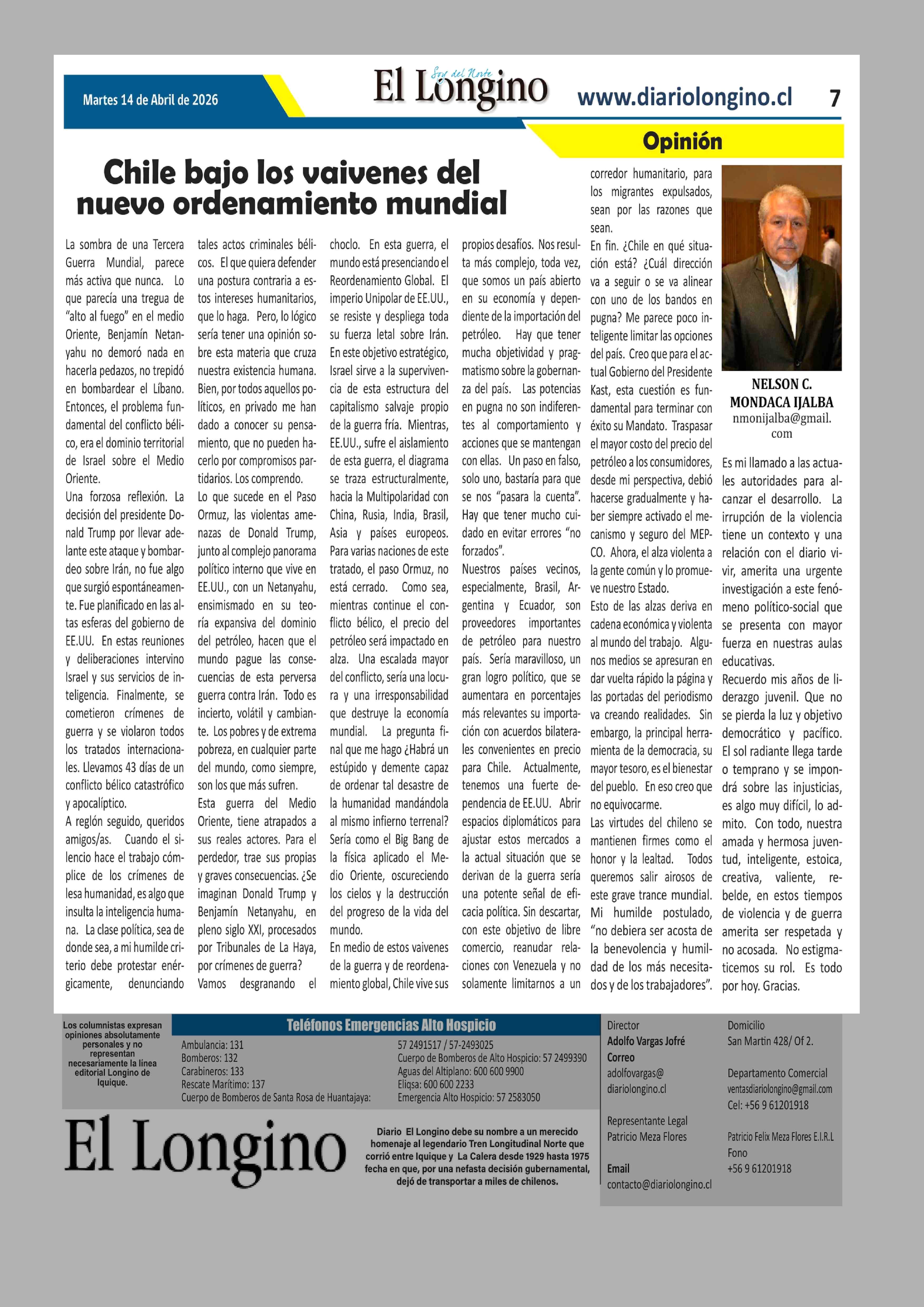 Columnas de Opinión: Chile bajo los vaivenes del nuevo ordenamiento mundial 14-04-2026 El Longino |