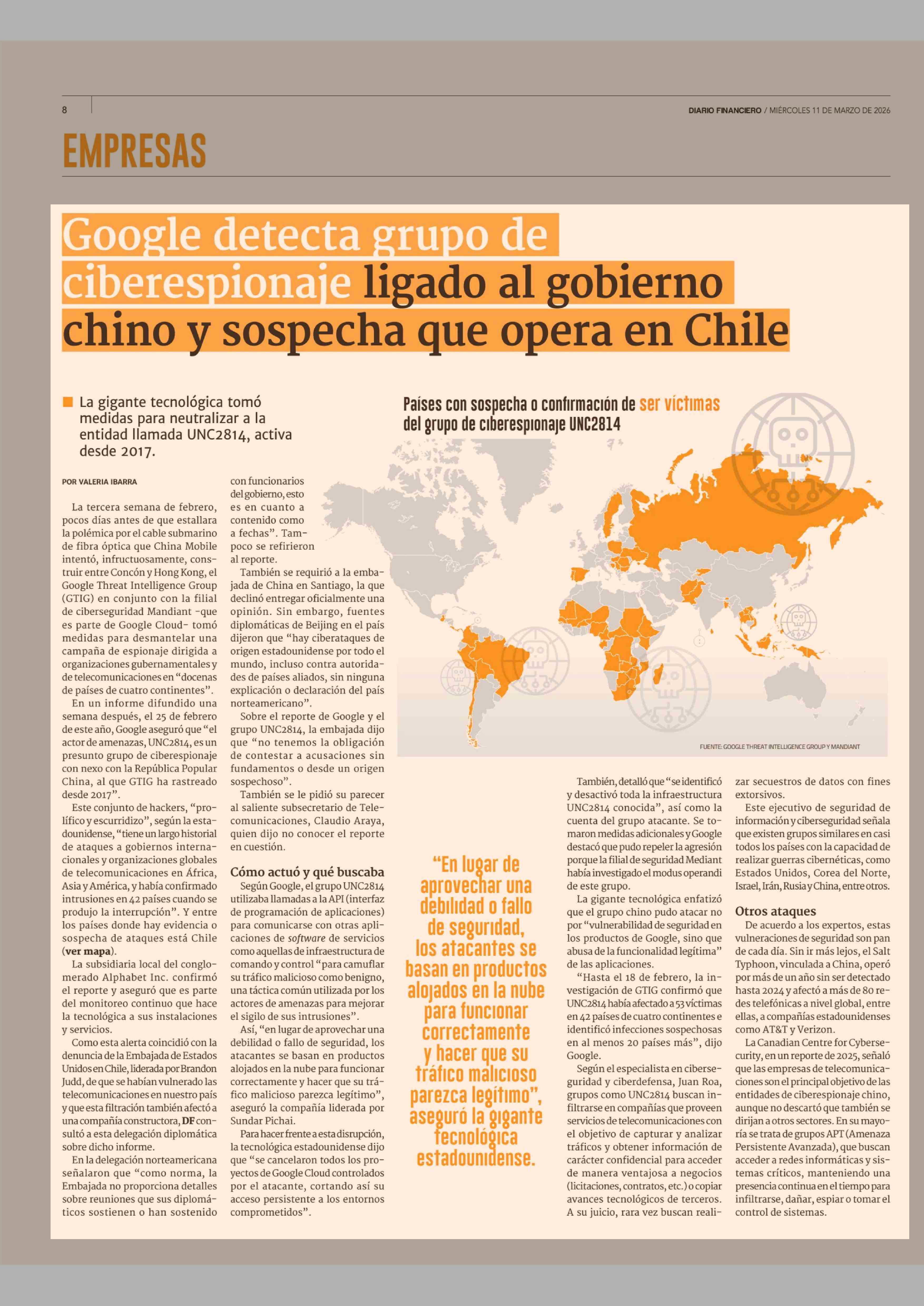 Título: Google detecta grupo de ciberespionaje ligado al gobierno chino y sospecha que opera en Chile