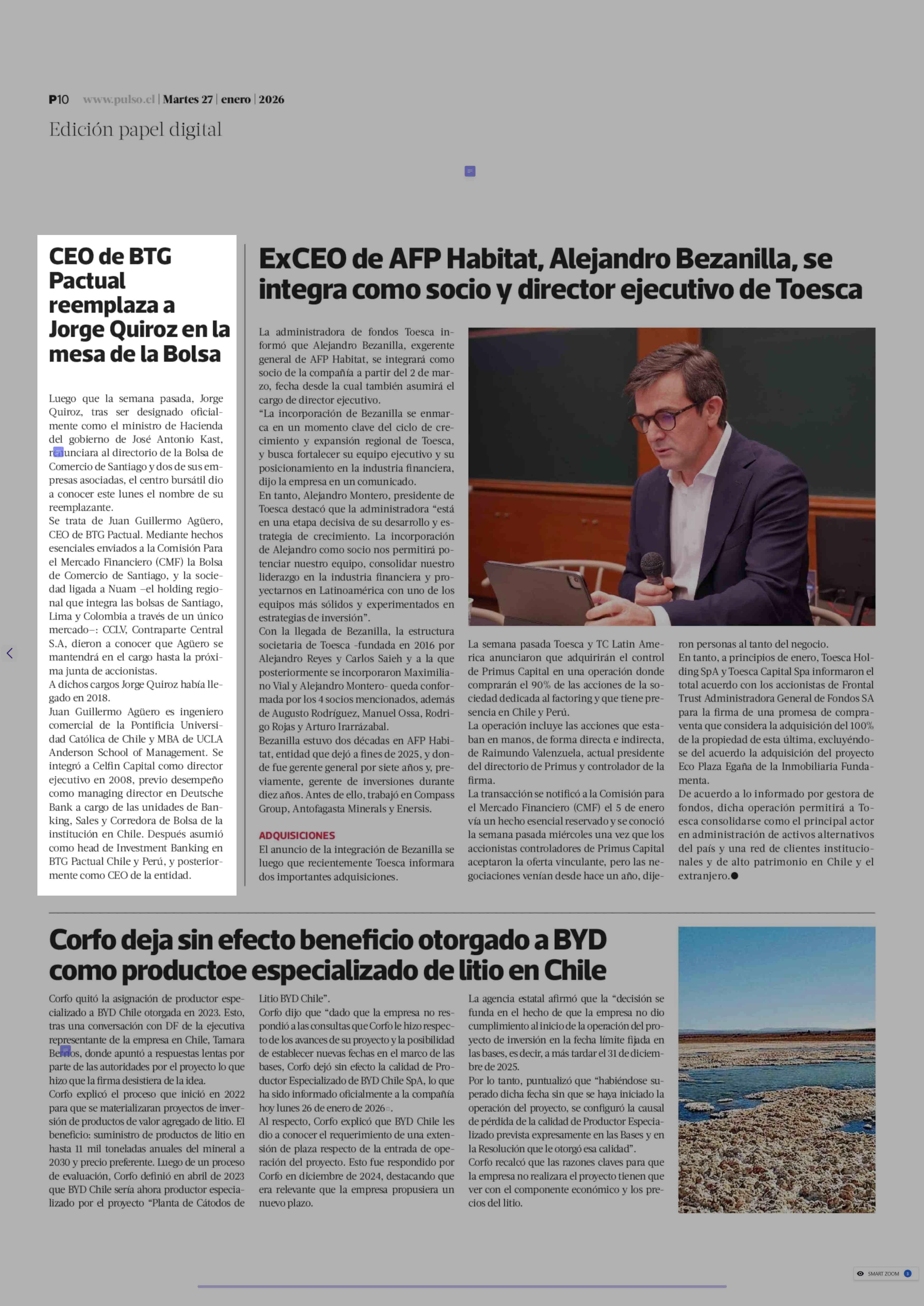 Título: CEO de BTG Pactual reemplaza a Jorge Quiroz en la mesa de la Bolsa