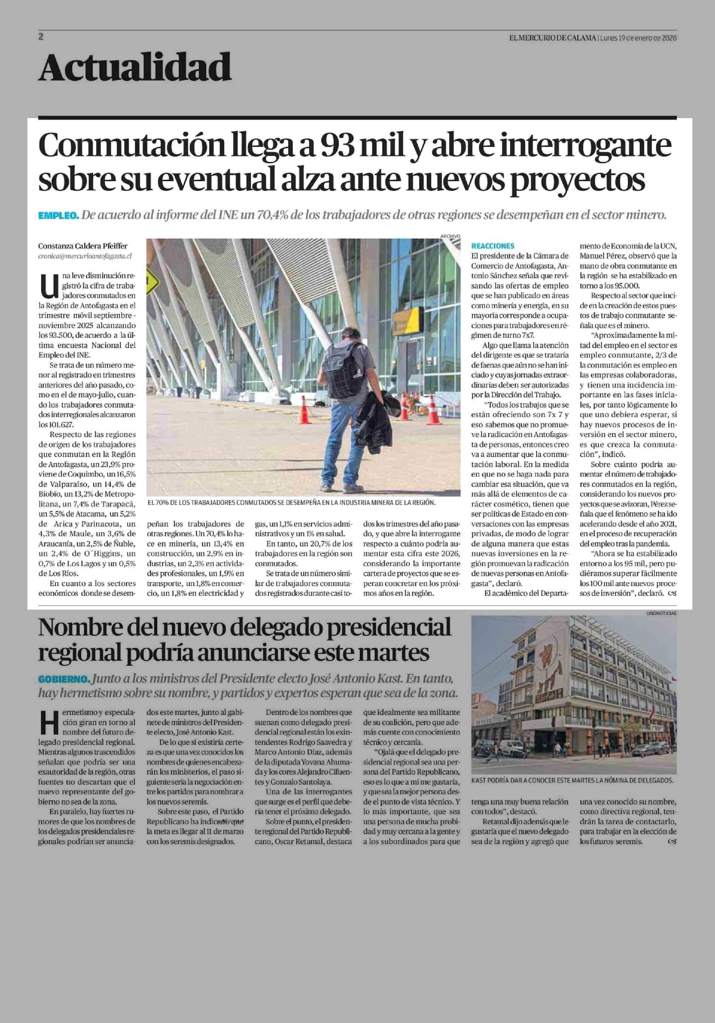 Conmutación llega a 93 mil y abre interrogante sobre su eventual alza ante nuevos proyectos 19-01-2026 El Mercurio de Calama |