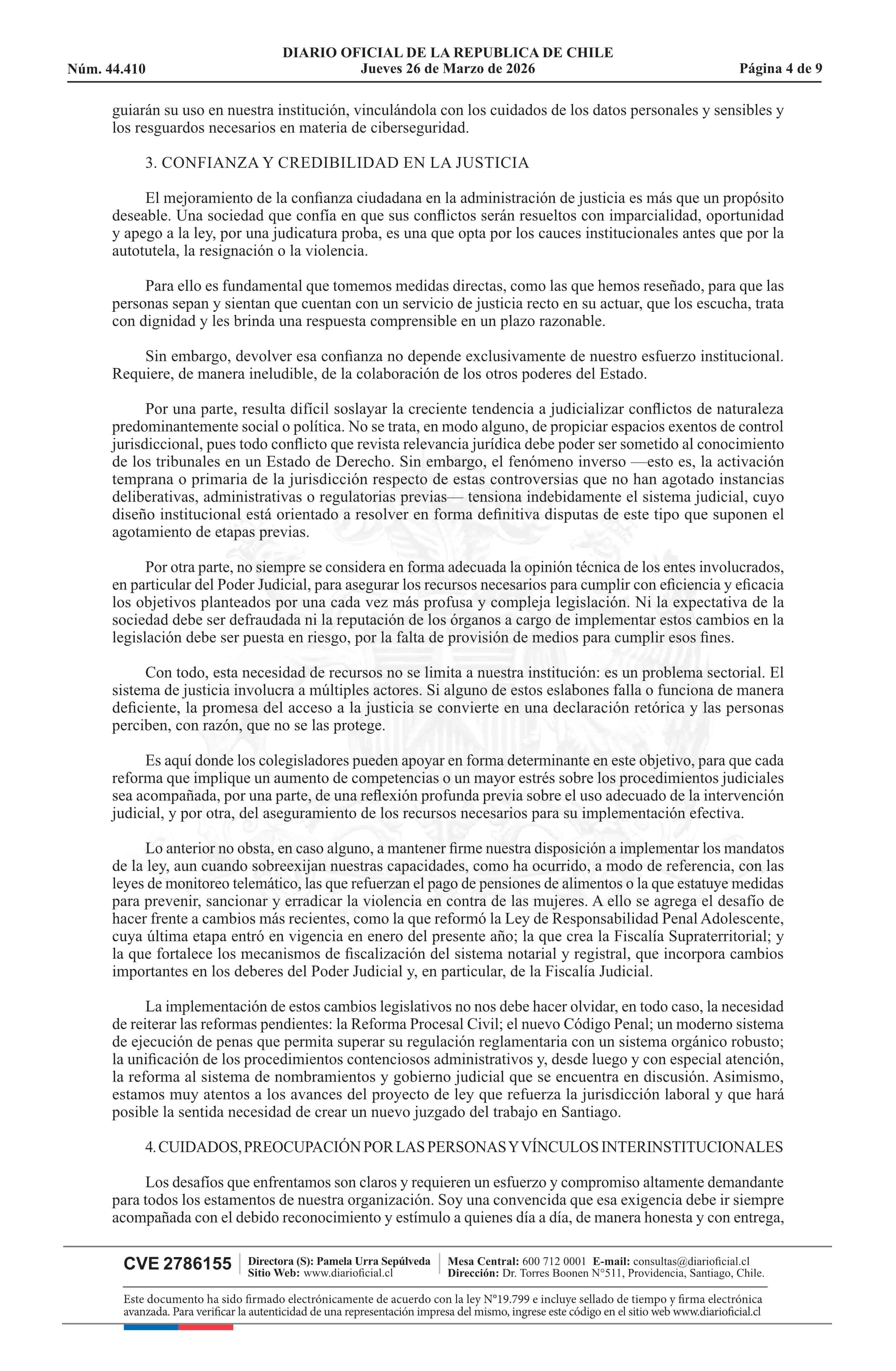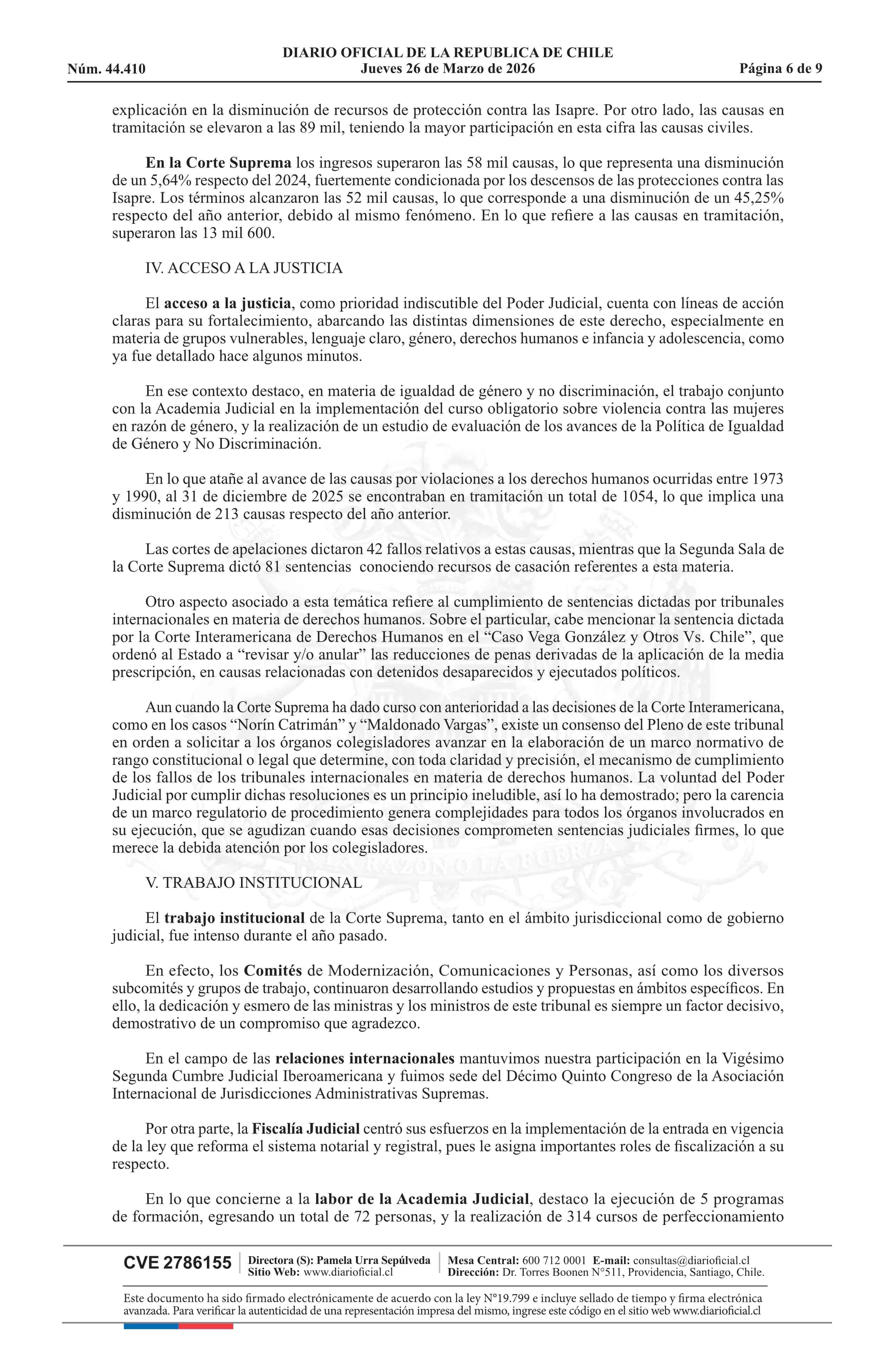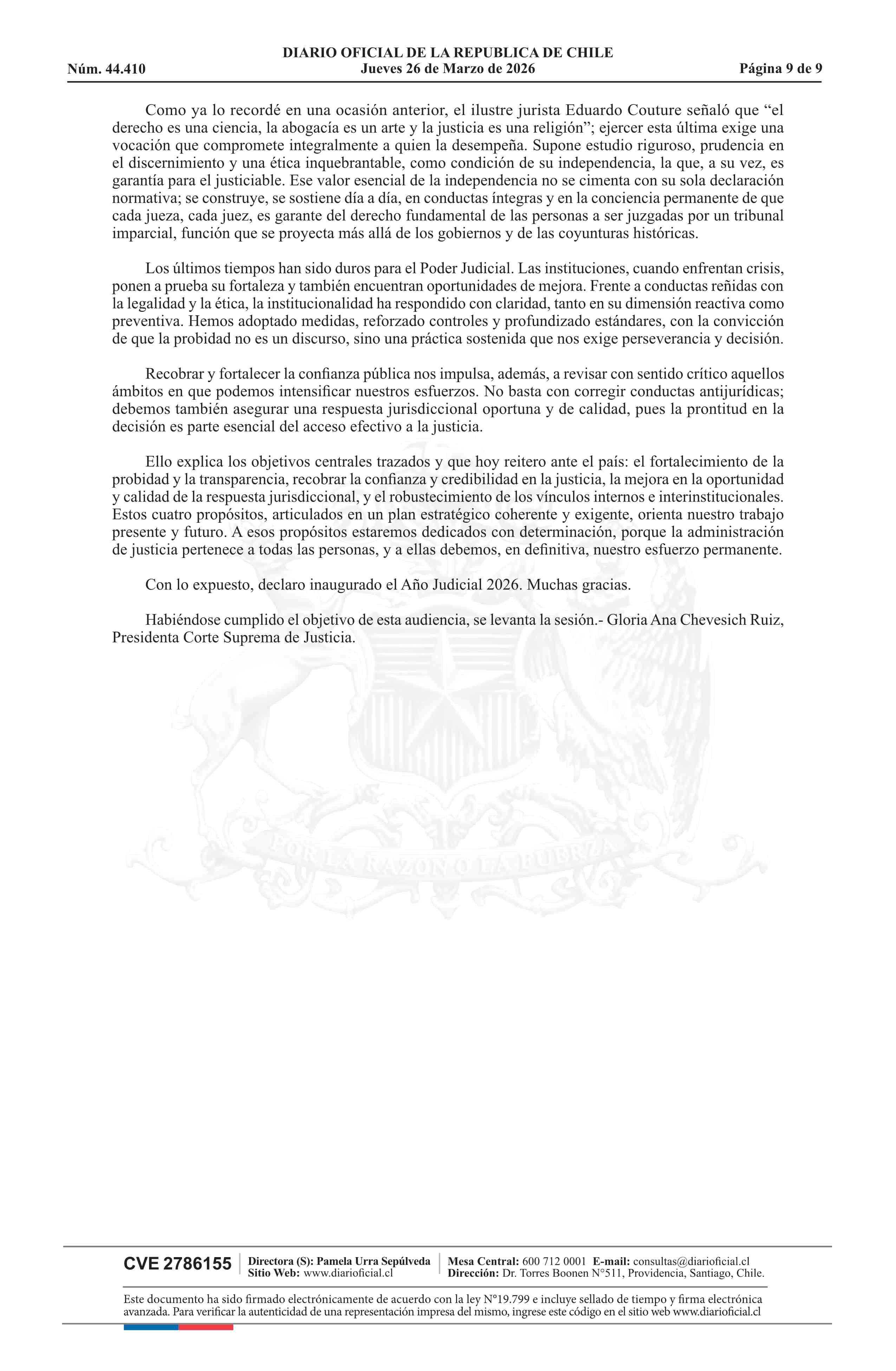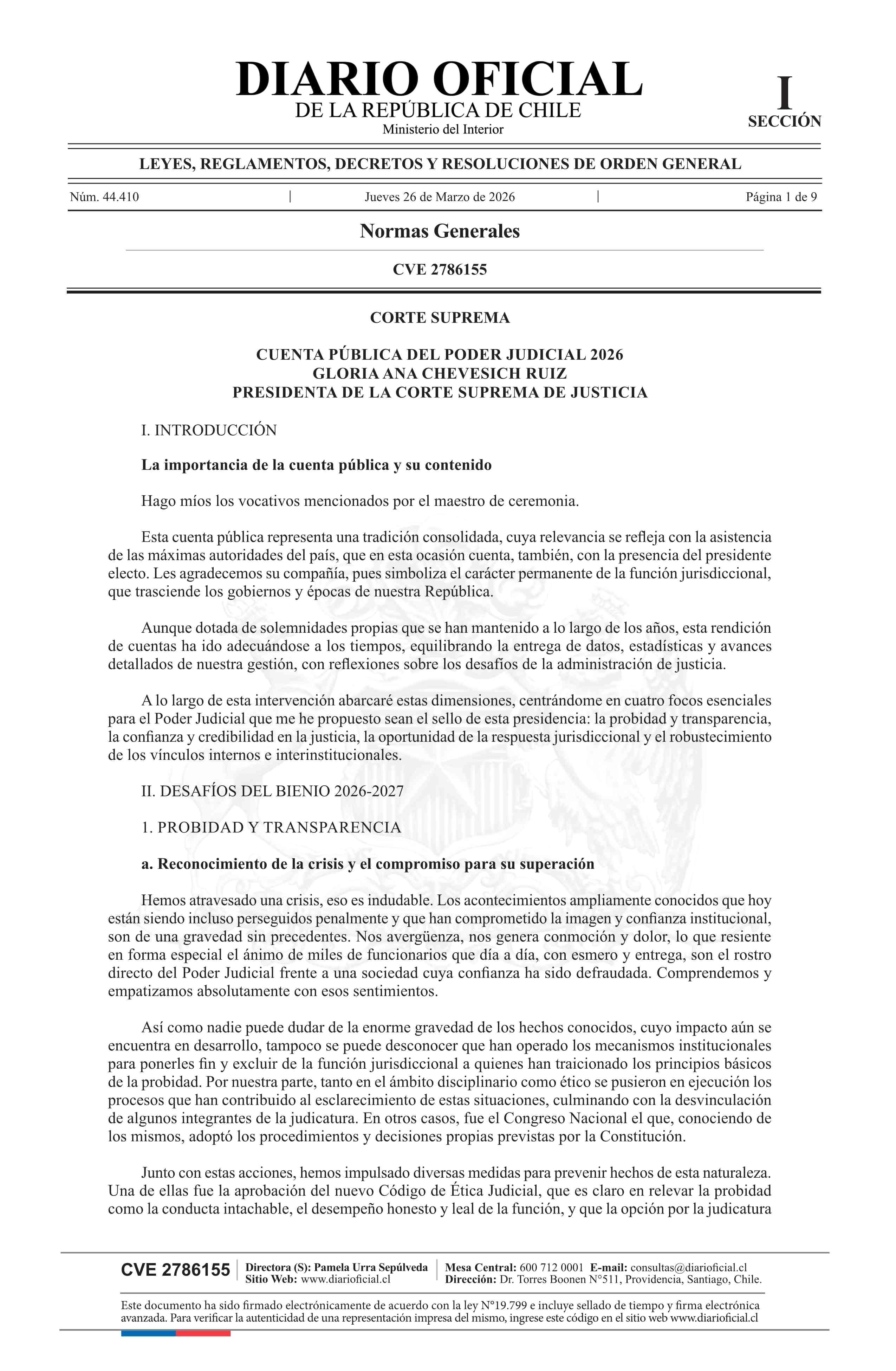 Cuenta Pública de la Presidenta de la Corte Suprema, año 2026 26-03-2026 Diario Oficial Edición Electrónica |
