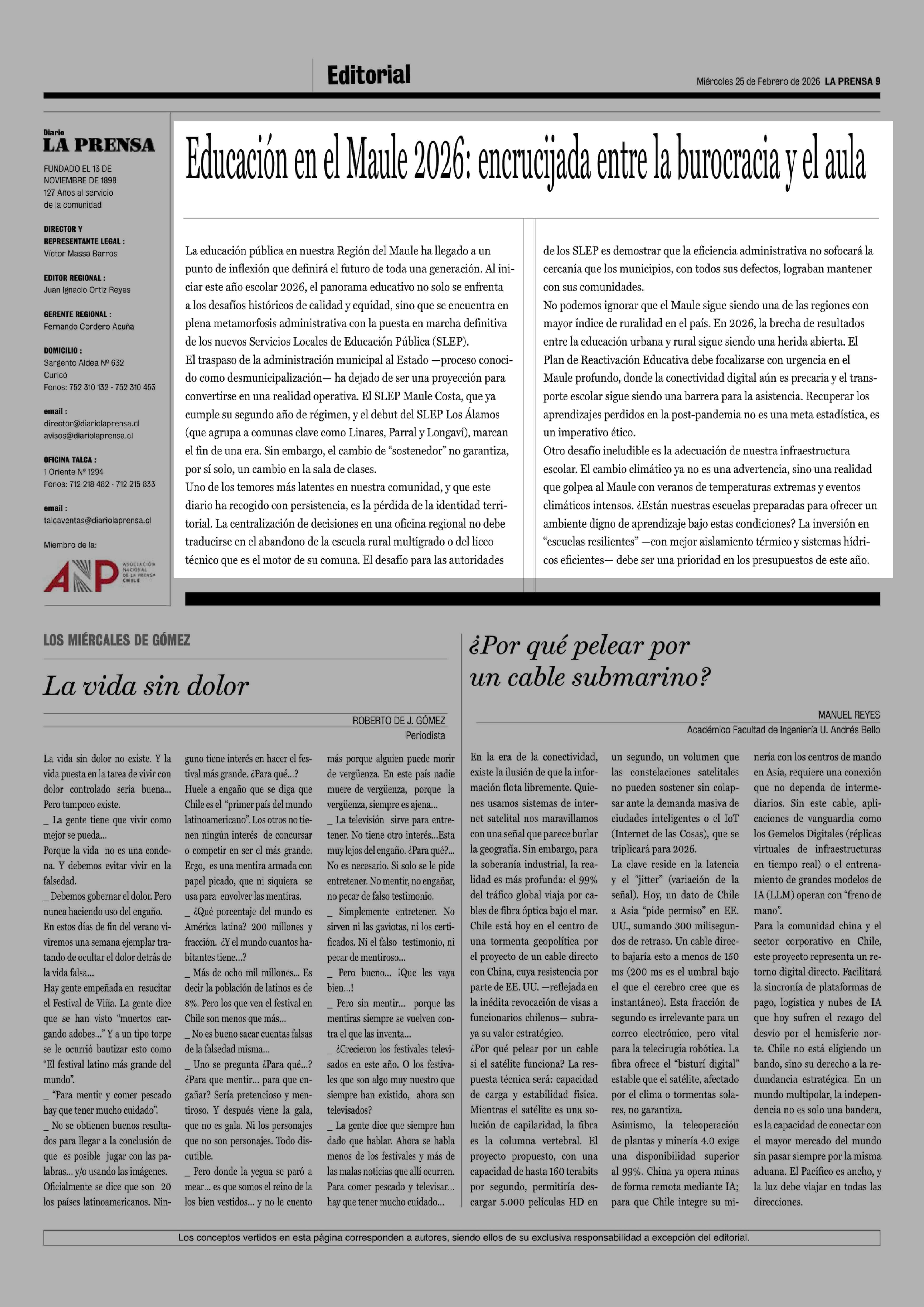 Editorial: Educación en el Maule 2026: encrucijada entre la burocracia y el aula 25-02-2026 La Prensa de Curicó |