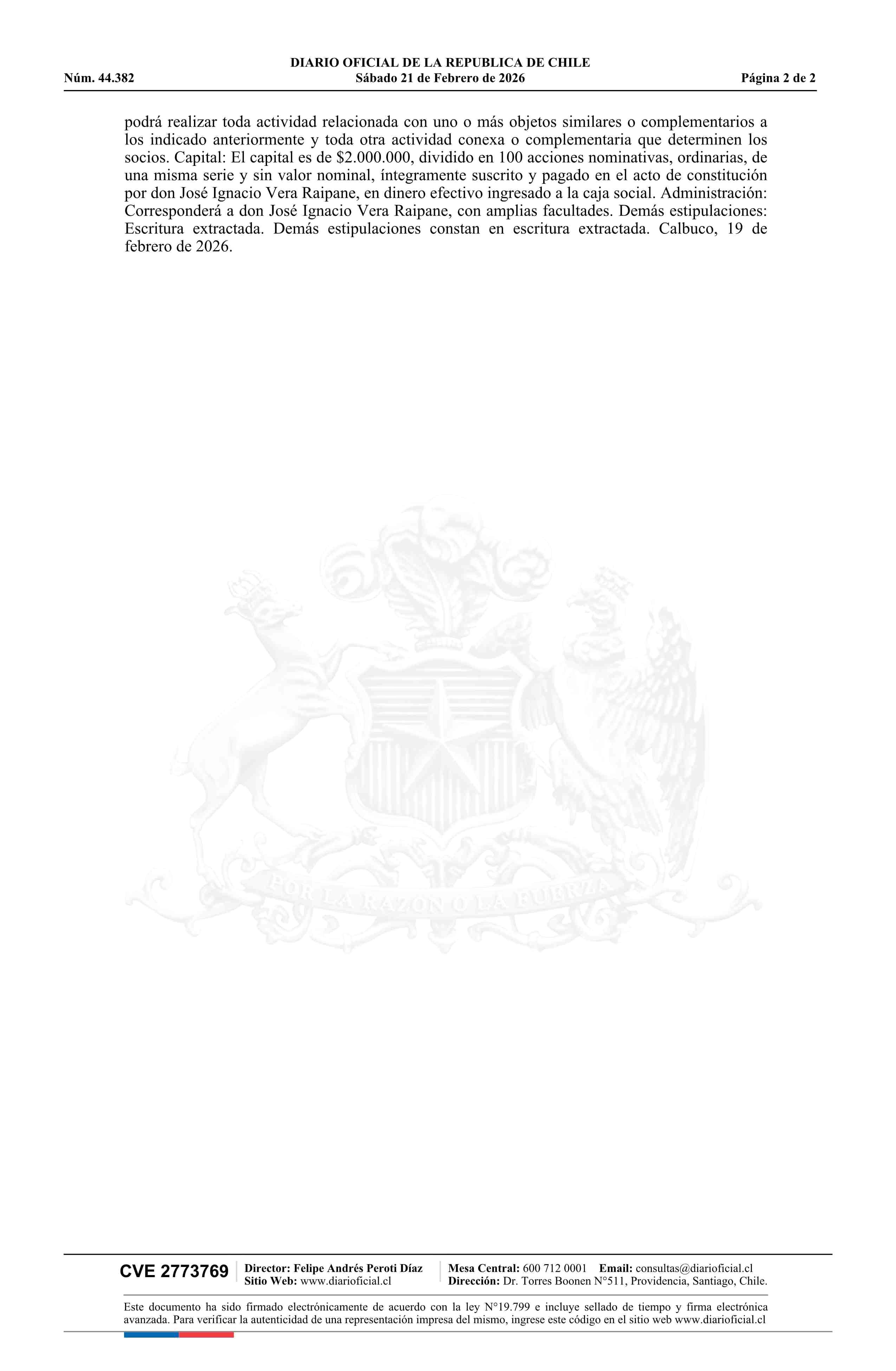 COMERCIALIZADORA, IMPORTADORA, EXPORTADORA Y DISTRIBUIDORA DE ALIMENTOS, BEBIDAS Y LICORES AL POR MAYOR Y MENOR VERMUS SpA 21-02-2026 Diario Oficial Edición Electrónica |