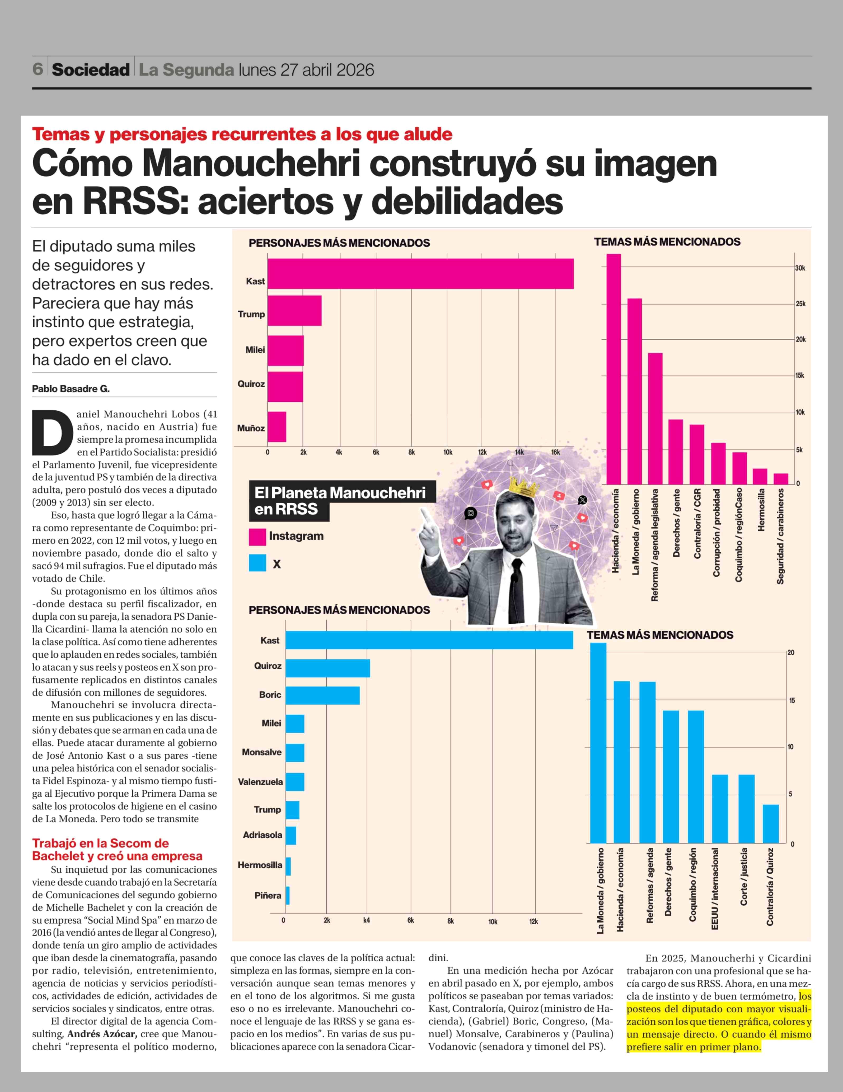 Cómo Manouchehri construyó su imagen en RRSS: aciertos y debilidades 27-04-2026 La Segunda |