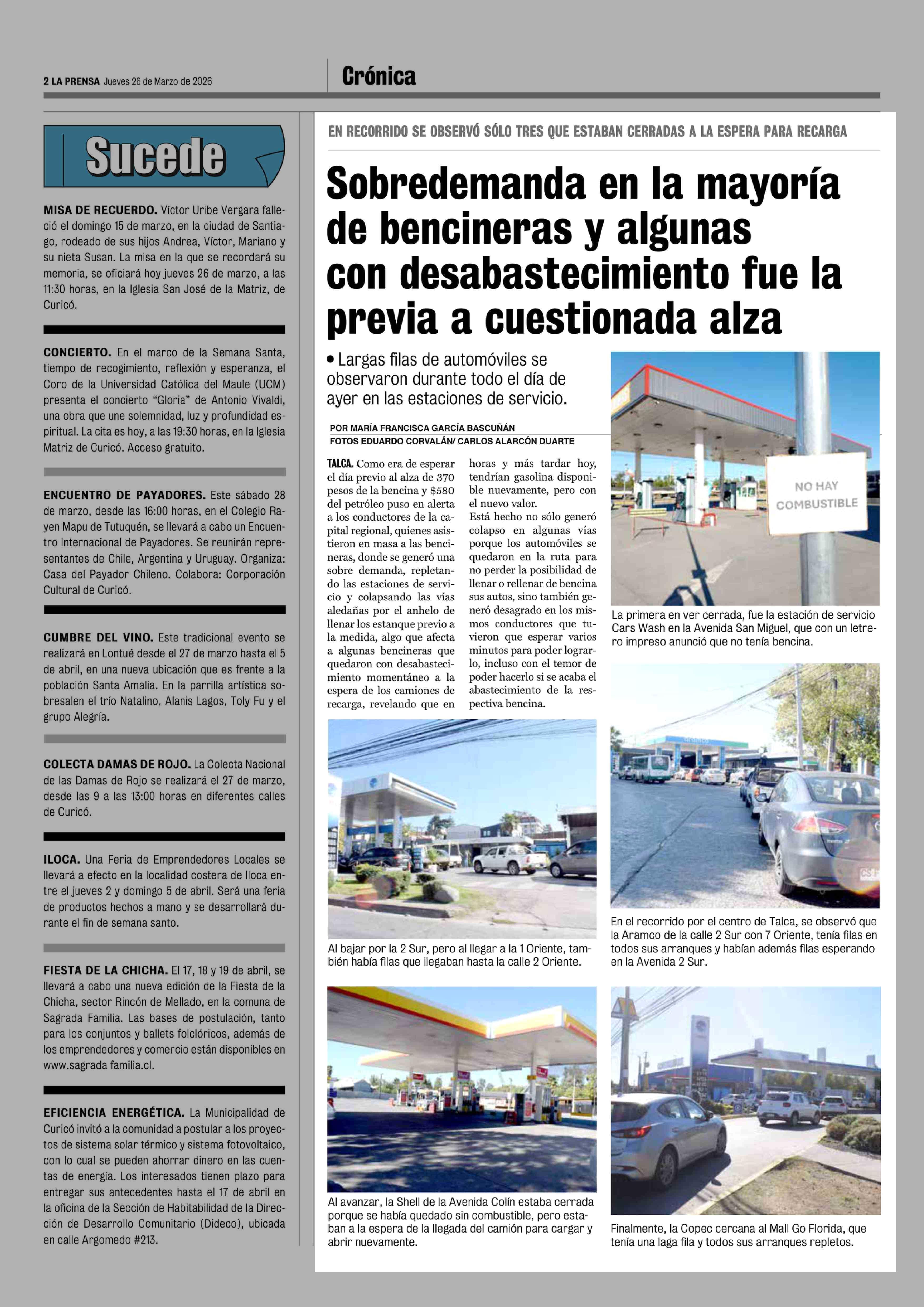 Sobredemanda en la mayoría de bencineras y algunas con desabastecimiento fue la previa a cuestionada alza 26-03-2026 La Prensa de Curicó |
