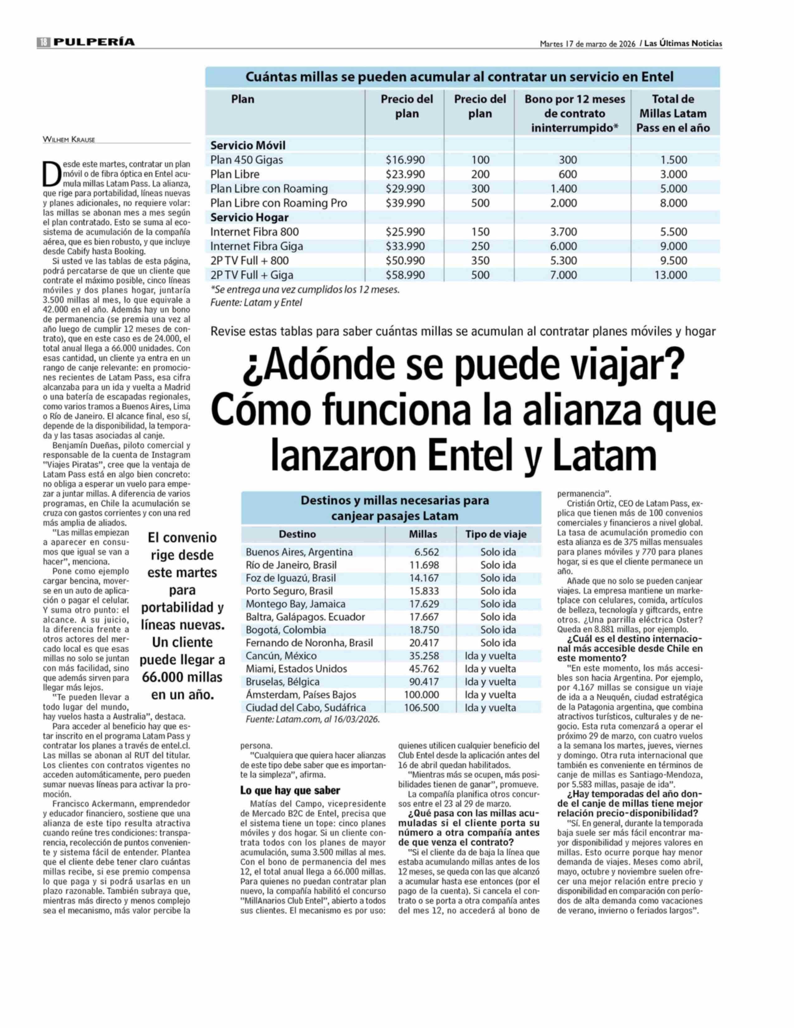 ¿Adónde se puede viajar? Cómo funciona la alianza que lanzaron Entel y Latam 17-03-2026 Las Últimas Noticias |