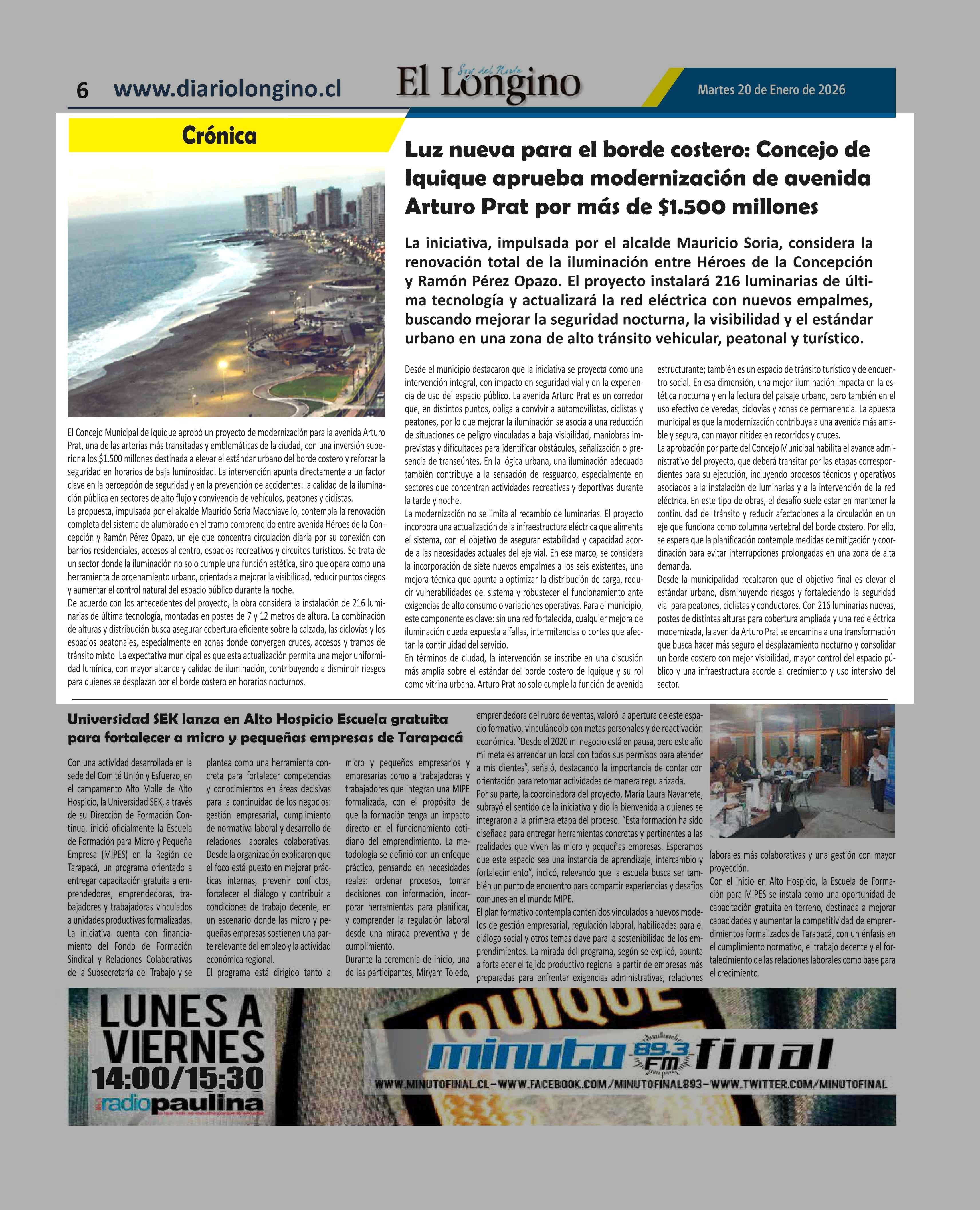 Luz nueva para el borde costero: Concejo de Iquique aprueba modernización de avenida Arturo Prat por más de $1.500 millones 20-01-2026 El Longino |