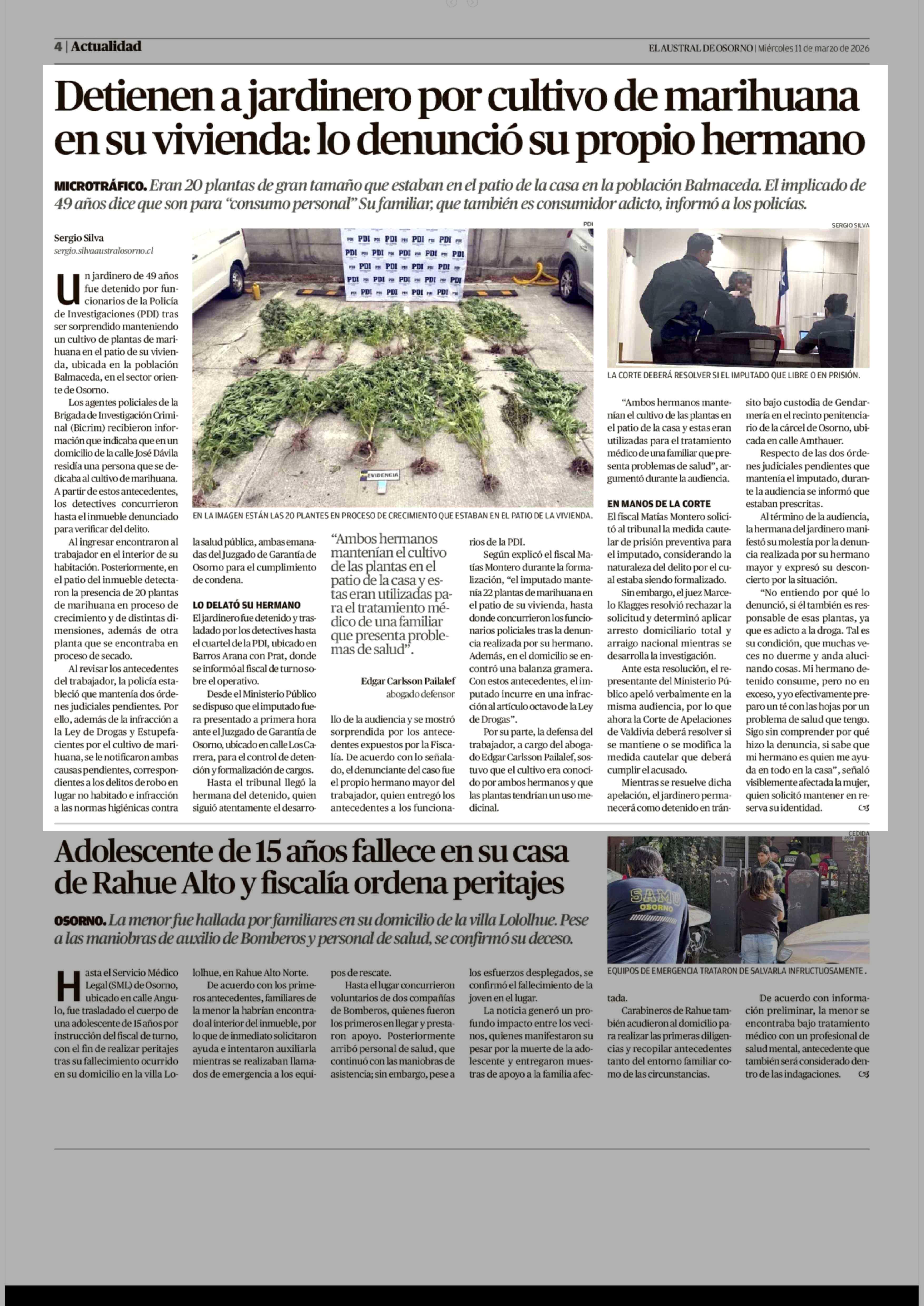 Detienen a jardinero por cultivo de marihuana en su vivienda: lo denunció su propio hermano 11-03-2026 El Austral de Osorno |