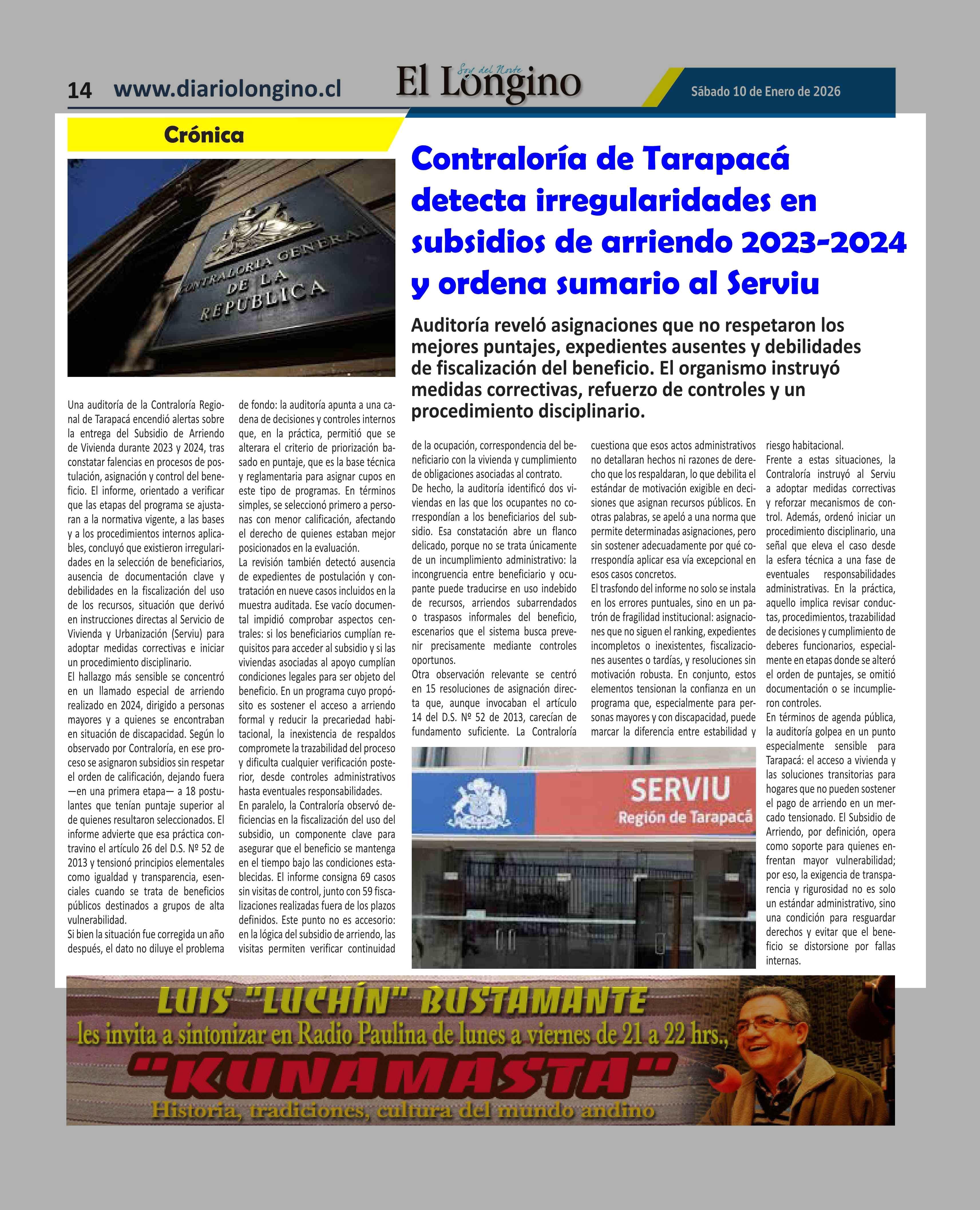 Título: Contraloría de Tarapacá detecta irregularidades en subsidios de arriendo 2023-2024 y ordena sumario al Serviu