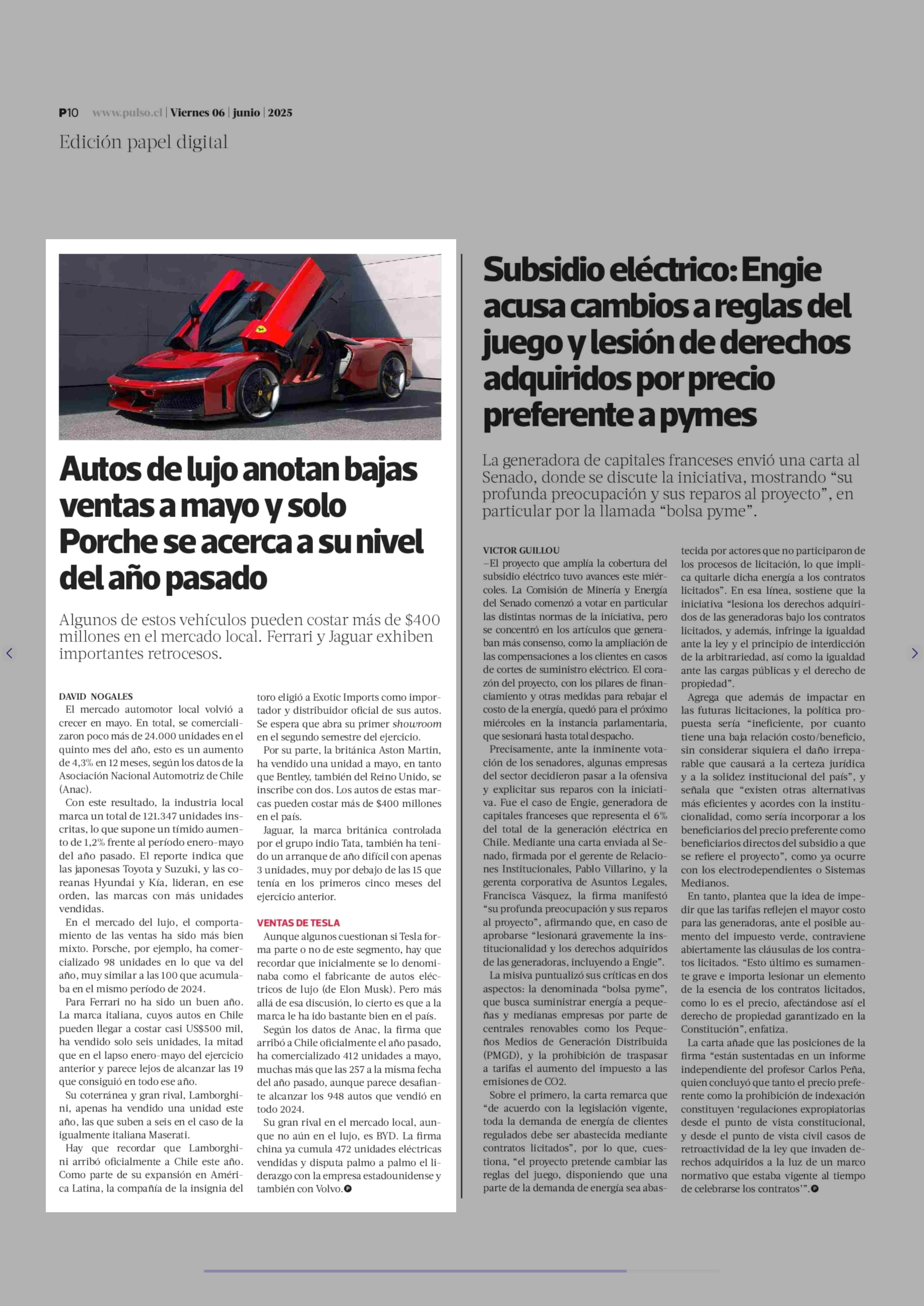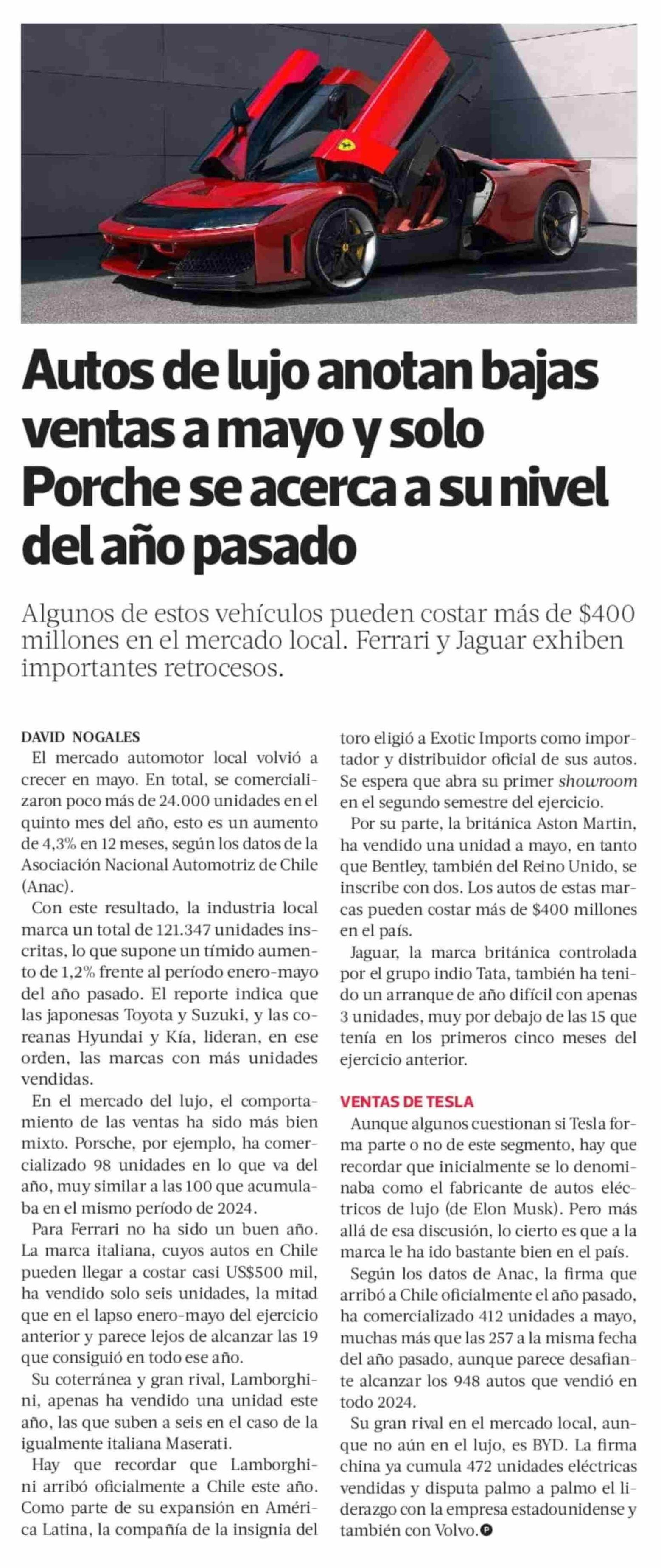 Autos de lujo anotan bajas ventas a mayo y solo Porche se acerca a sunivel del año pasado 06-06-2025 La Tercera |