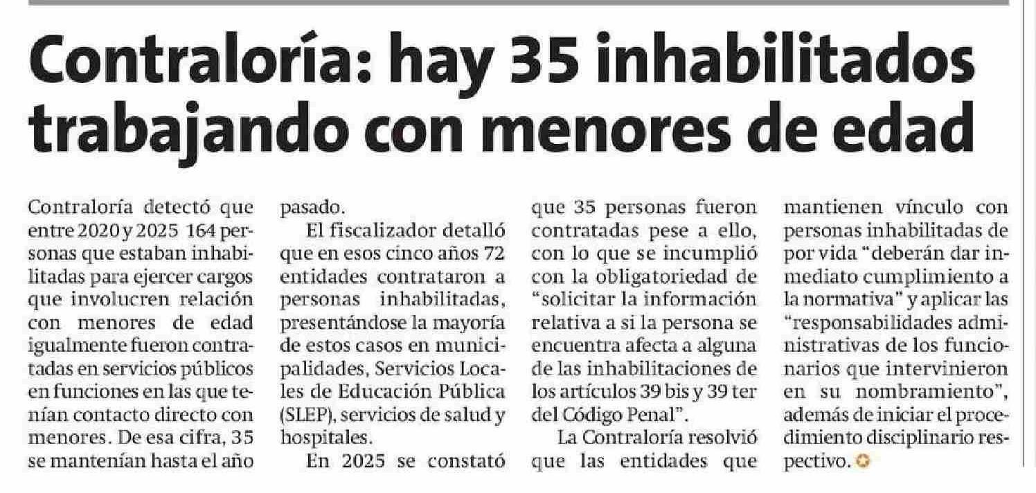 Título: Contraloría: hay 35 inhabilitados trabajando con menores de edad