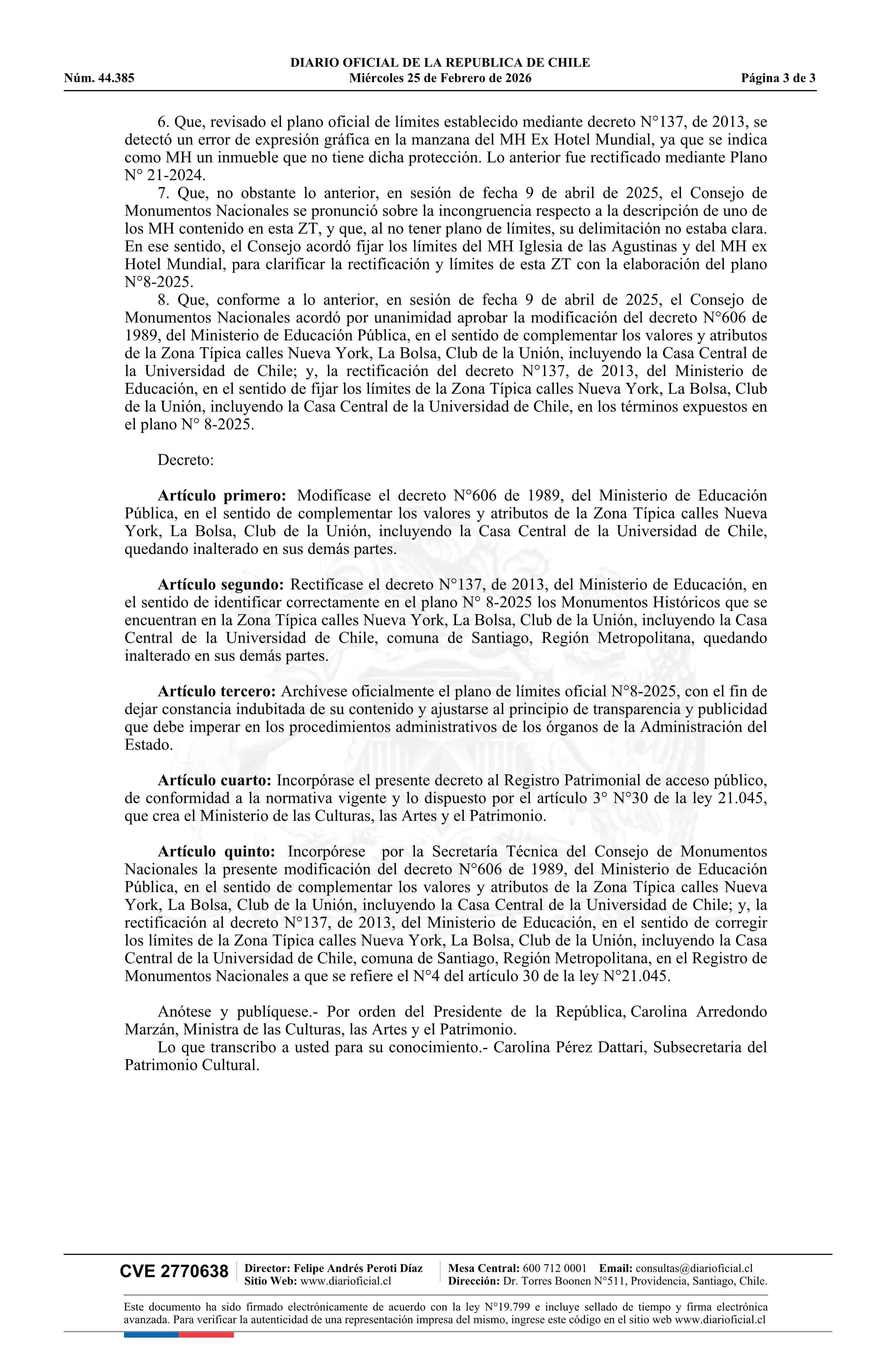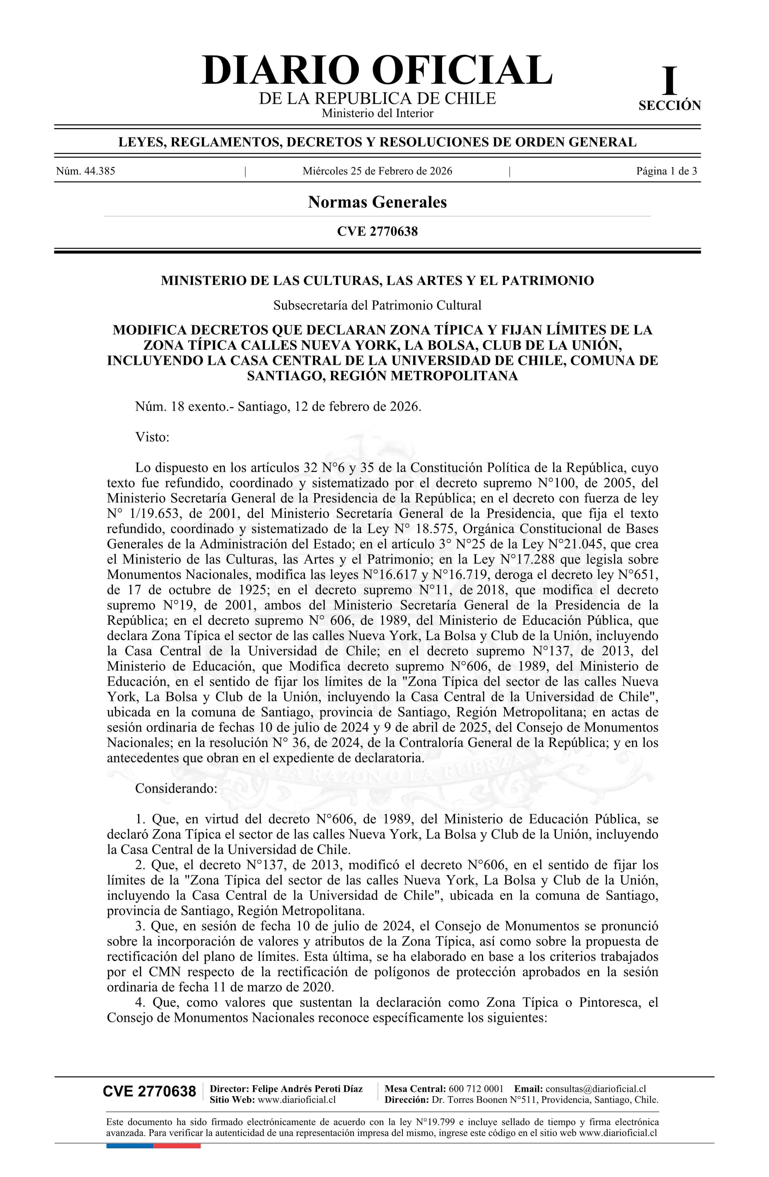 Título: Decreto exento número 18, de 2026.- Modifica decretos que declaran zona típica y fijan límites de la Zona Típica calles Nueva York, La Bolsa, Club de la Unión, incluyendo la Casa Central de la Universidad de Chile, comuna de Santiago, Región Metropolitana