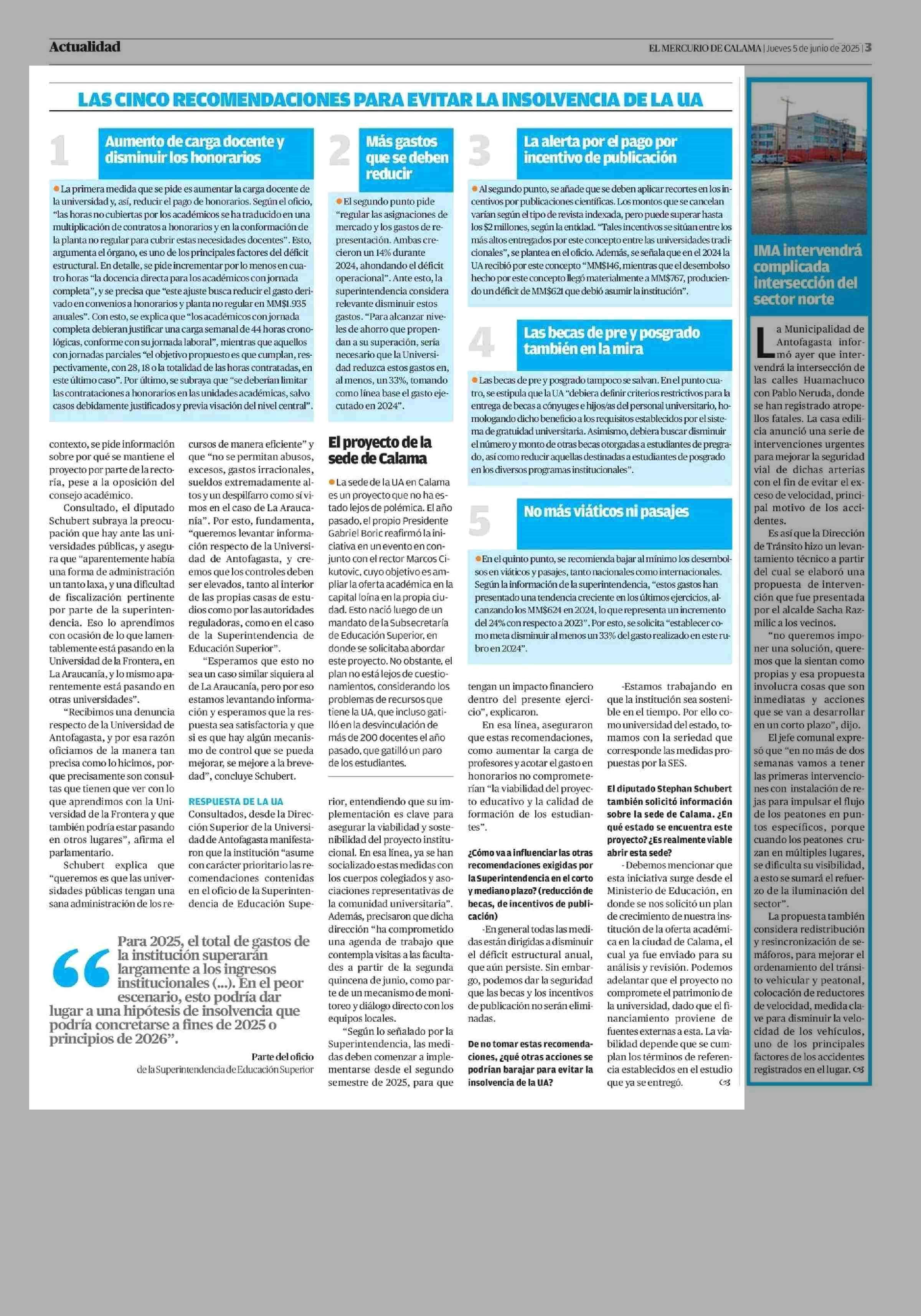 Ante déficit de $8.279 millones en la UA: Superintendencia recomienda severos recortes para evitar insolvencia financiera 05-06-2025 El Mercurio de Calama |