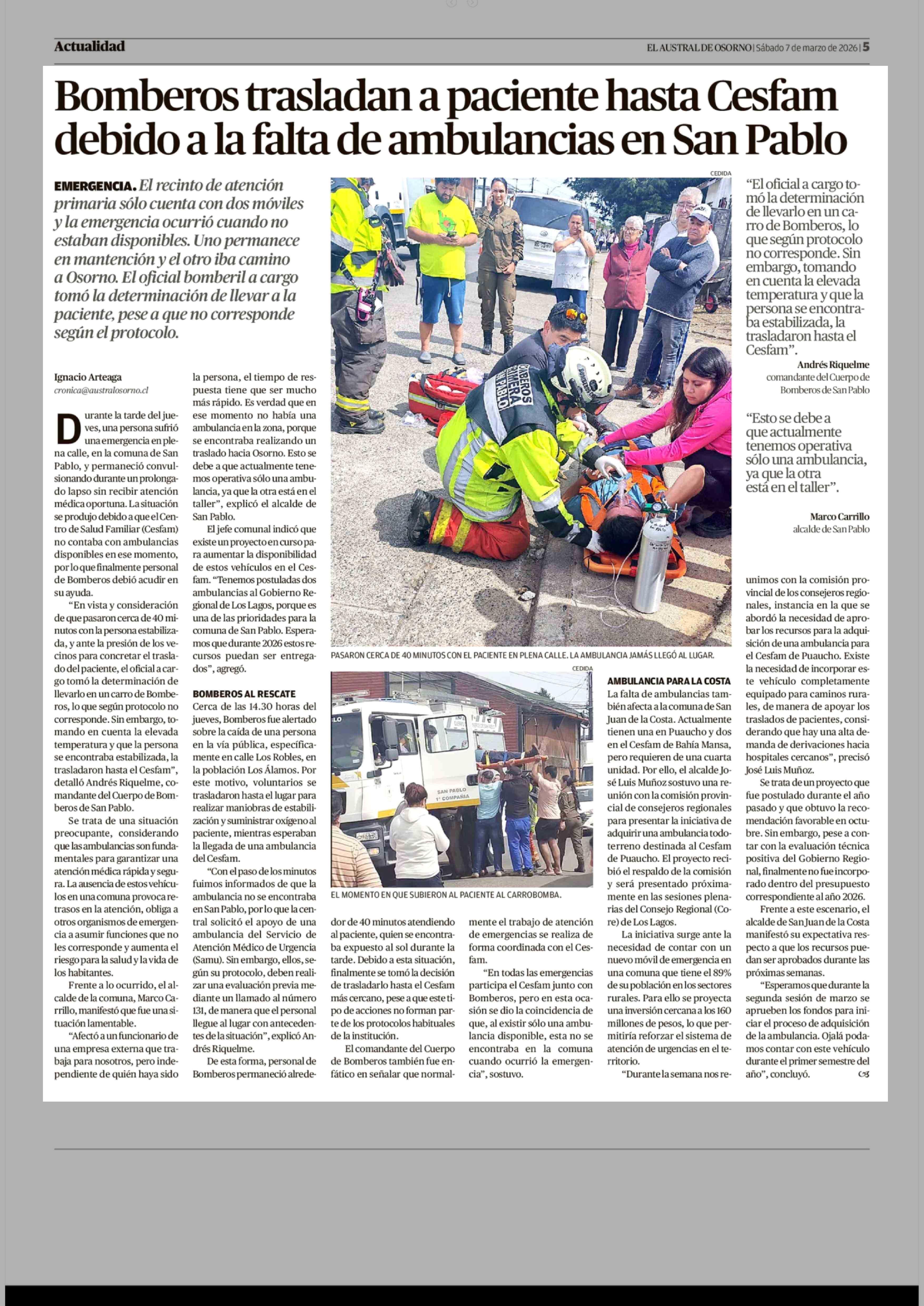 Bomberos trasladan a paciente hasta Cesfam debido a la falta de ambulancias en San Pablo 07-03-2026 El Austral de Osorno |