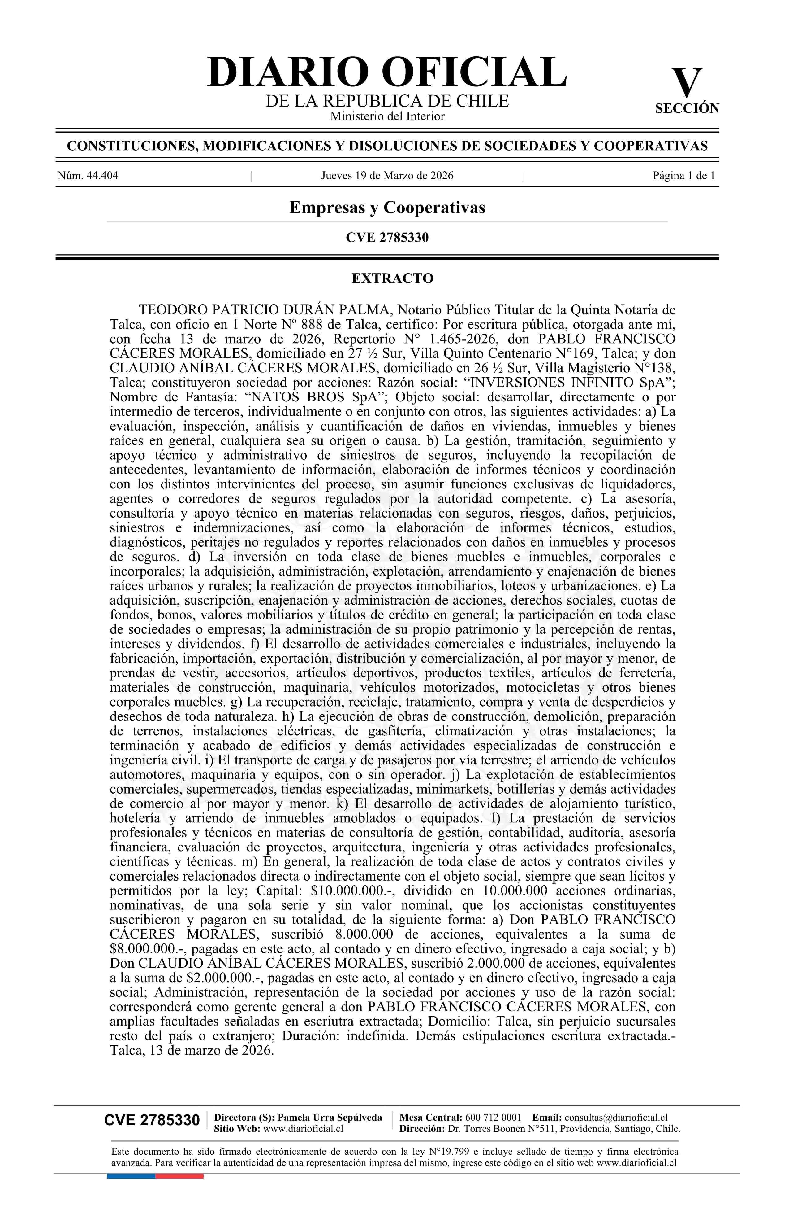 Título: INVERSIONES INFINITO SpA