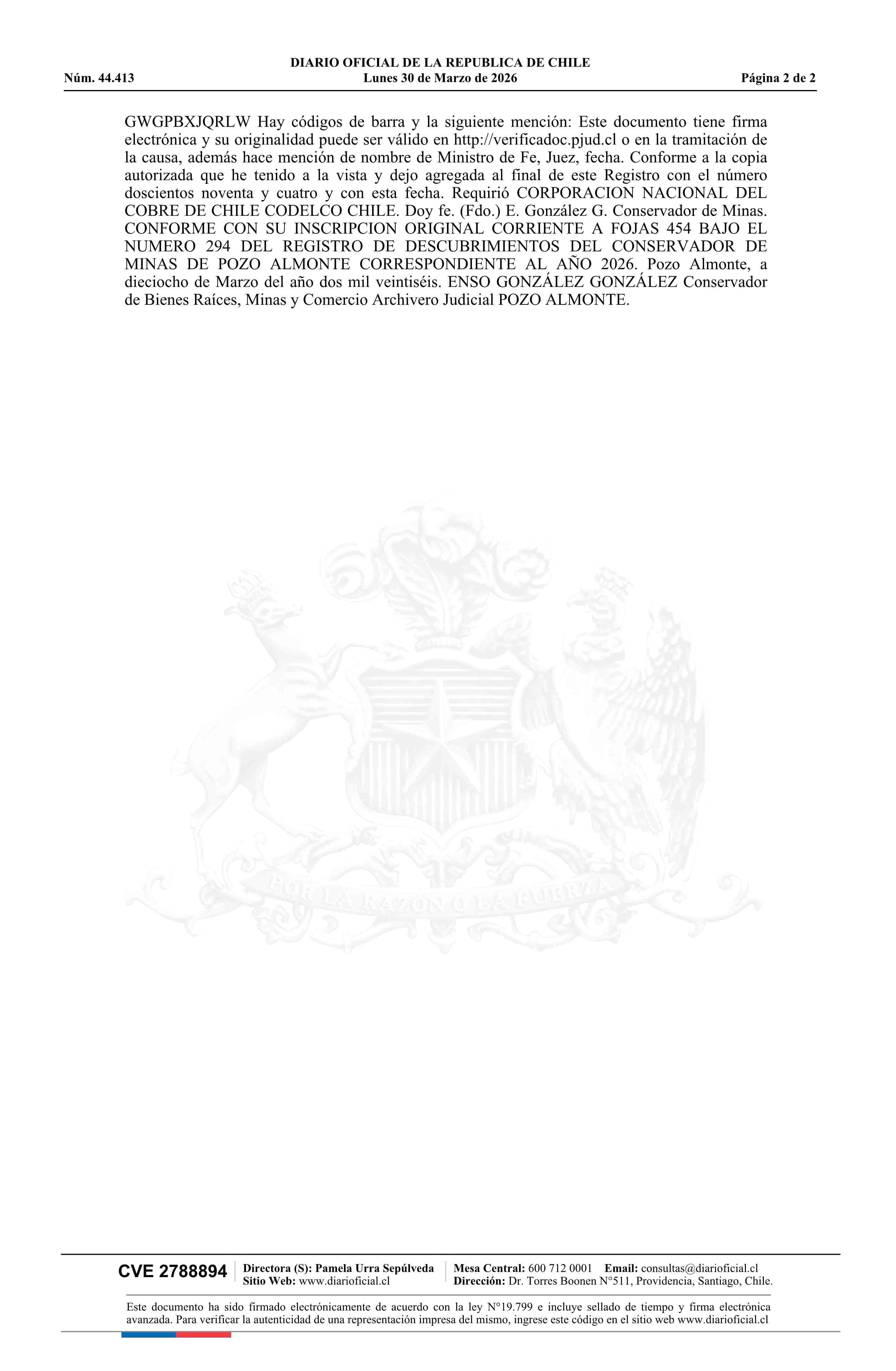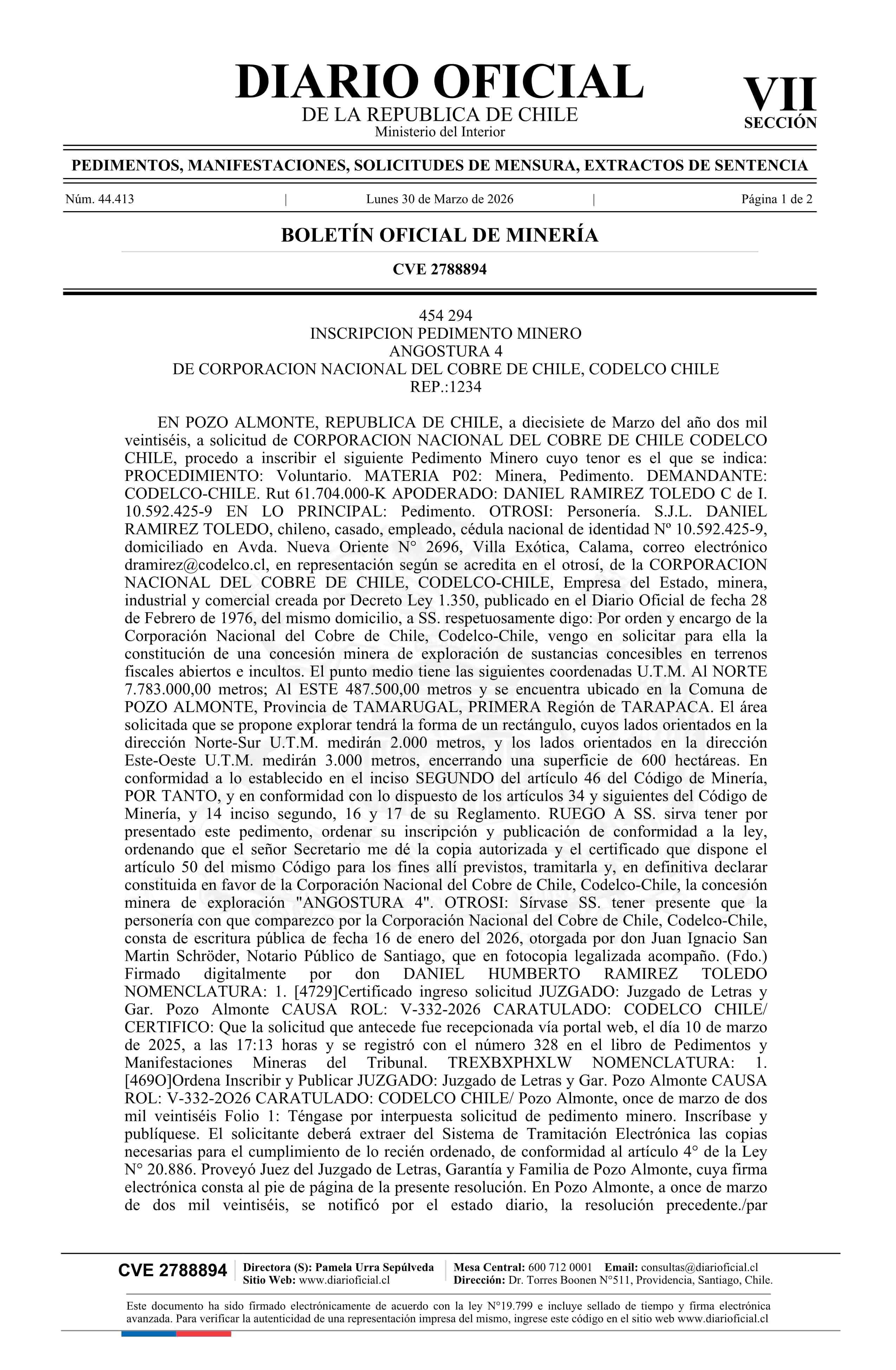 ANGOSTURA 4 / Corporación Nacional del Cobre de Chile 30-03-2026 DIARIO OFICIAL CHILE - BOLETÍN OFICIAL DE MINERÍA |
