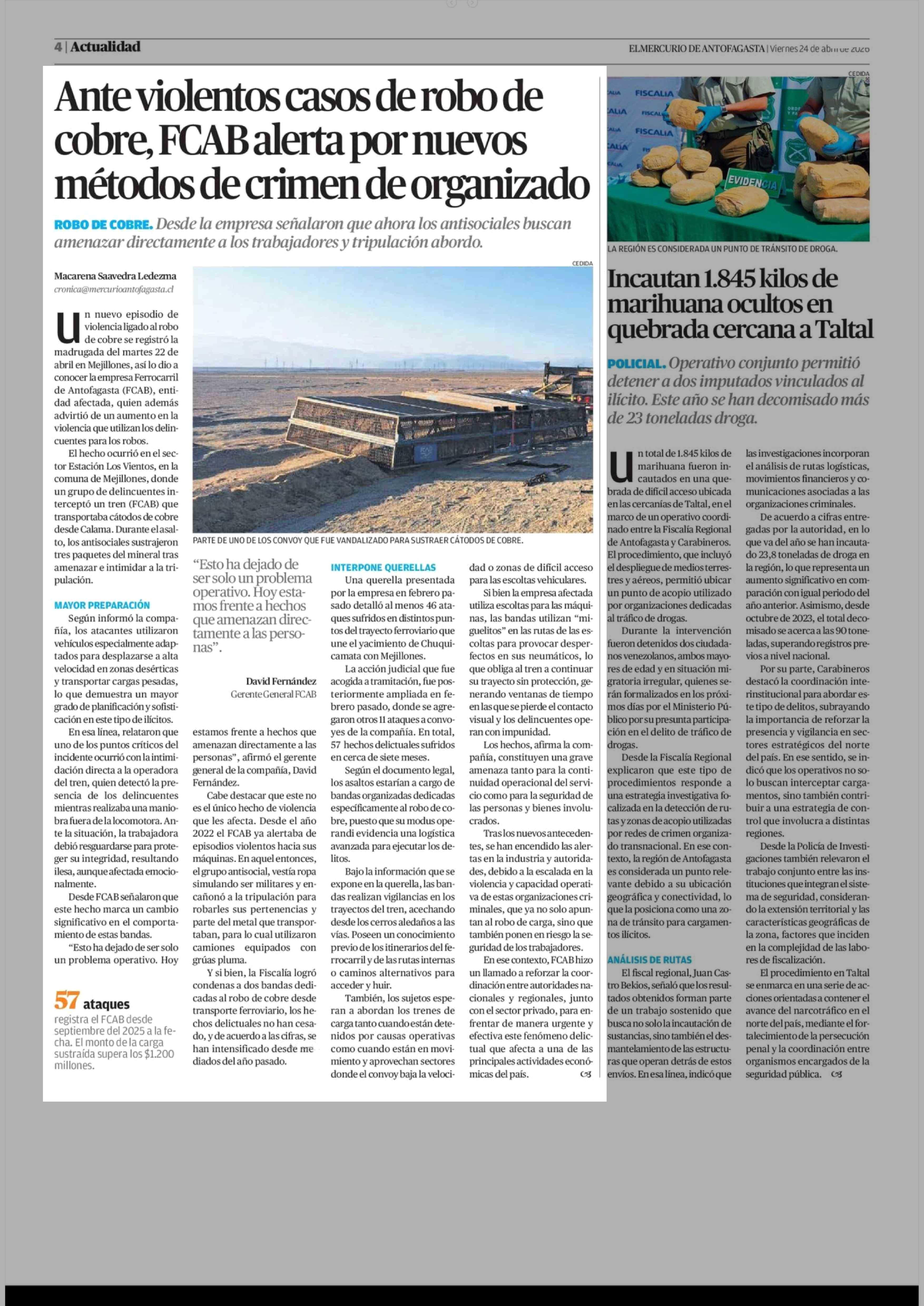 Título: Ante violentos casos de robo de cobre, FCAB alerta por nuevos métodos de crimen de organizado