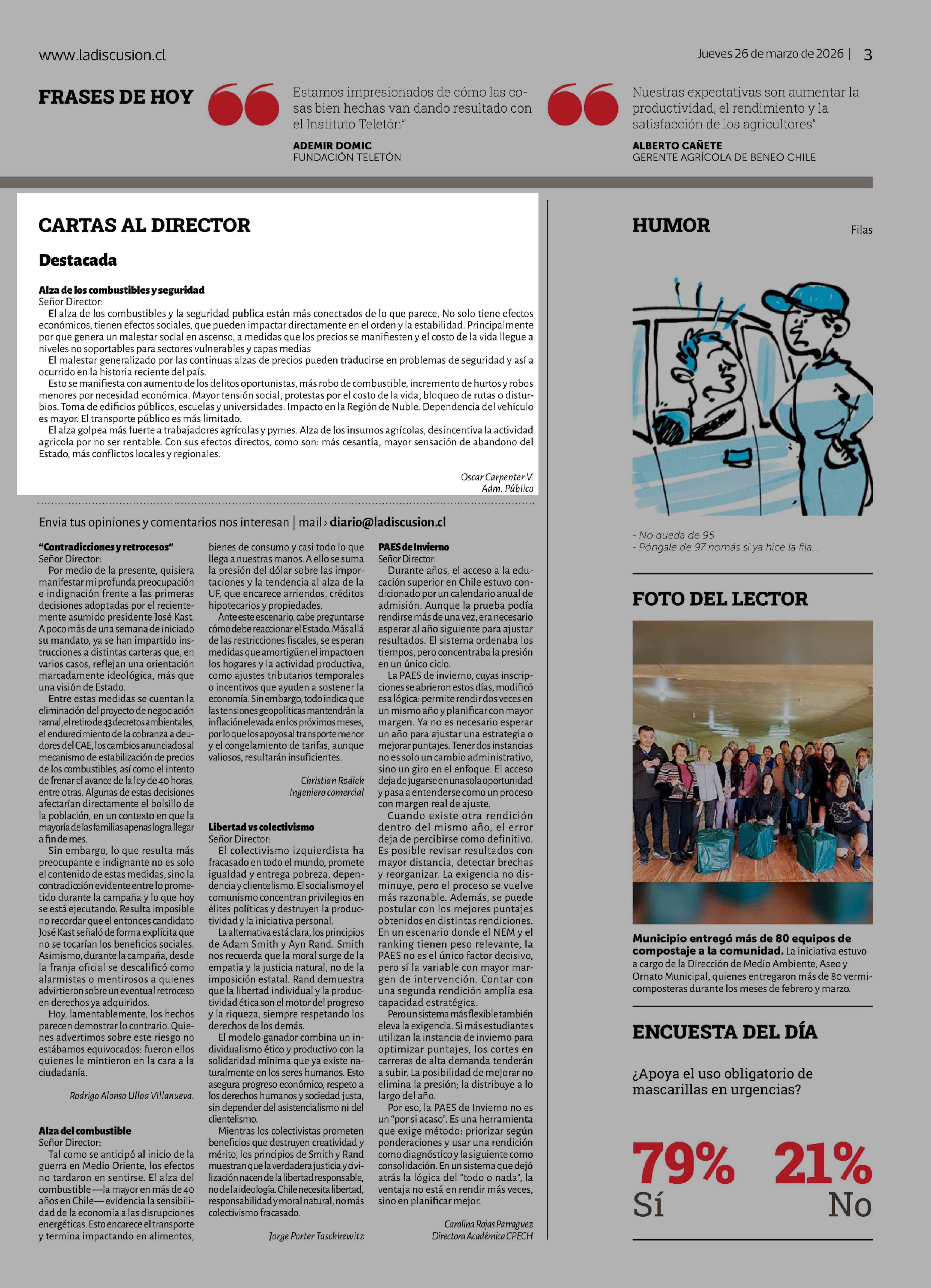 CARTAS: Alza de los combustibles y seguridad 26-03-2026 La Discusión |