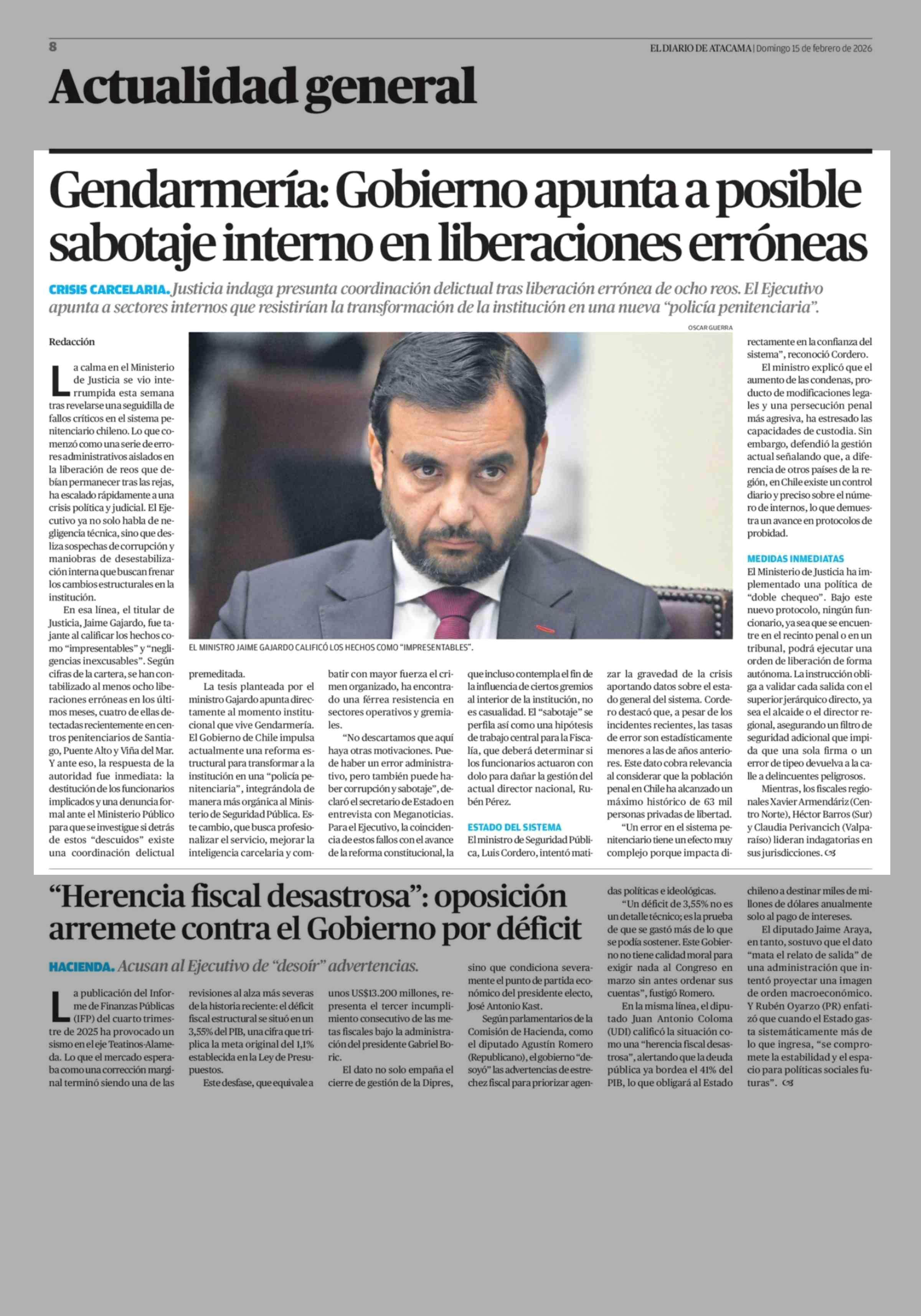 Gendarmería: Gobierno apunta a posible sabotaje interno en liberaciones erróneas 15-02-2026 El Diario de Atacama |