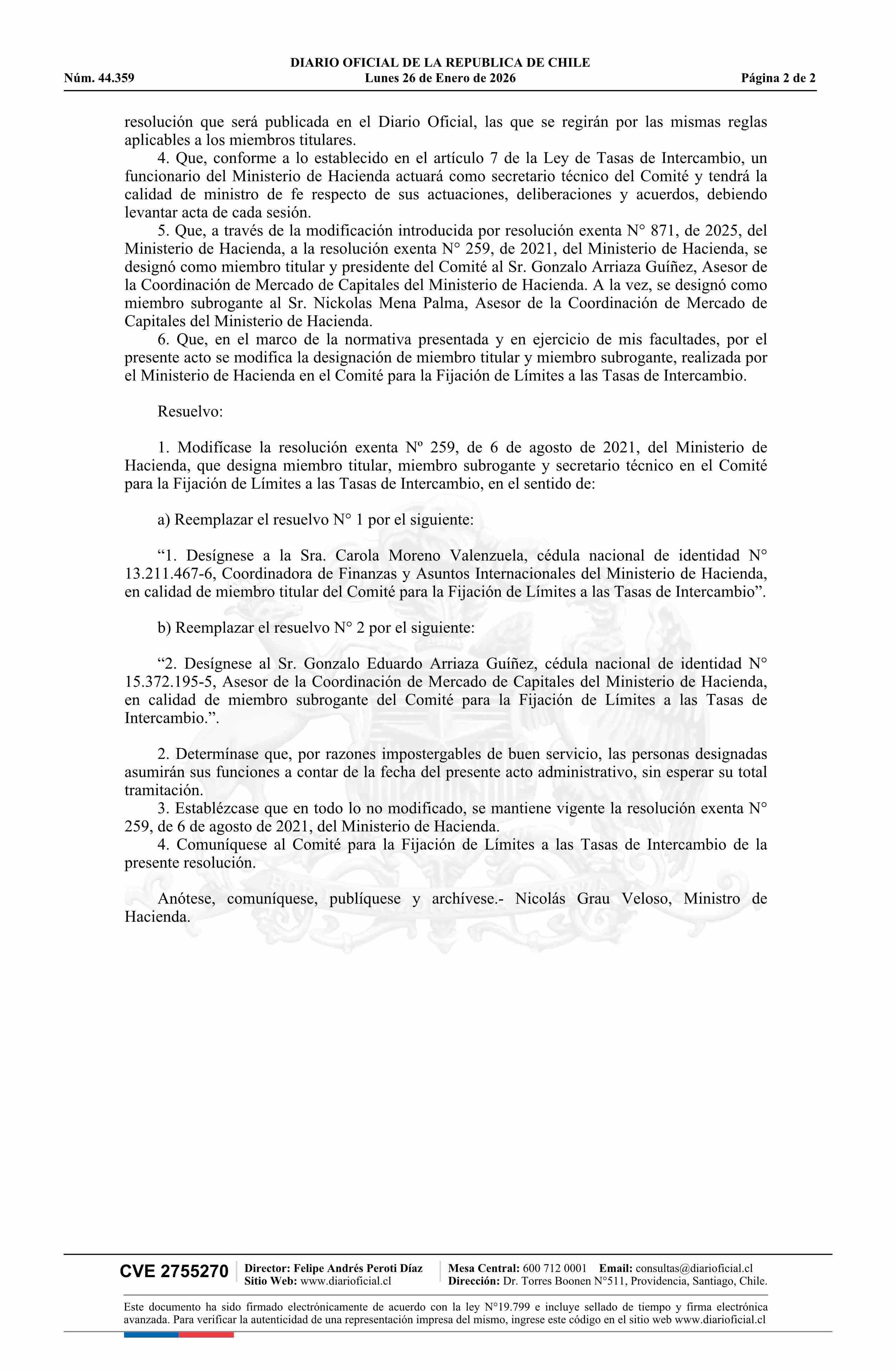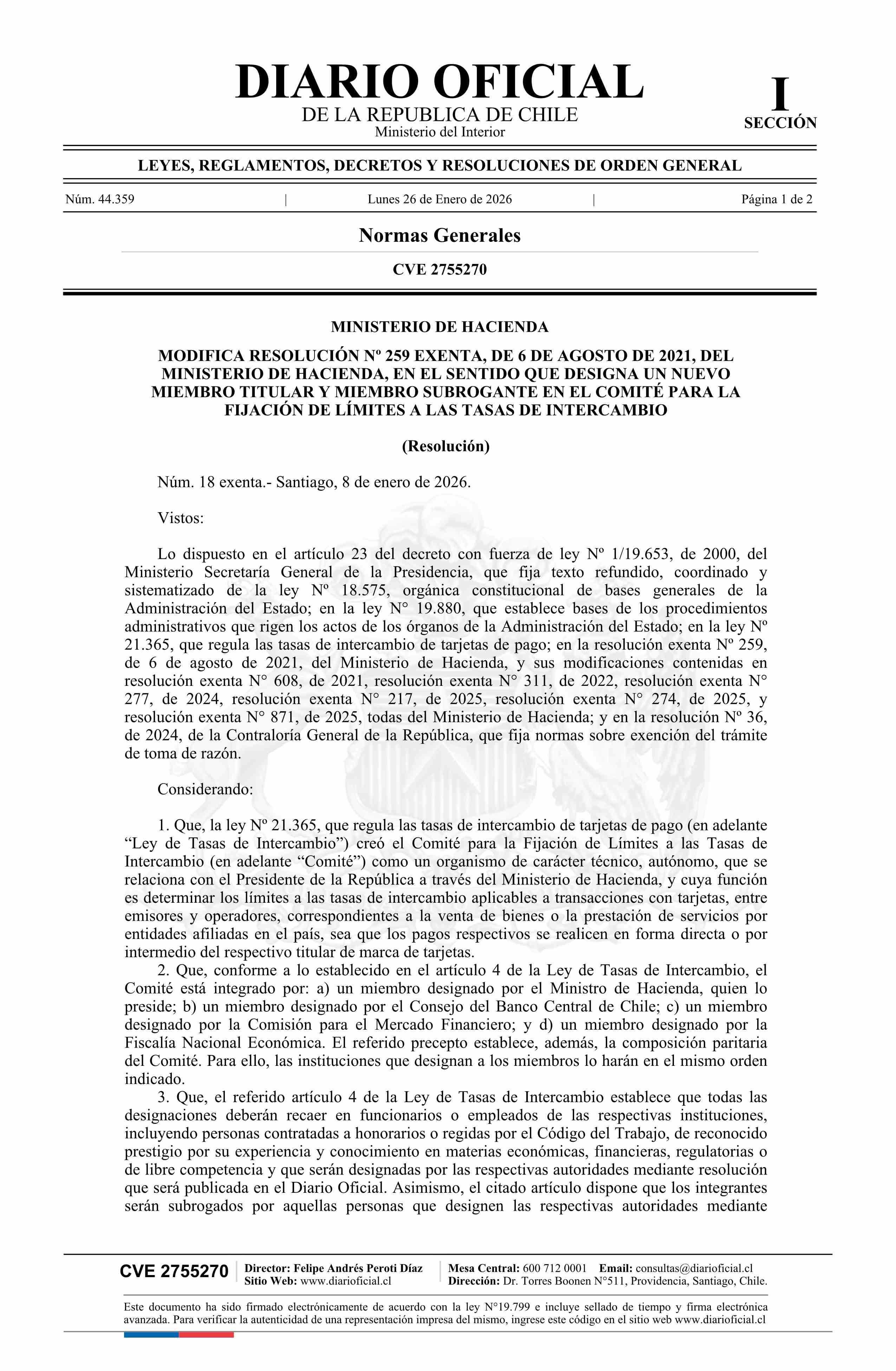 Resolución exenta número 18, de 2026.- Modifica resolución Nº 259 exenta, de 2021, en el sentido que designa un nuevo miembro titular y miembro subrogante en el Comité para la Fijación de Límites a las Tasas de Intercambio 26-01-2026 DIARIO OFICIAL CHILE - BOLETÍN OFICIAL DE MINERÍA |