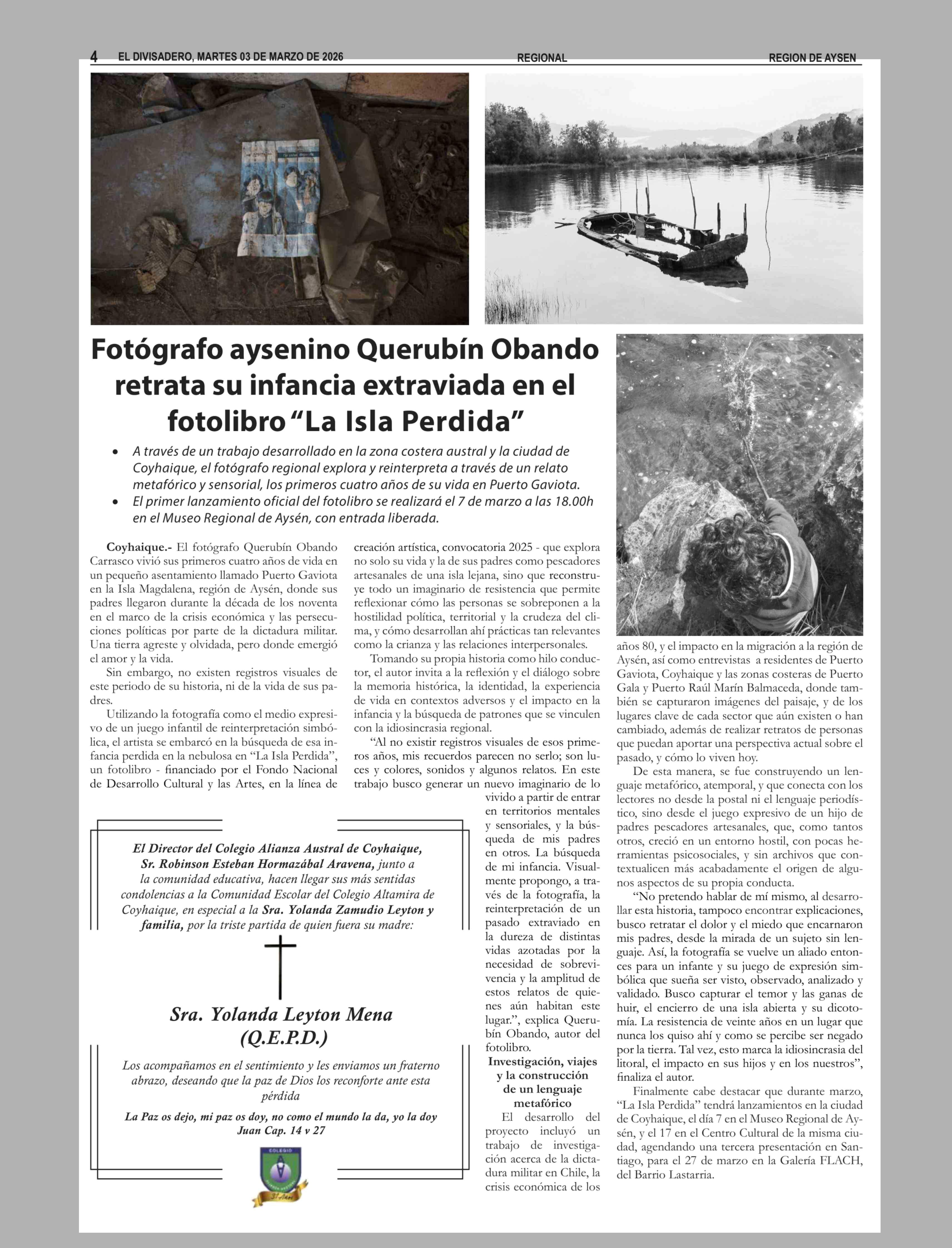 Fotógrafo aysenino Querubín Obando retrata su infancia extraviada en el fotolibro "La Isla Perdida" 03-03-2026 El Divisadero |