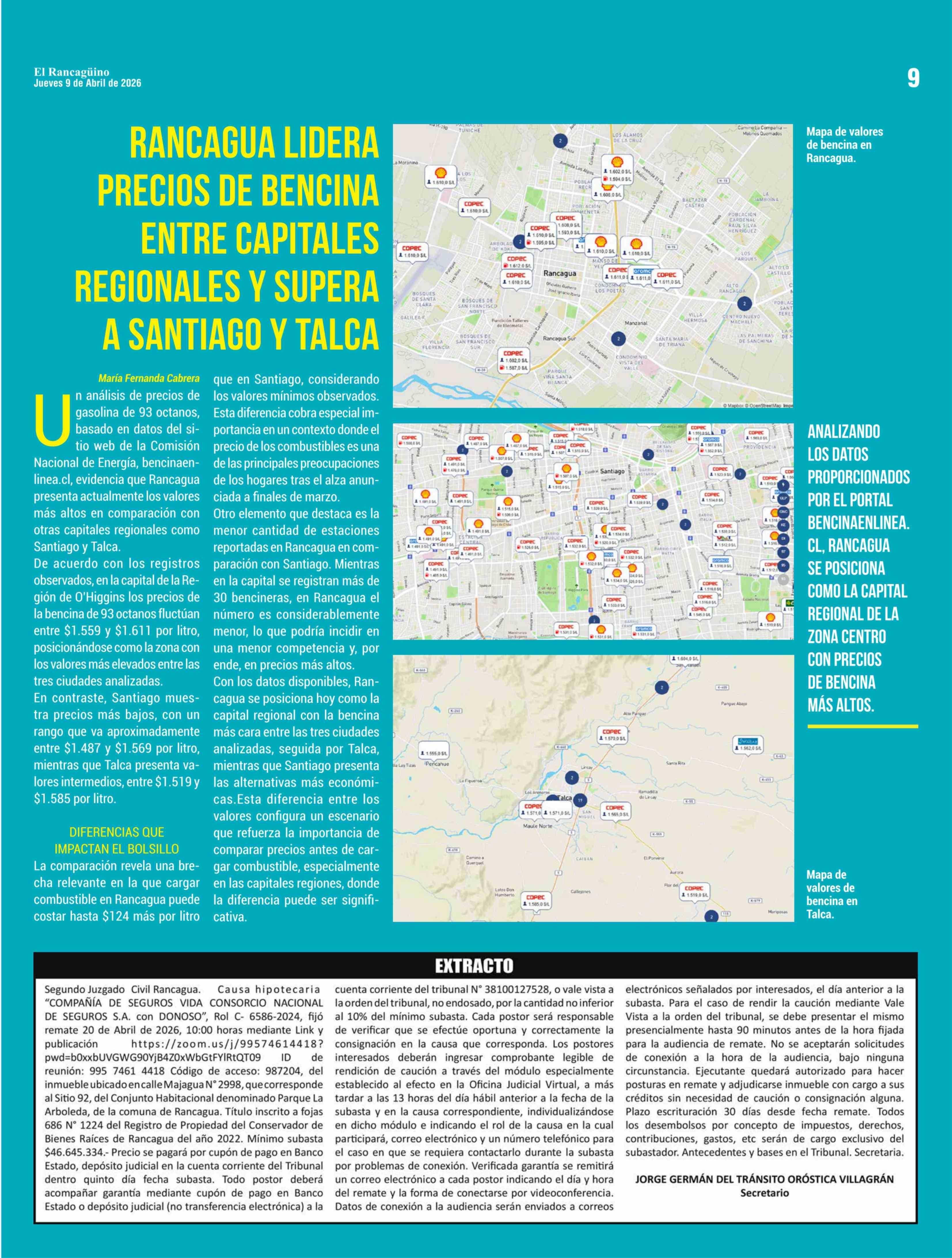 RANCAGUA LIDERA PRECIOS DE BENCINA ENTRE CAPITALES REGIONALES Y SUPERA A SANTIAGO Y TALCA 09-04-2026 El Rancagüino |