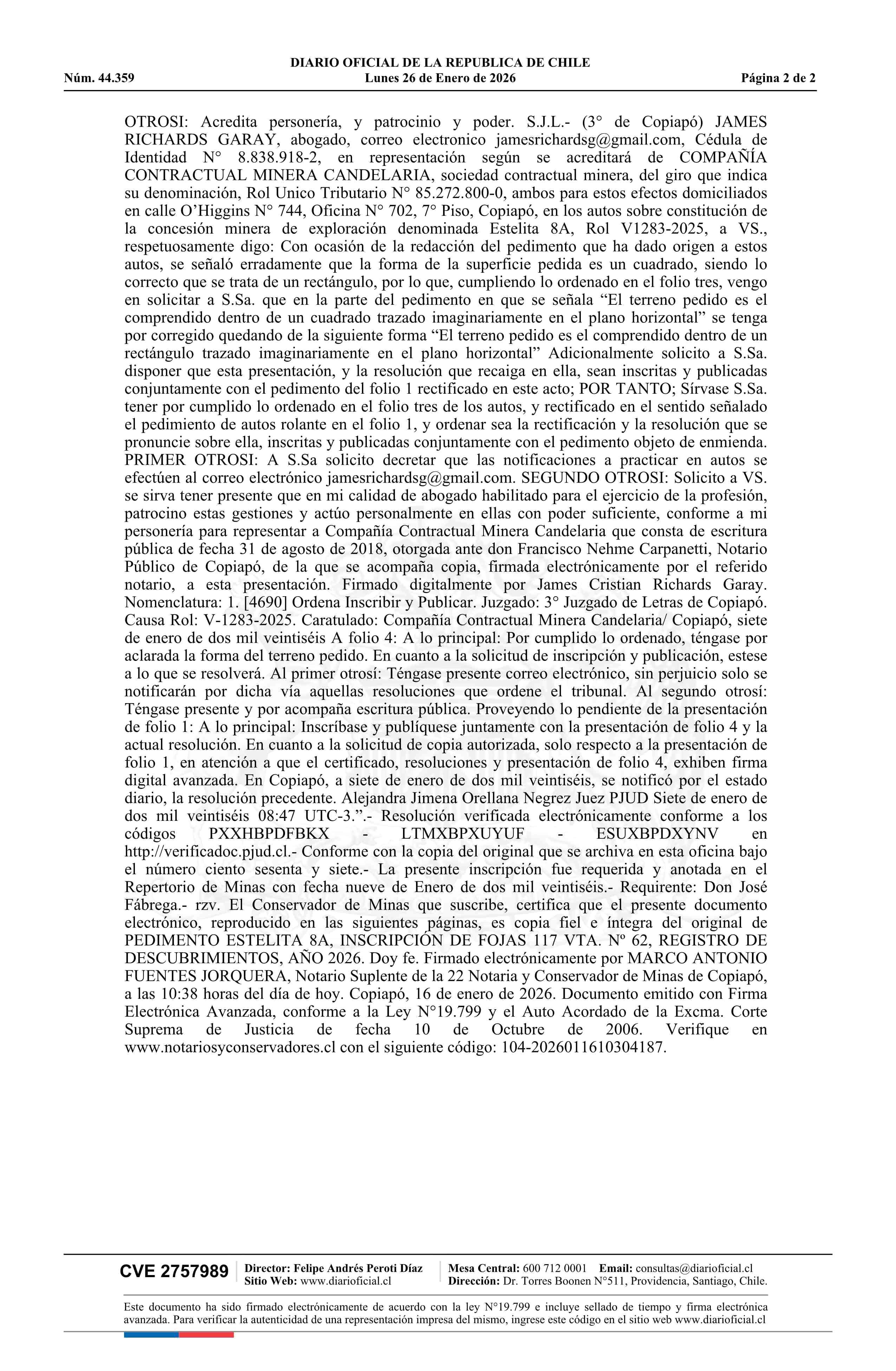 ESTELITA 8A / CCM Candelaria 26-01-2026 DIARIO OFICIAL CHILE - BOLETÍN OFICIAL DE MINERÍA |