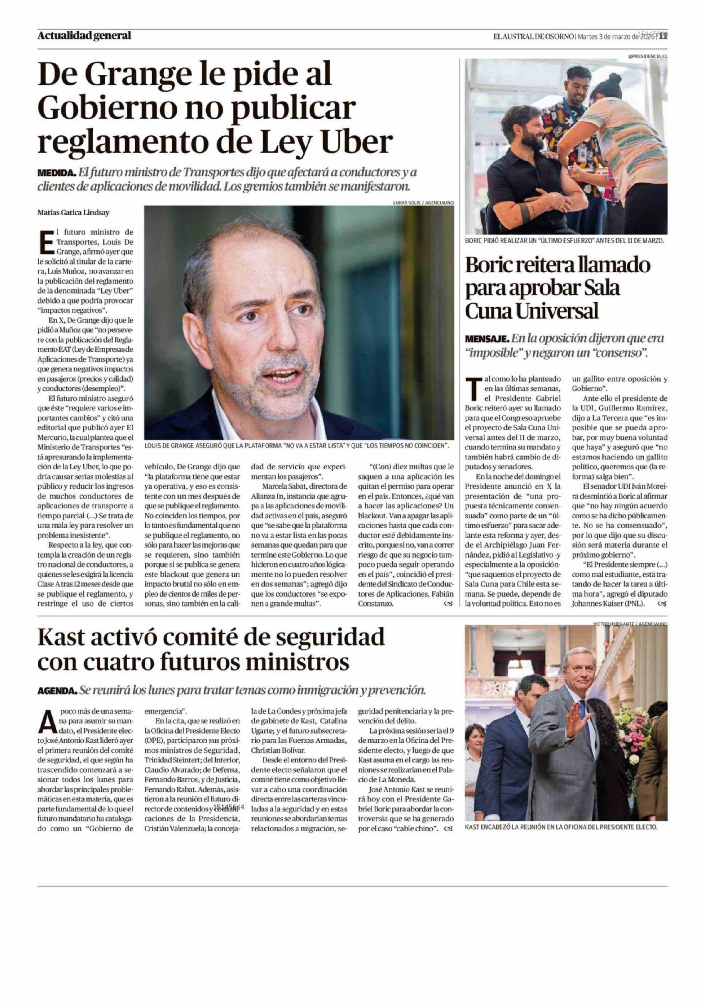 Título: De Grange le pide al Gobierno no publicar reglamento de Ley Uber