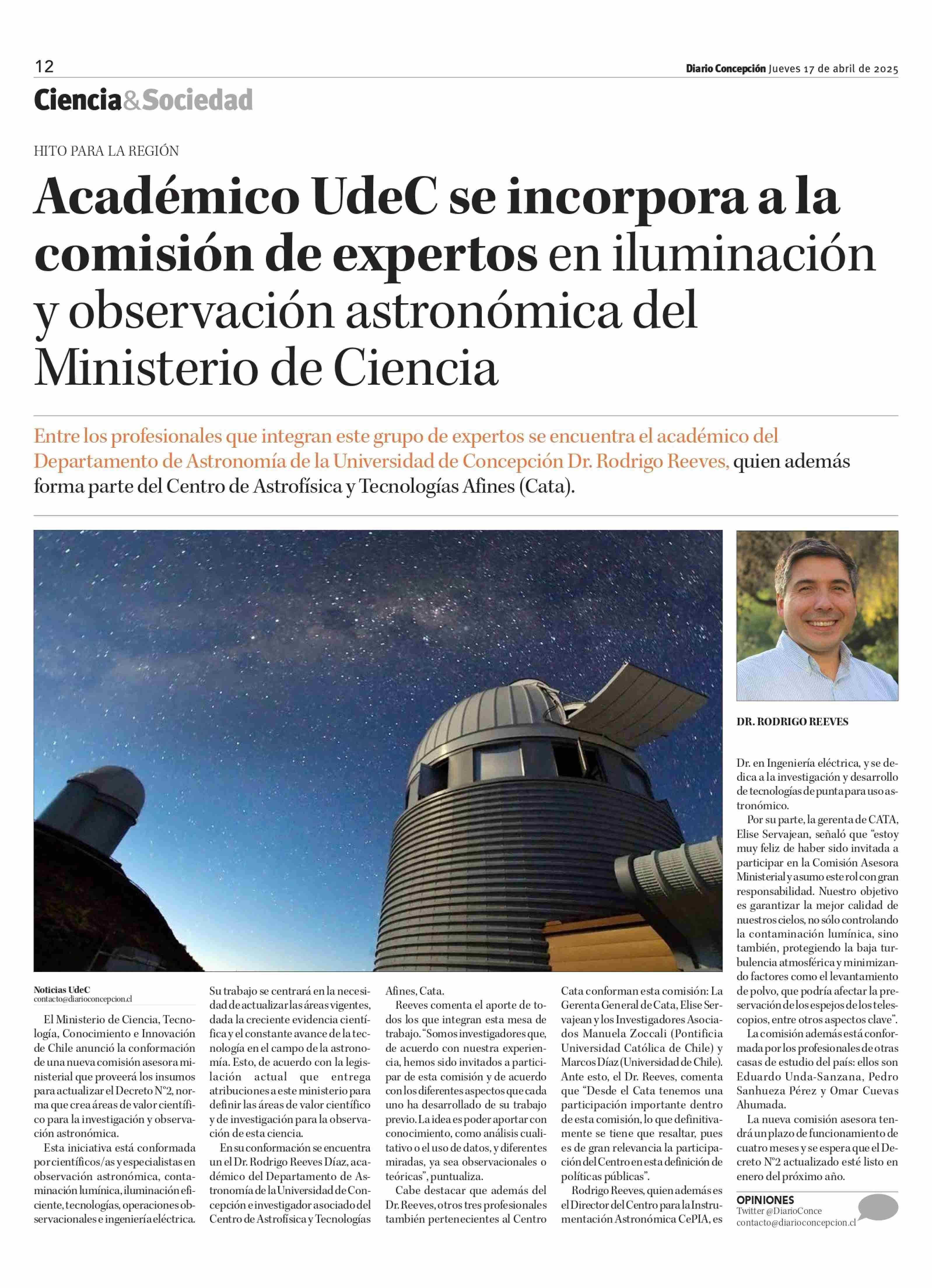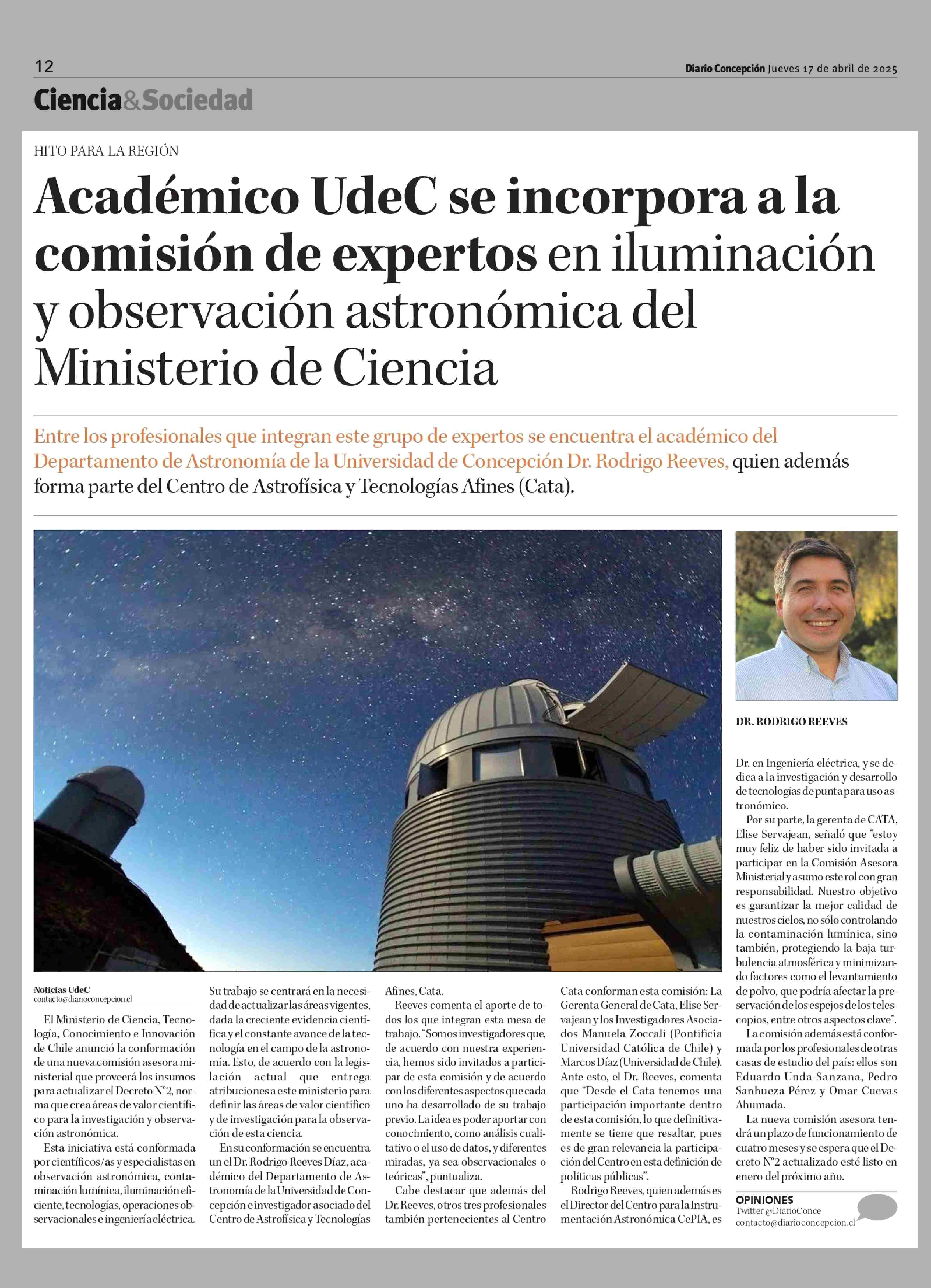 Académico UdeC se incorpora a la comisión de expertos en iluminación y observación astronómica del Ministerio de Ciencia 17-04-2025 Diario Concepción |