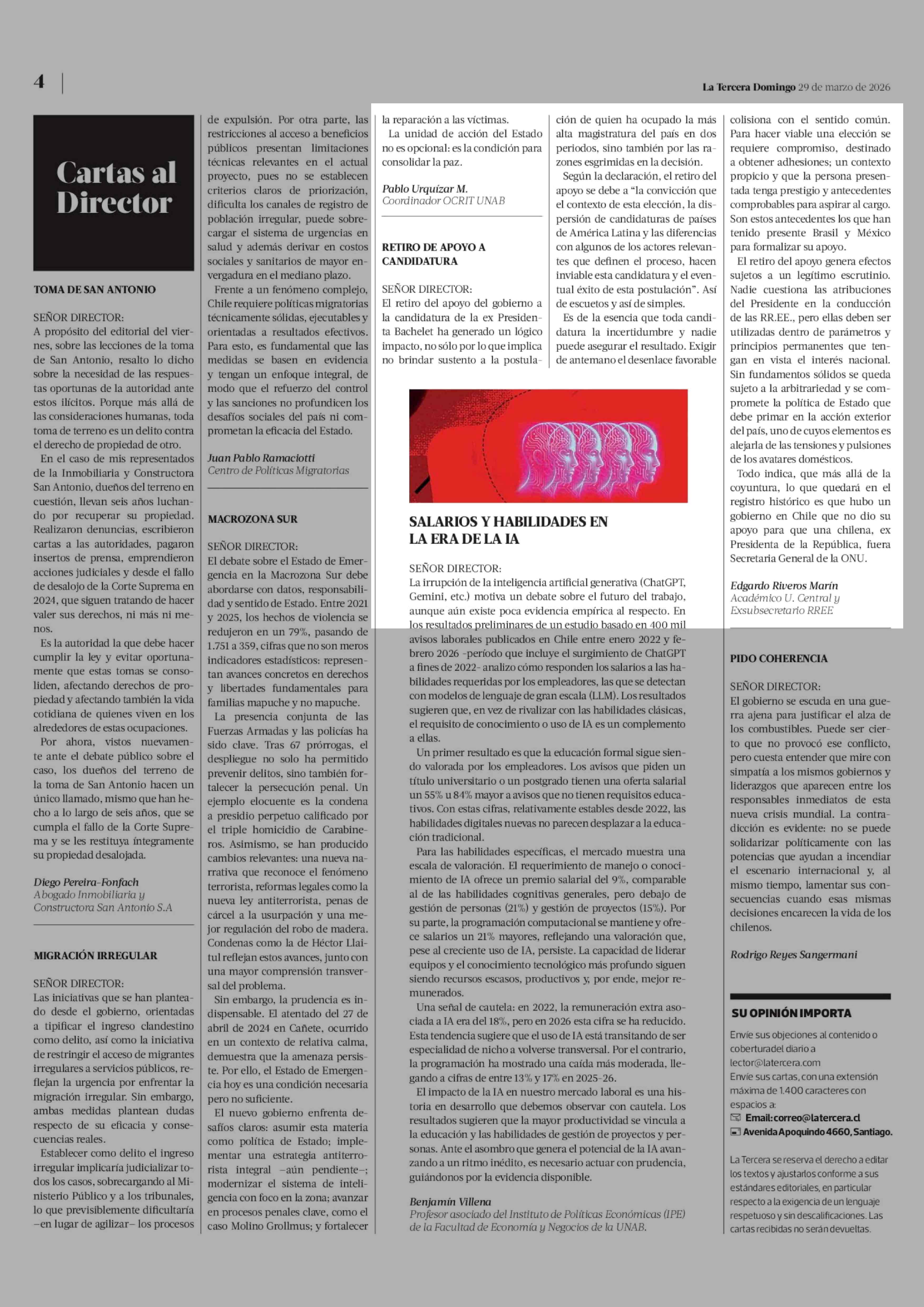 Cartas: RETIRO DE APOYO A CANDIDATURA 29-03-2026 La Tercera |