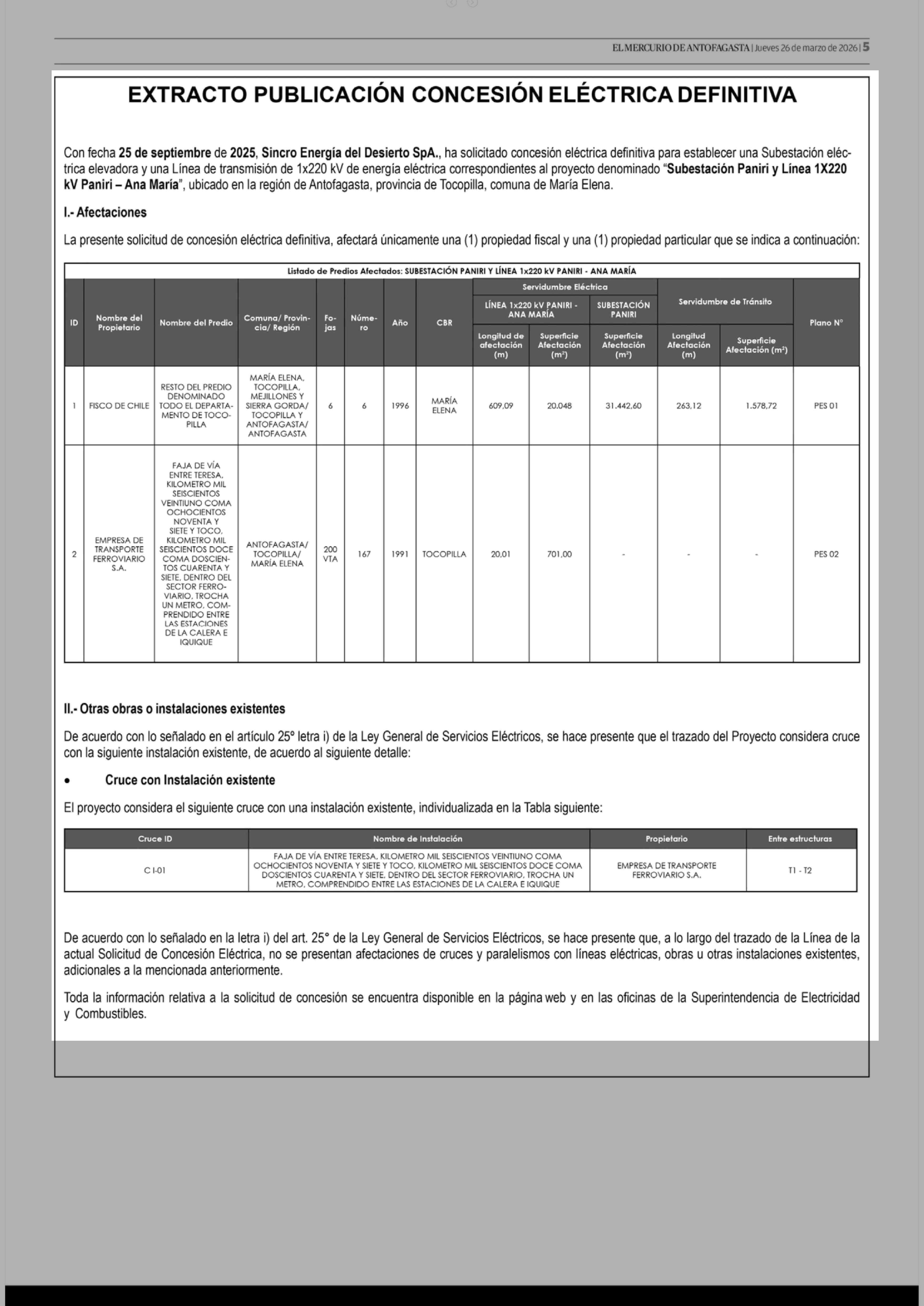 Extractos: EXTRACTO PUBLICACIÓN CONCESIÓN ELÉCTRICA DEFINITIVA 26-03-2026 El Mercurio de Antofagasta |