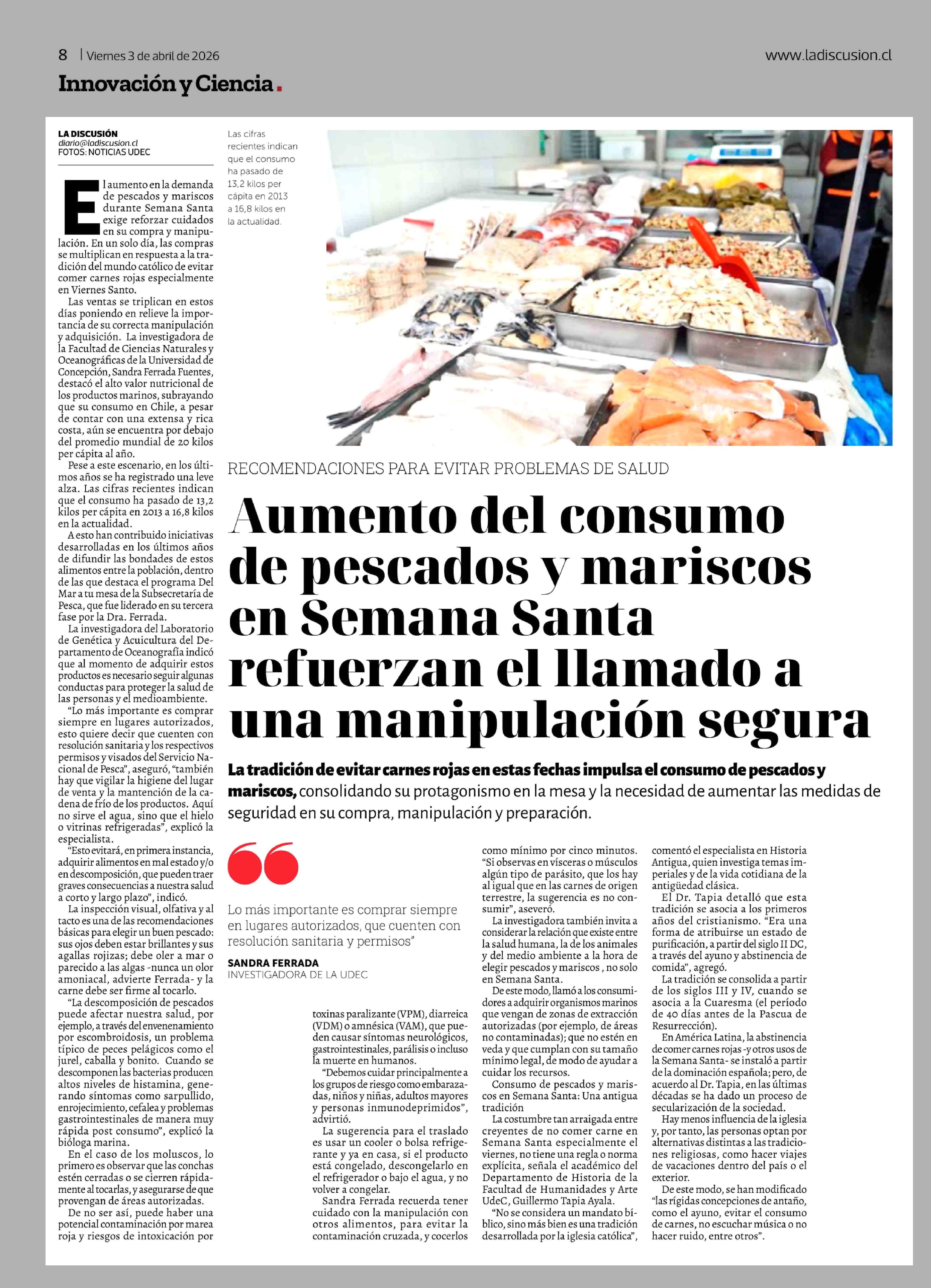 Aumento del consumo de pescados y mariscos en Semana Santa refuerzan el llamado a una manipulación segura 03-04-2026 La Discusión |