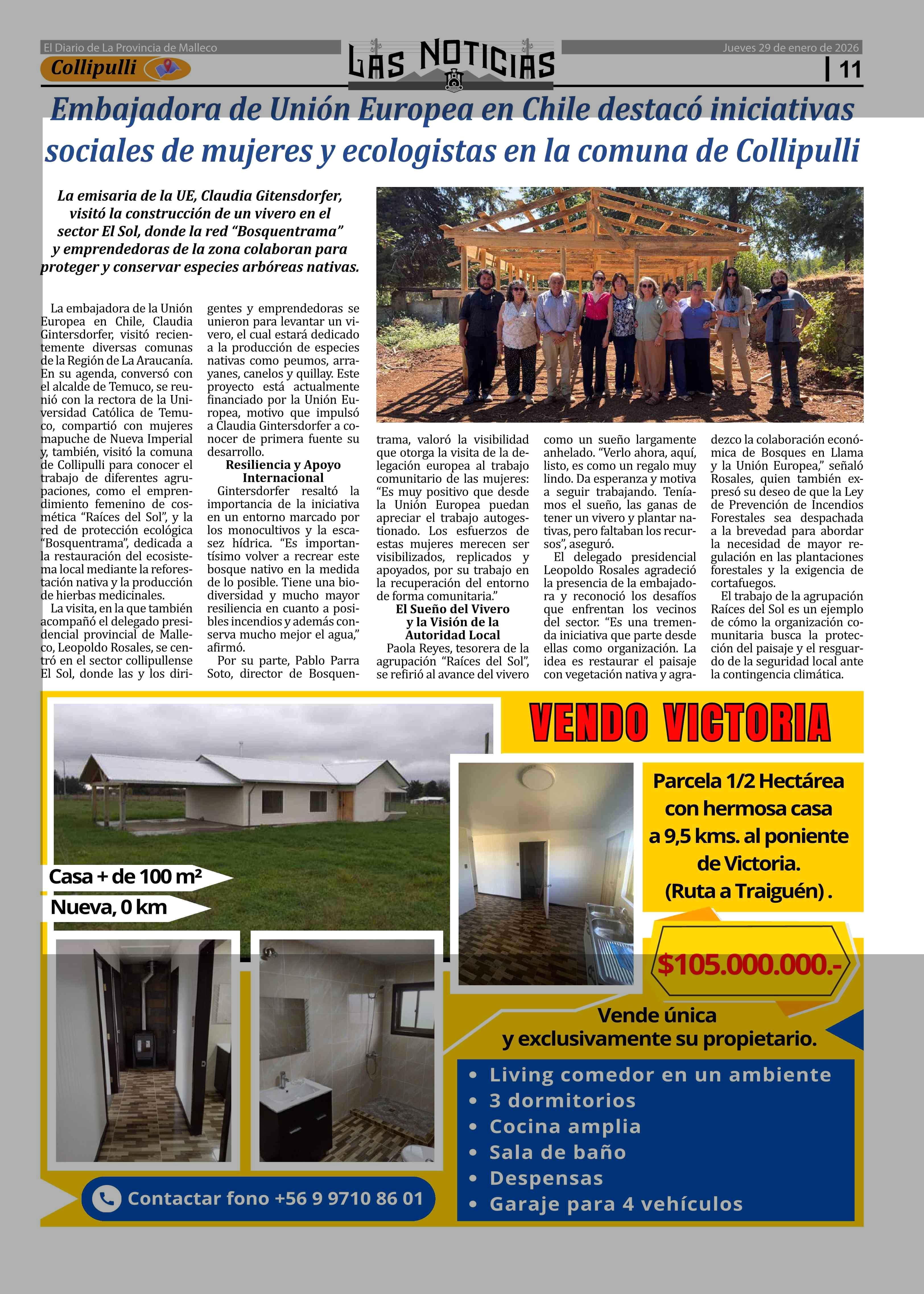 Embajadora de Unión Europea en Chile destacó iniciativas sociales de mujeres y ecologistas en la comuna de Collipulli 29-01-2026 Las Noticias |
