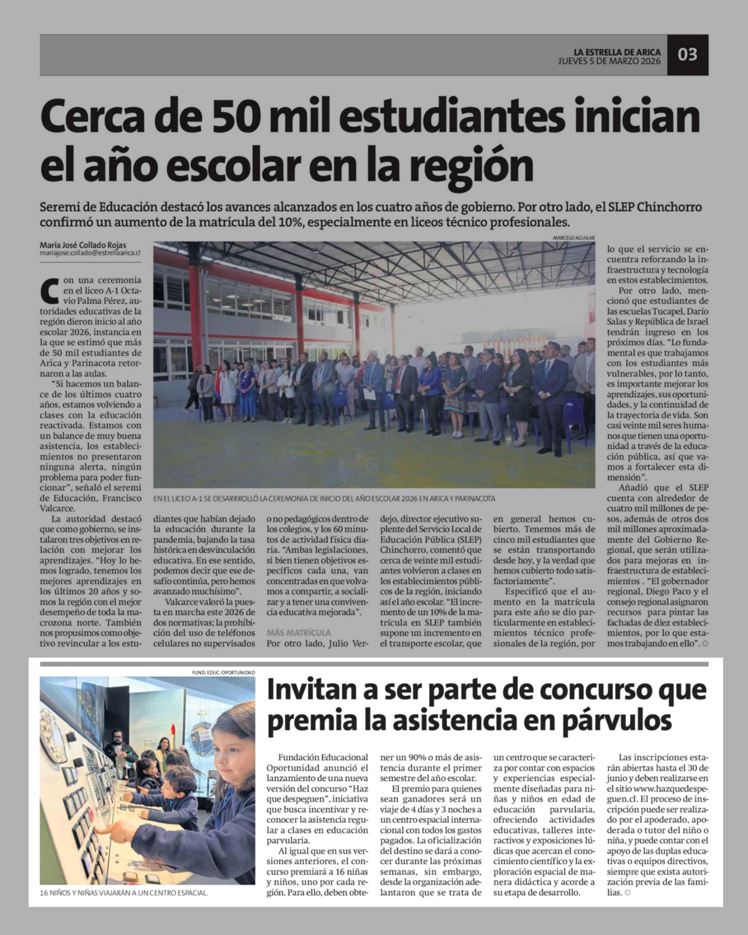 Invitan a ser parte de concurso que premia la asistencia en párvulos 05-03-2026 La Estrella de Arica |