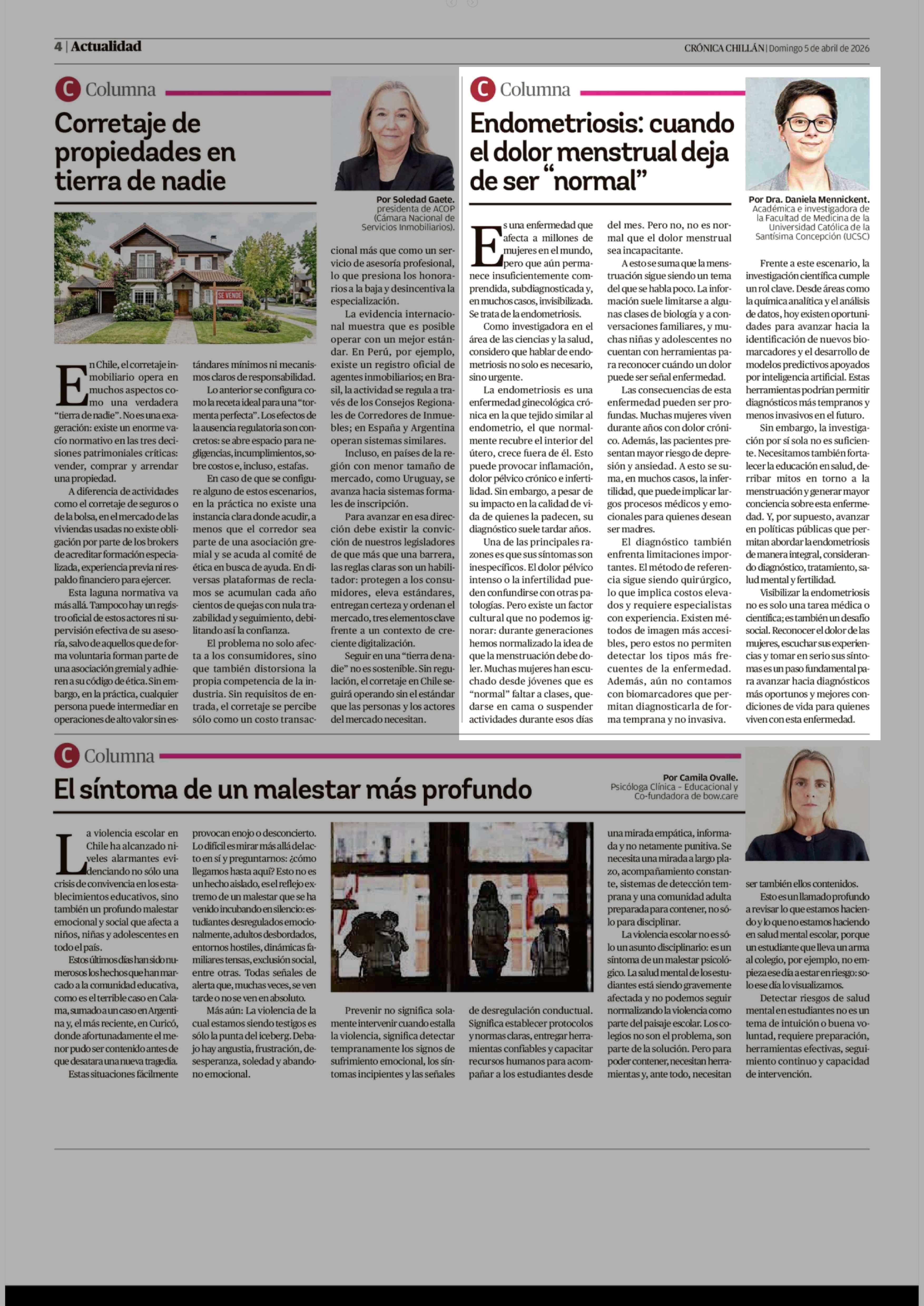 Columnas de Opinión: Endometriosis: cuando el dolor menstrual deja de ser "normal" 05-04-2026 Crónica de Chillán |
