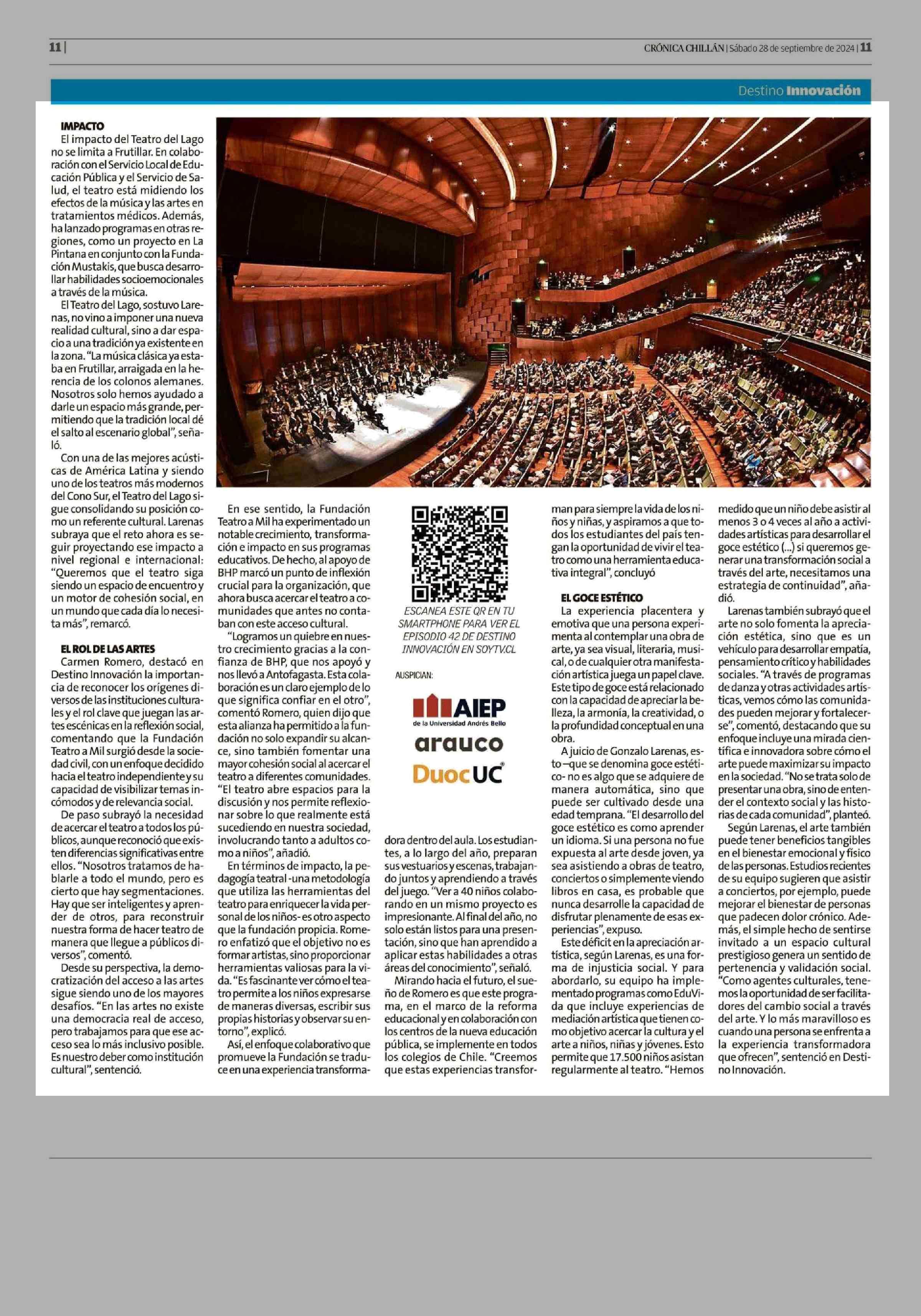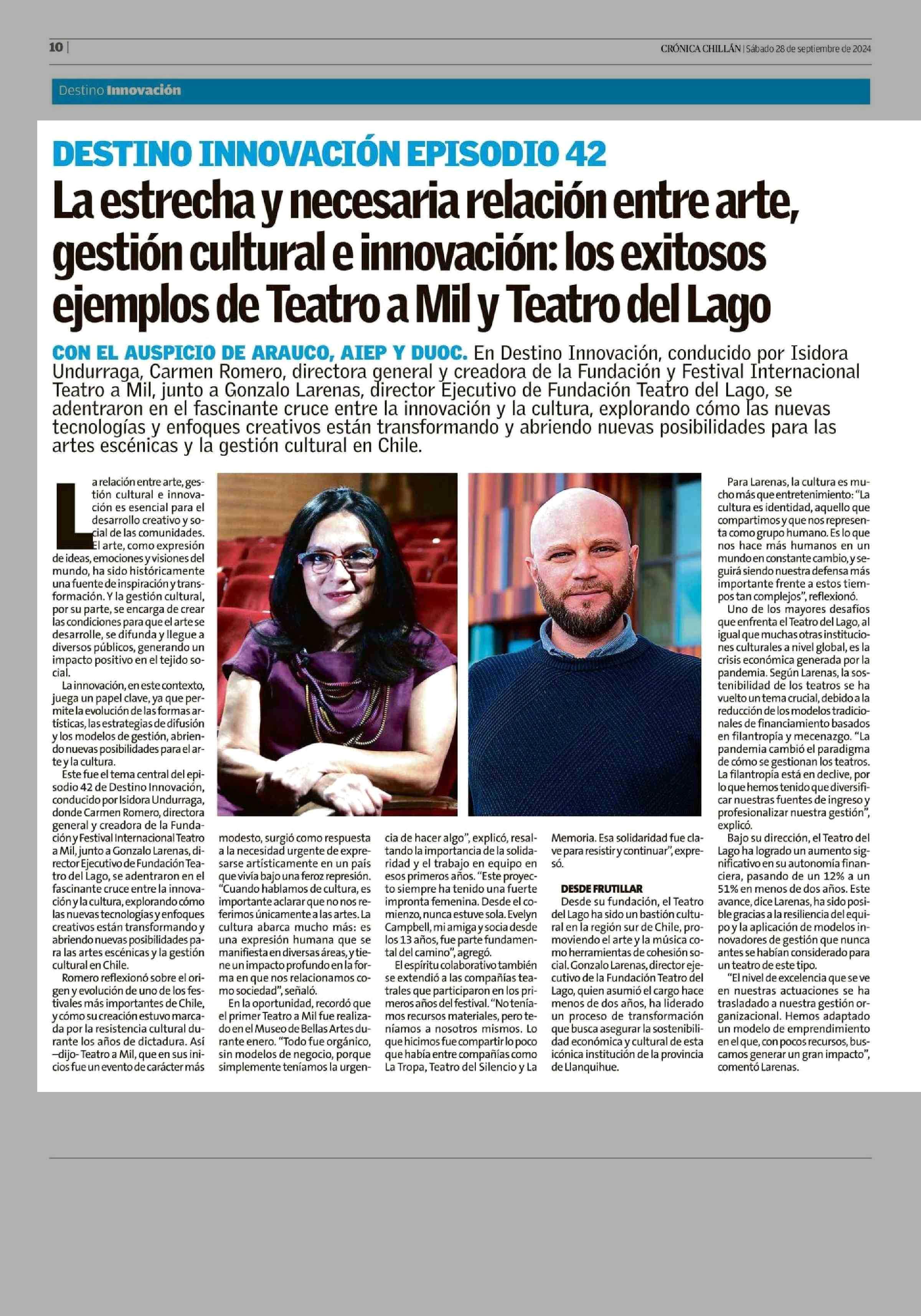 La estrecha y necesaria relación entre arte, ejemplos de Teatro a Mil y Teatro del Lago gestión cultural e innovación: los exitosos 28-09-2024 Crónica de Chillán |