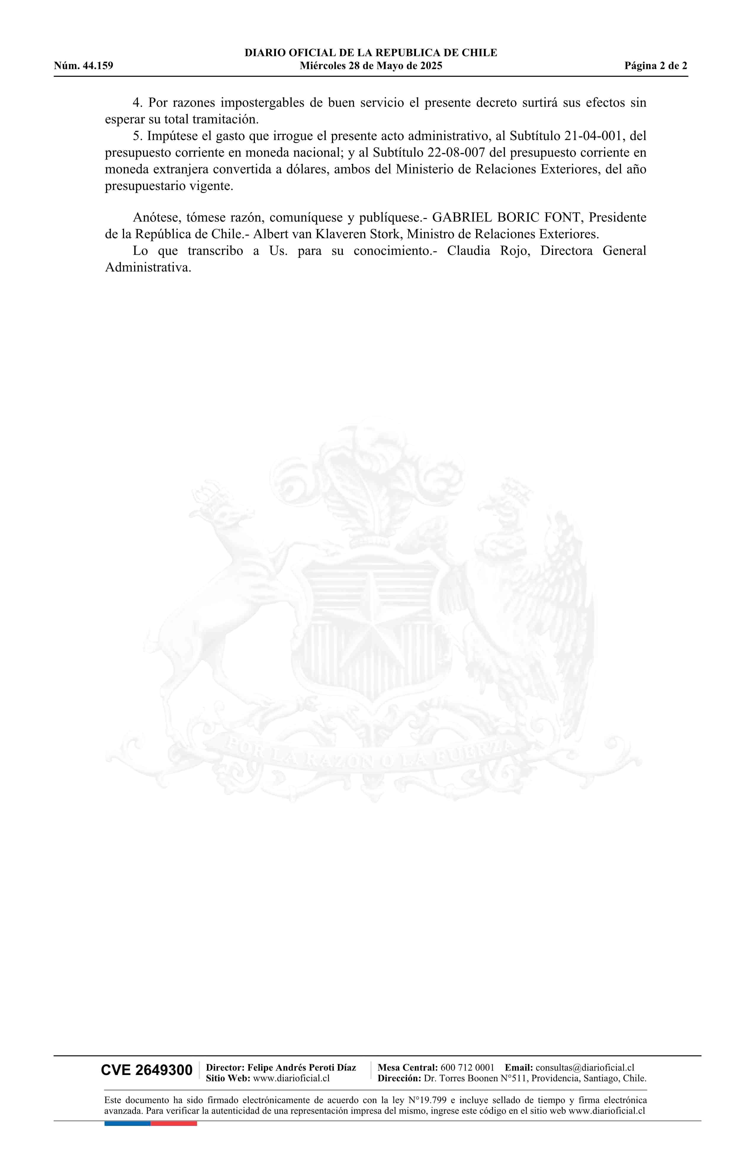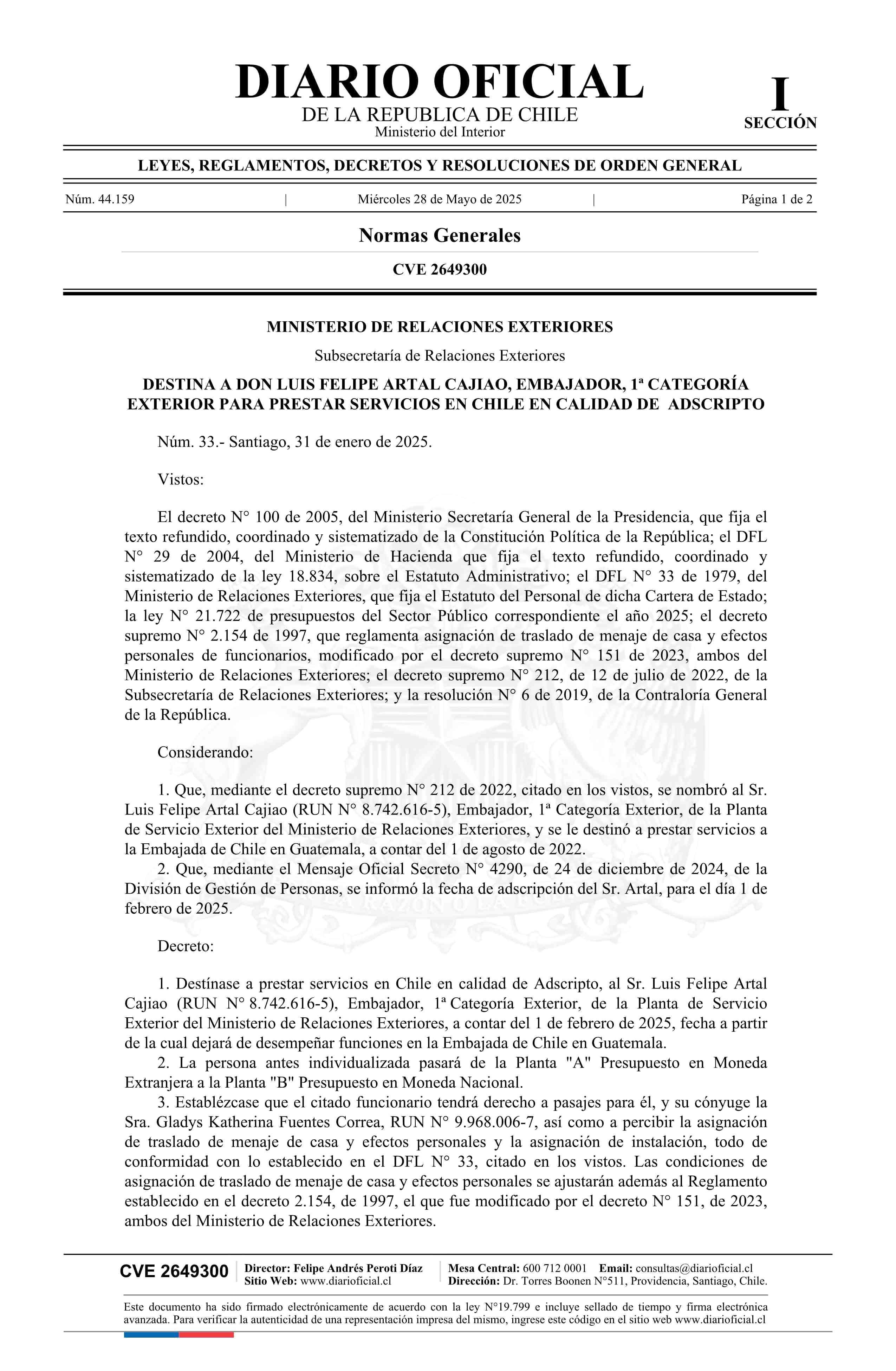 Título: Decreto número 33, de 2025.- Destina a don Luis Felipe Artal Cajiao, Embajador, 1ª Categoría Exterior, para prestar servicios en Chile en calidad de Adscripto