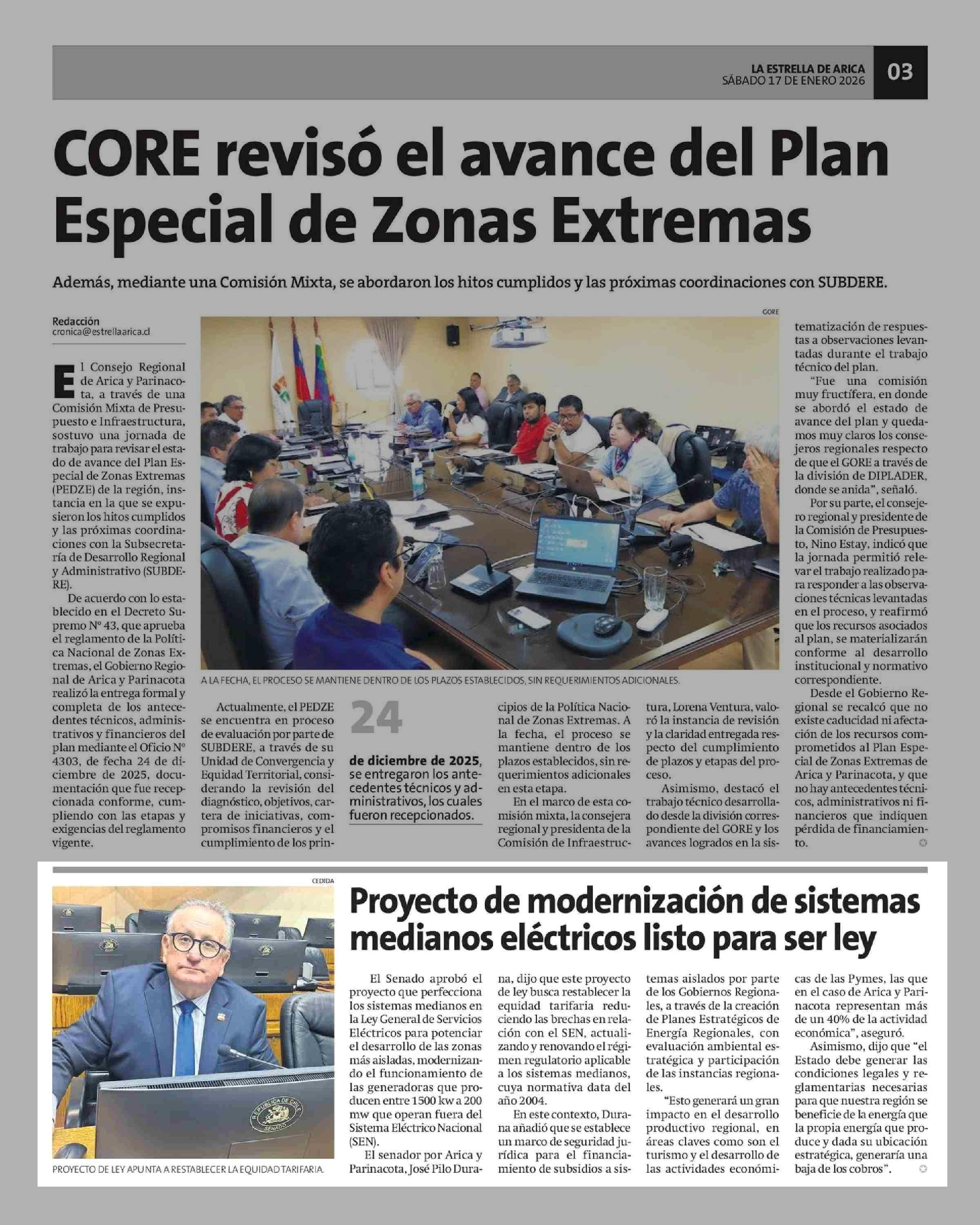 Proyecto de modernización de sistemas medianos eléctricos listo para ser ley 17-01-2026 La Estrella de Arica |