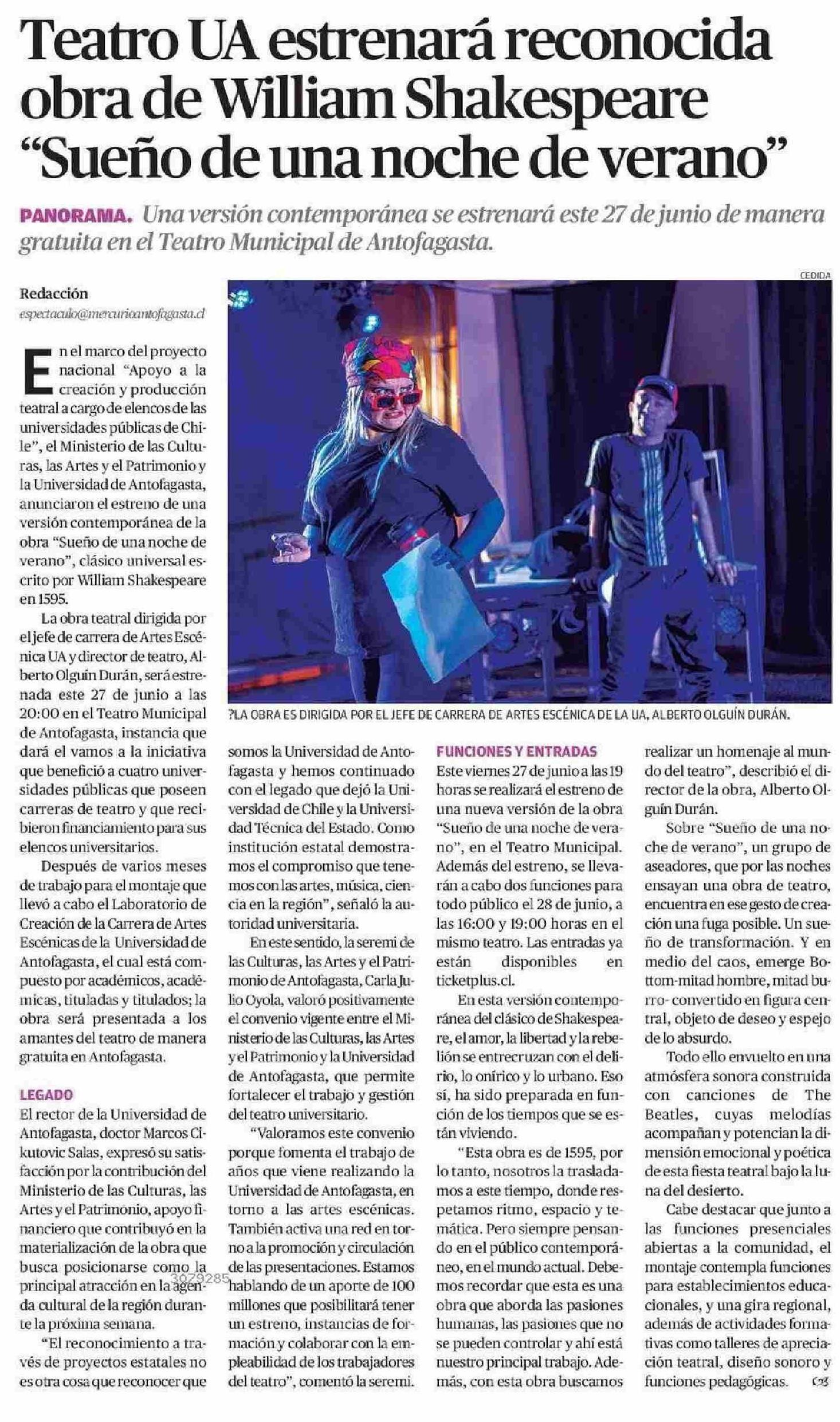 Teatro UA estrenará reconocida obra de William Shakespeare “Sueño de una noche de verano” 25-06-2025 El Mercurio de Antofagasta |